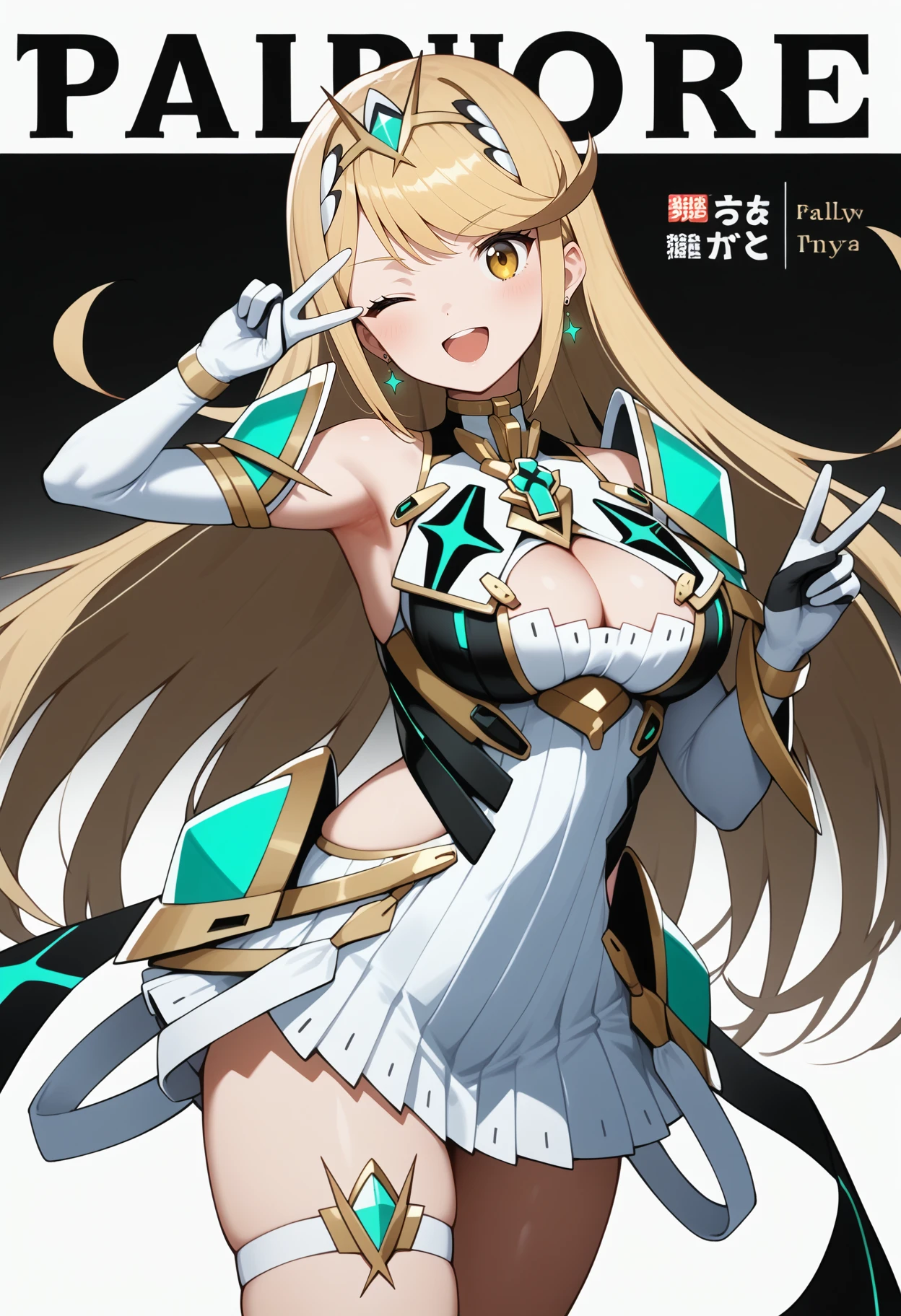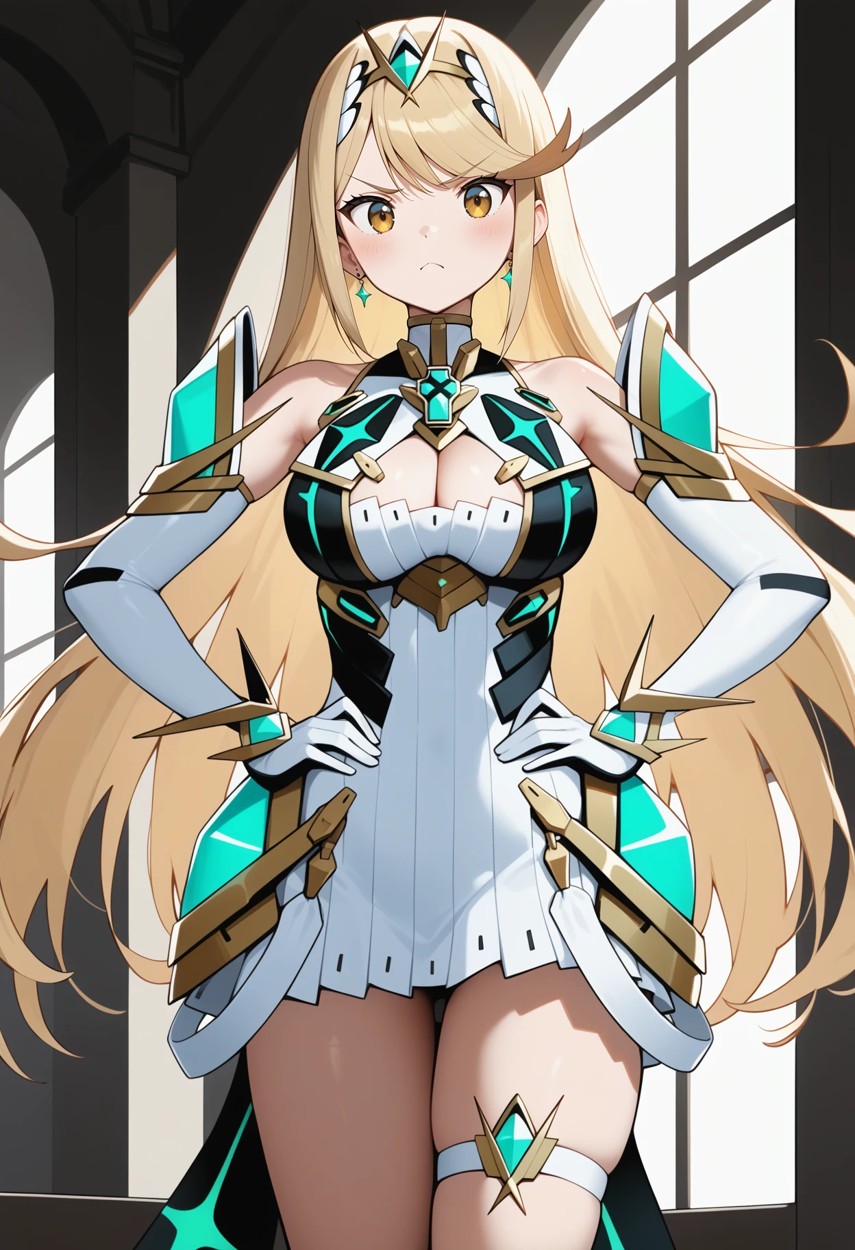 outfit2 (hikari)aahikari, long hair, blonde hair, tiara, swept bangs, earrings, yellow eyes, breasts, jewelry, cleavage cutout, armored dress, short dress, white dress, elbow gloves, white gloves, thigh strap, bare legs