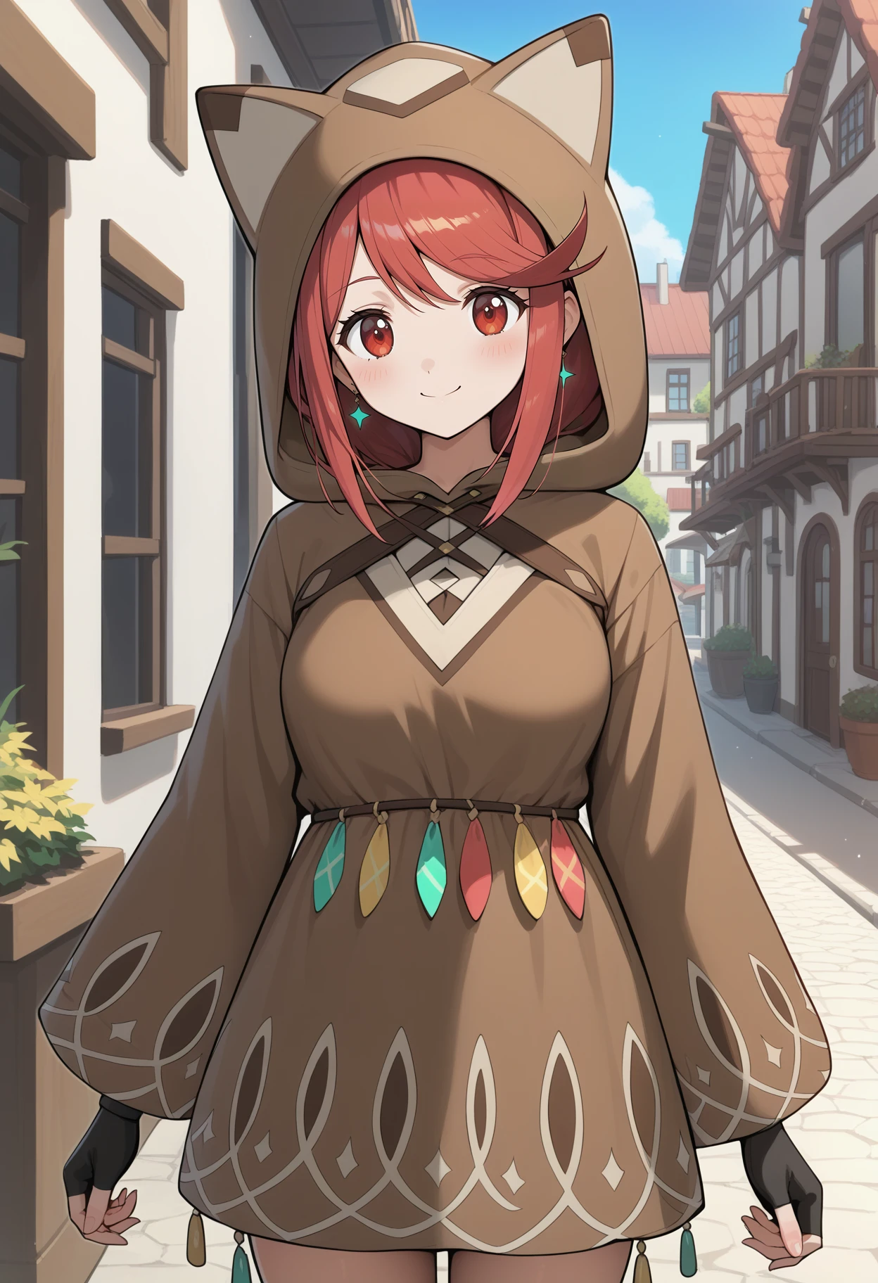 outfit5 (homura)aahomura, red hair, animal hood, animal ears, swept bangs, red eyes, breasts, brown hoodie, brown dress, long sleeves, fingerless gloves