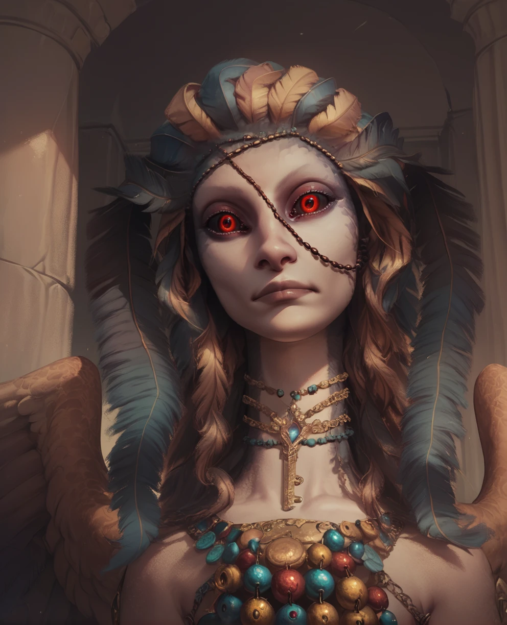 Sphinx, red eyes, or orange eyes, black sclera, - long hair, beads, - feathered wings,