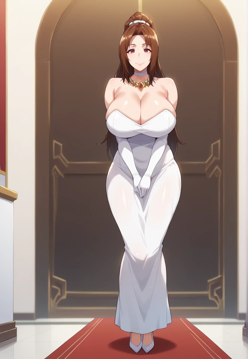 erinadress, white dress, cleavage, choker, necklace, white gloves, elbow gloves, high heels, white footwear
