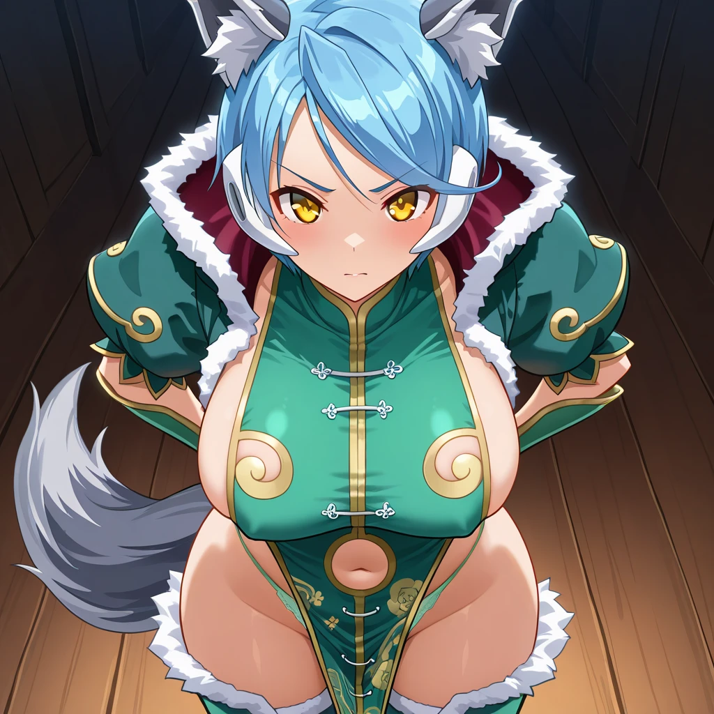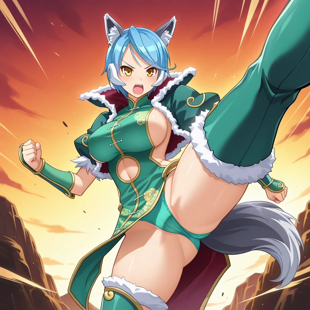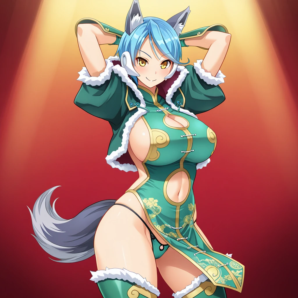 Ew_Selena, 1girl, solo, large breasts, blue hair, short hair, yellow eyes, animal ears, tail, wolf tail, headgear, sideboob, green cheongsam, chinese clothes, keyhole cutout, panties, high slit, fur trim, open clothes, long gloves, green gloves, arm guards, green boots, thighhighs, thigh boots, high heels