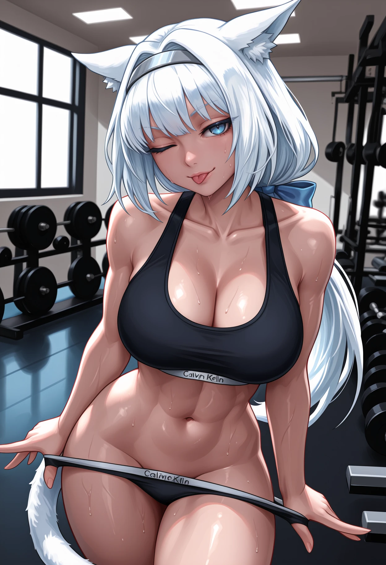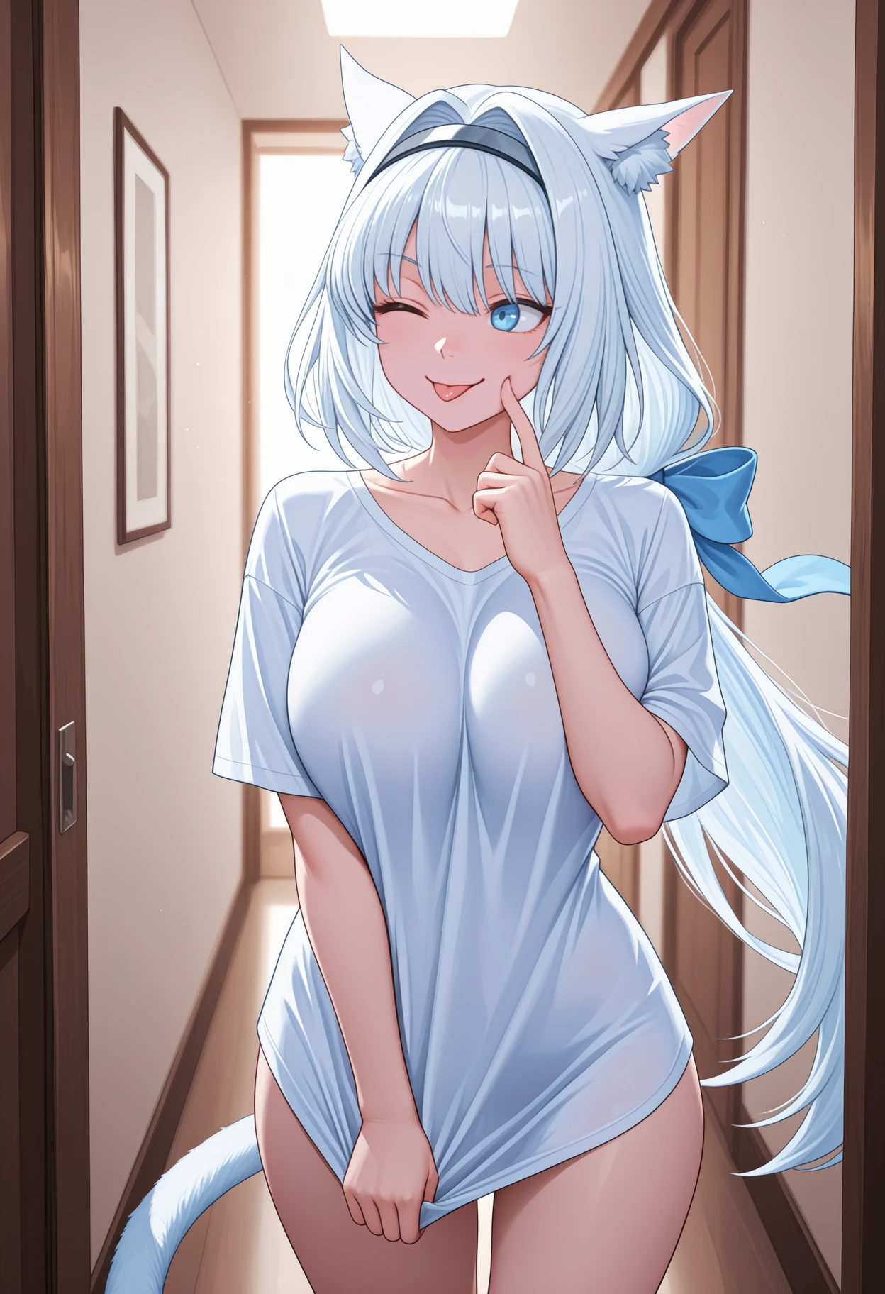 cat tail, long hair, white hair, low ponytail, hair bow, blue bow, hairband, animal ears, animal ear fluff, blue eyes, large breasts