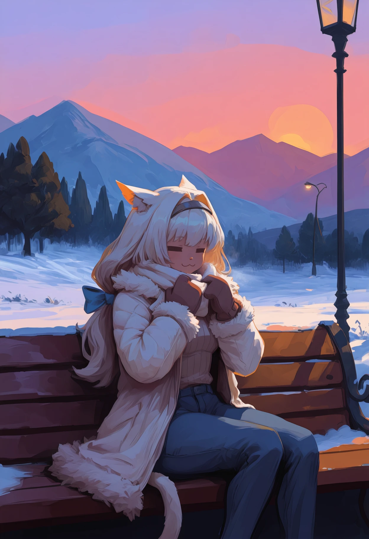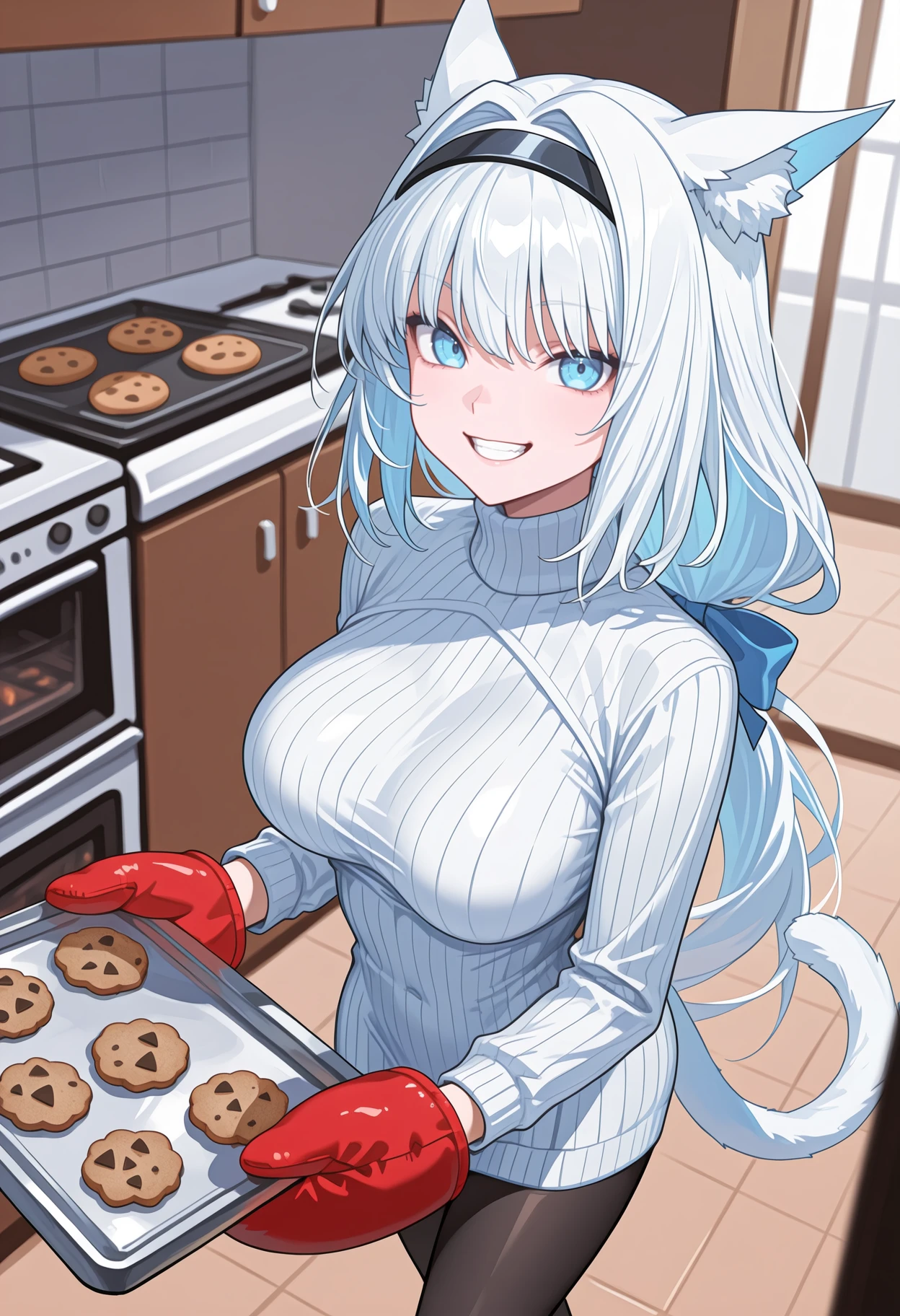 Appearance: cat tail, long hair, white hair, low ponytail, hair bow, blue bow, hairband, animal ears, animal ear fluff, blue eyes, large breasts