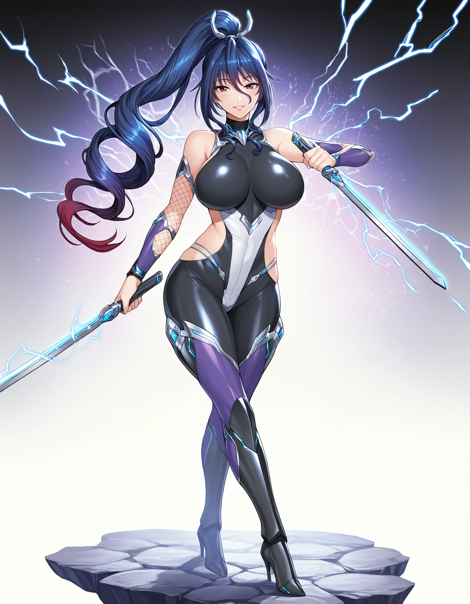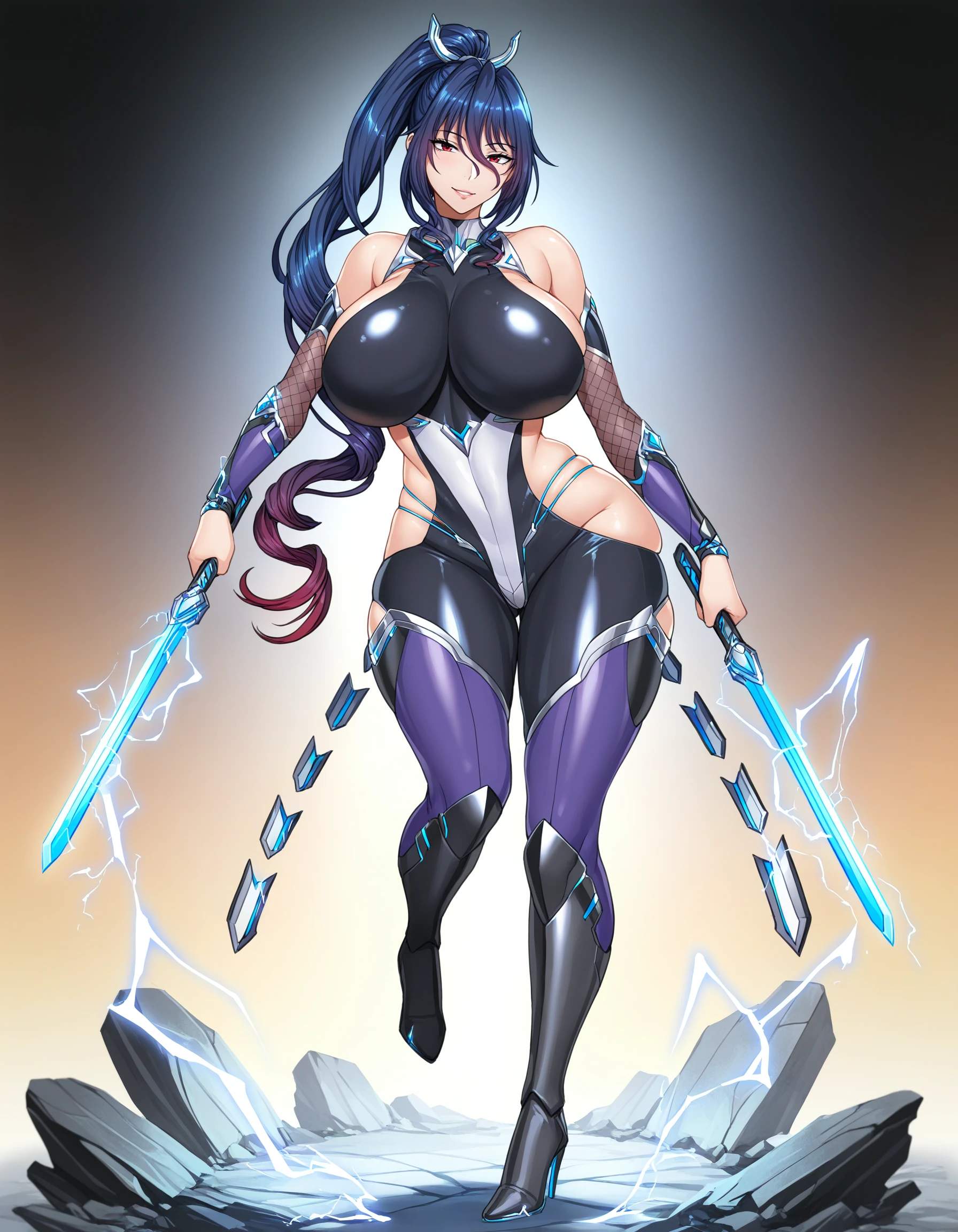 holding sword, dual wielding, glowing, electricity