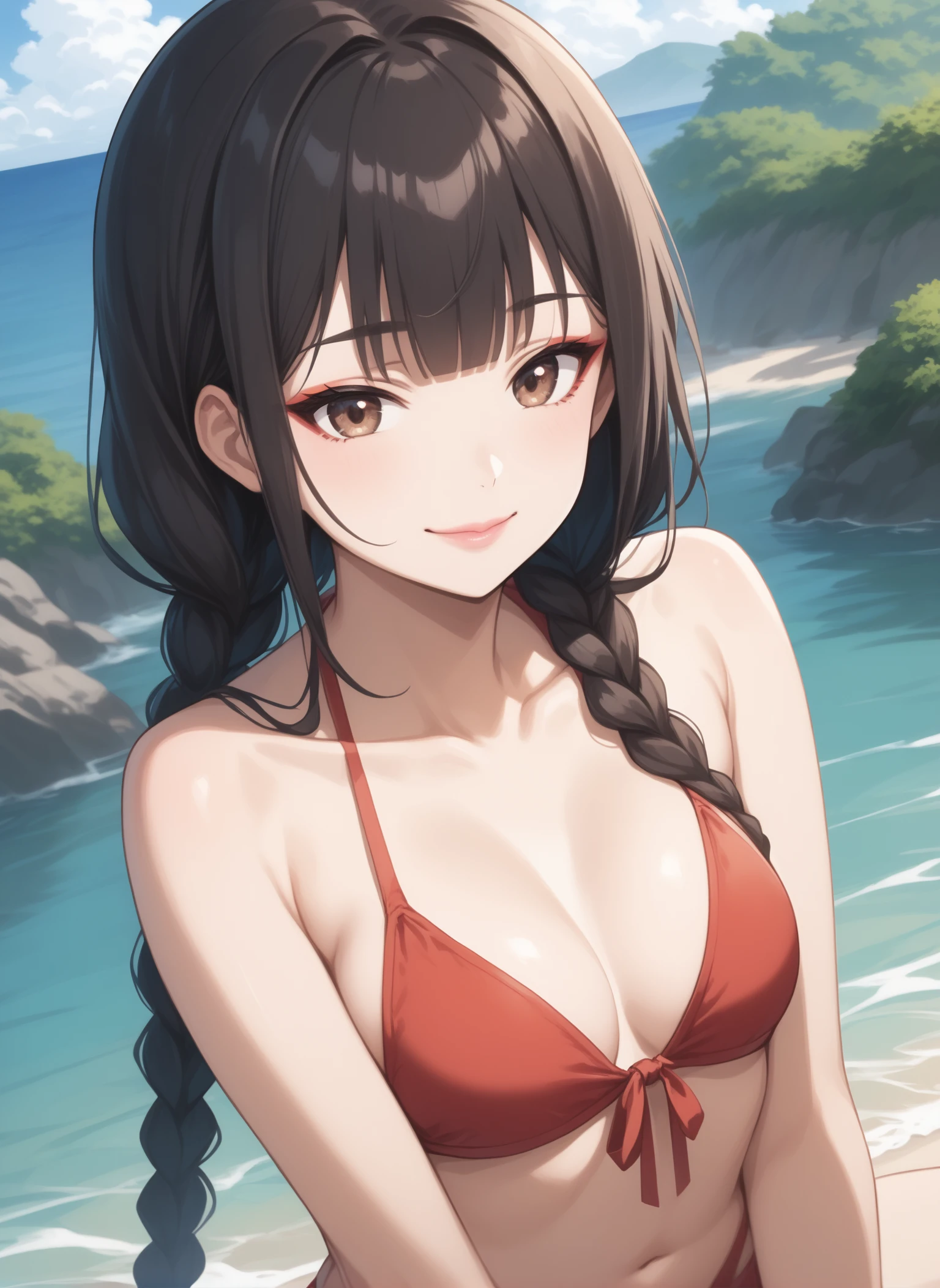 black hair, twin braids, blunt bangs, hair over shoulder, very long hair, makeup, brown eyes