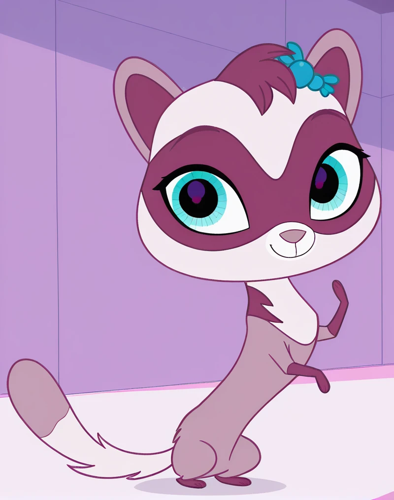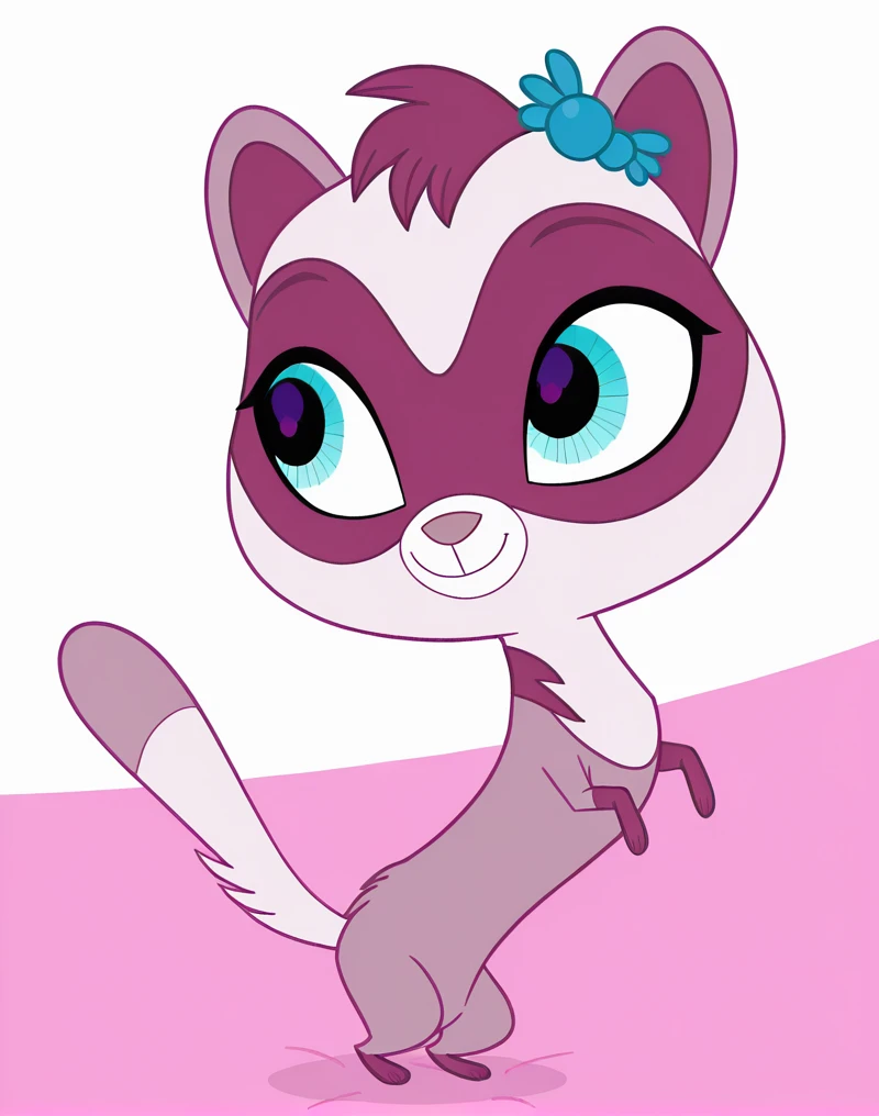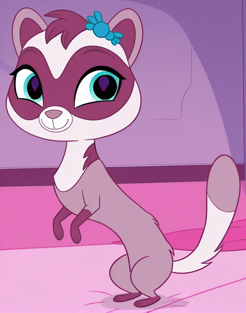 JebbieLPS, Ferret, ferret ears, ferret tail, pink fur, three tone fur, cyan eyes, pink nose, tail, furry, furry female, 1girl, pink hair, hair ornament, semi-anthro
