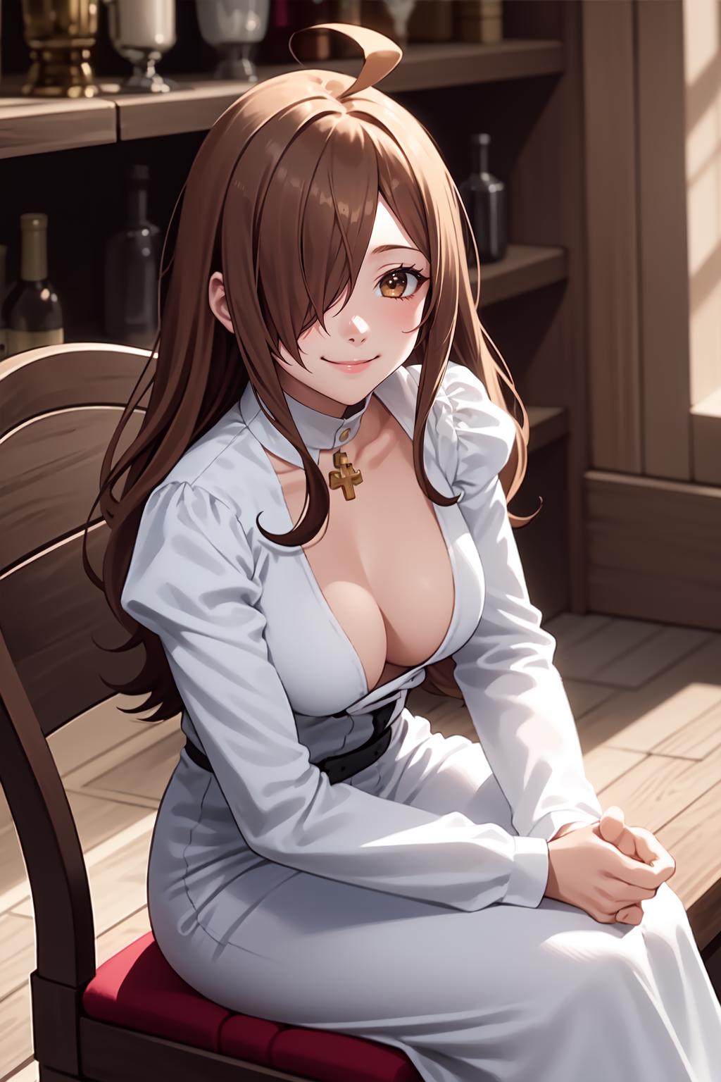 • brown hair, long hair, hair over one eye, ahoge, brown eyes for appearance