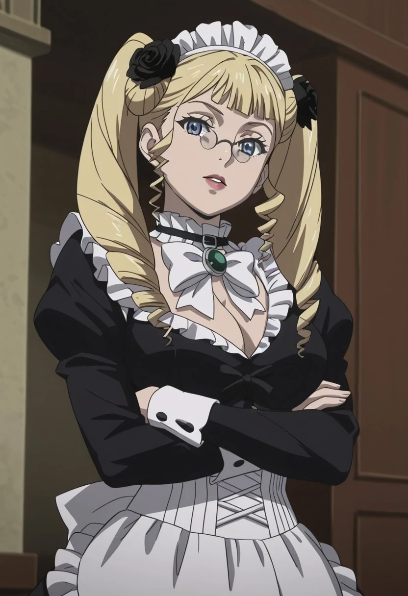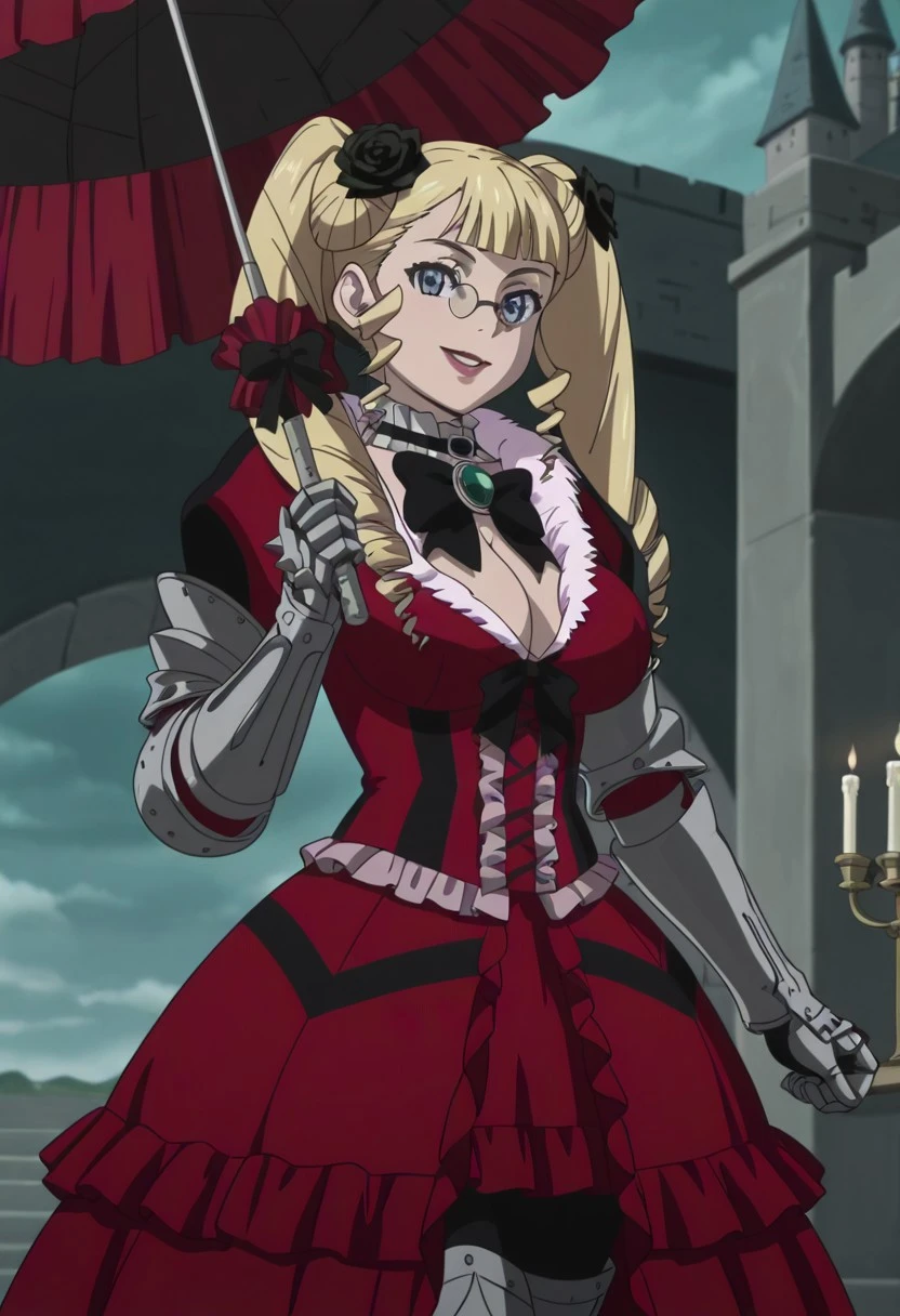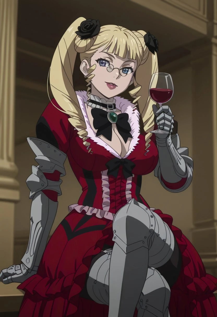 1 girl, solo, IreiaKitty, blonde hair, long hair, blue eyes, twintails,blunt bangs, drill hair, black flower in hair, hair ornament, glasses, lipstick, red dress, gothic dress, fur trim, frills, necklance black ribbon, puffy sleeves, pantyhose, gauntlets, armor legs