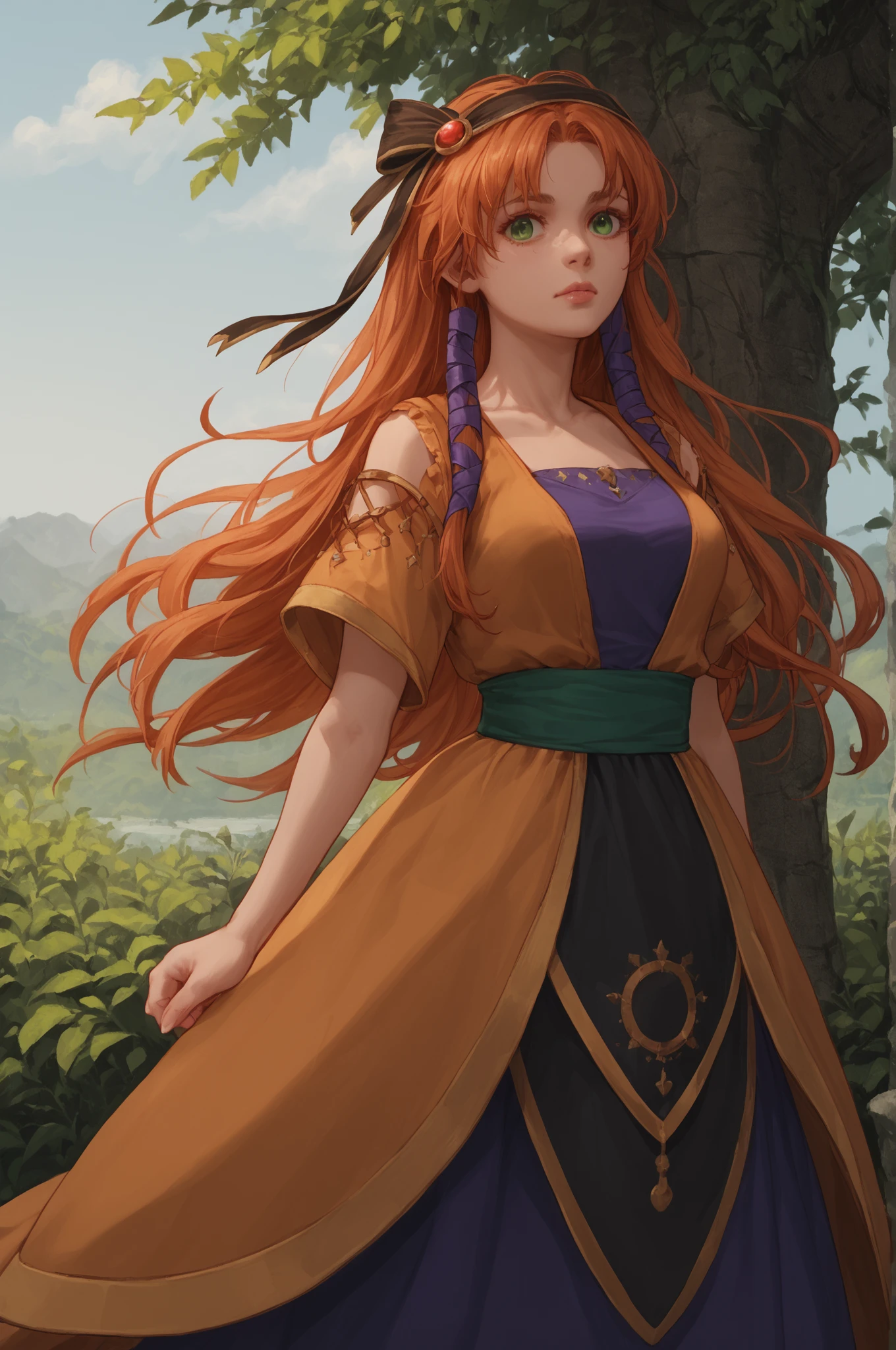Example Prompt 1girl, <lora:LeenaCC-Pony:0.99> lena_cc, green_eyes, long_hair, ribbon, std_outfit, dress