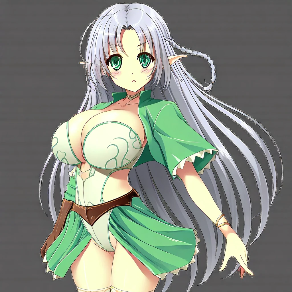 grey hair, very long hair, braid, parted bangs, green eyes, large breasts, elf, pointy ears,