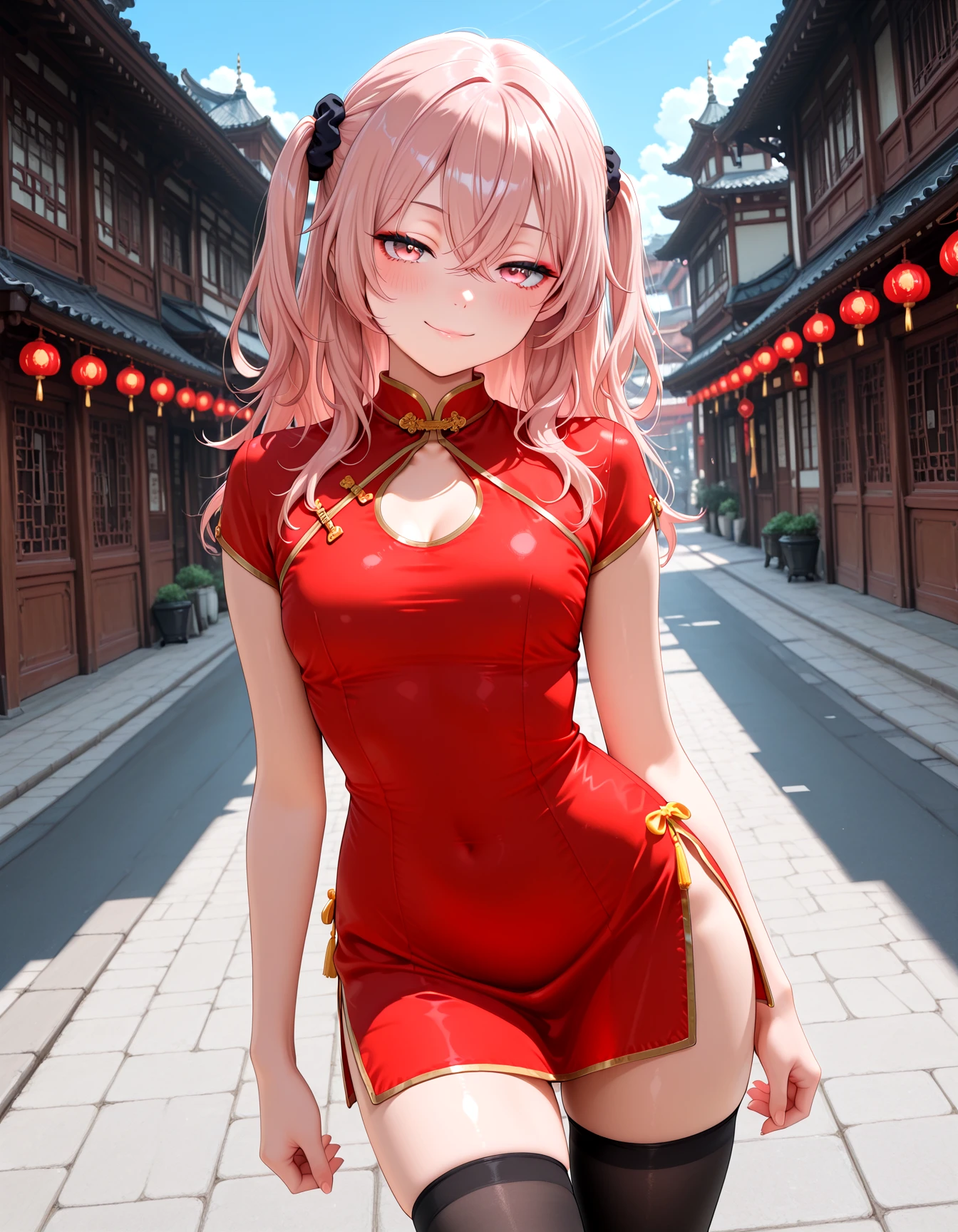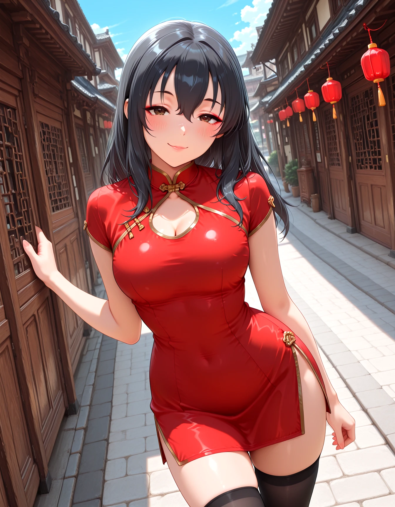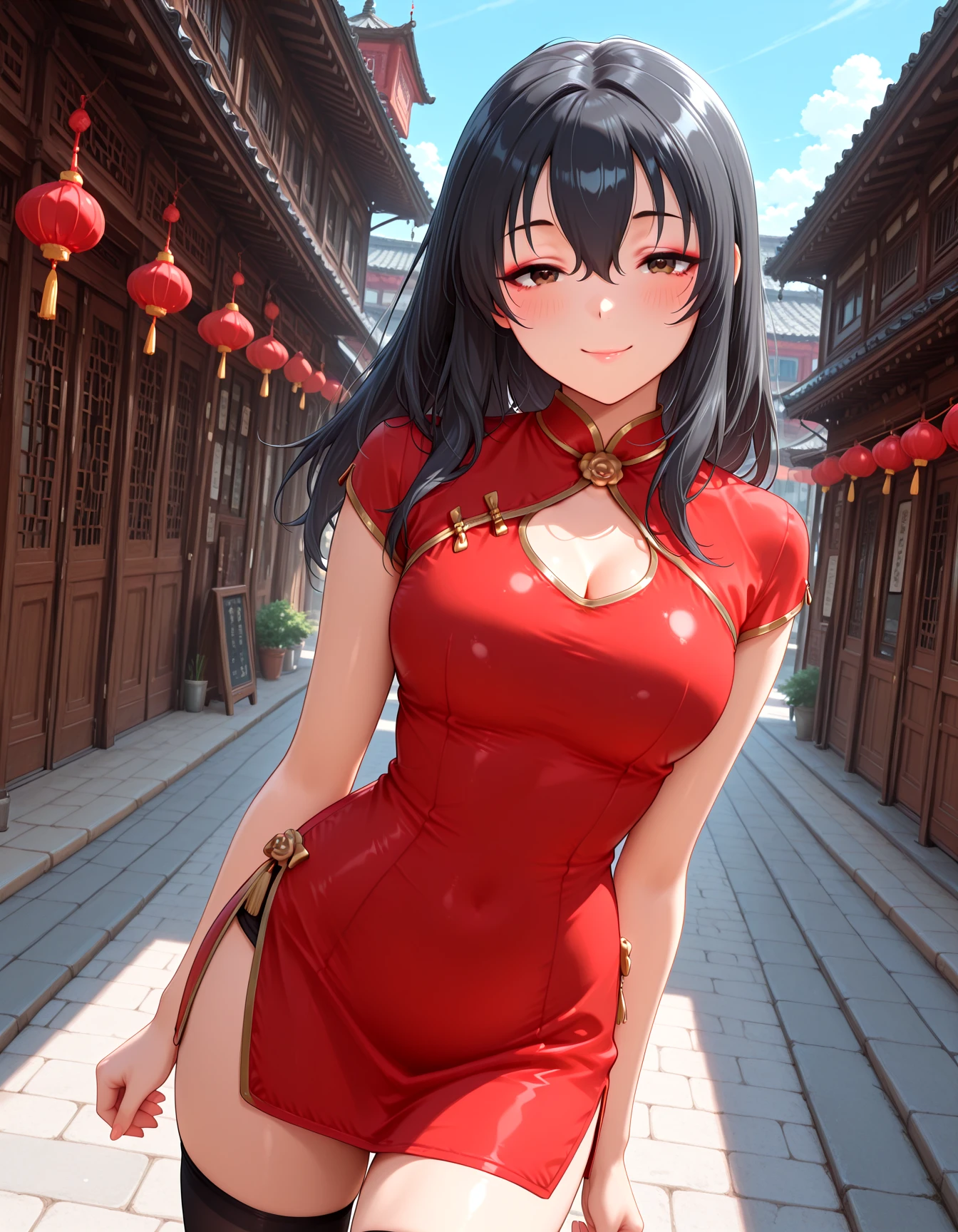 KURECH, chinese clothes, china dress, red dress, plain red dress, clothing cutout, cleavage cutout, short dress, black thighhighs, side slit, zettai ryouiki