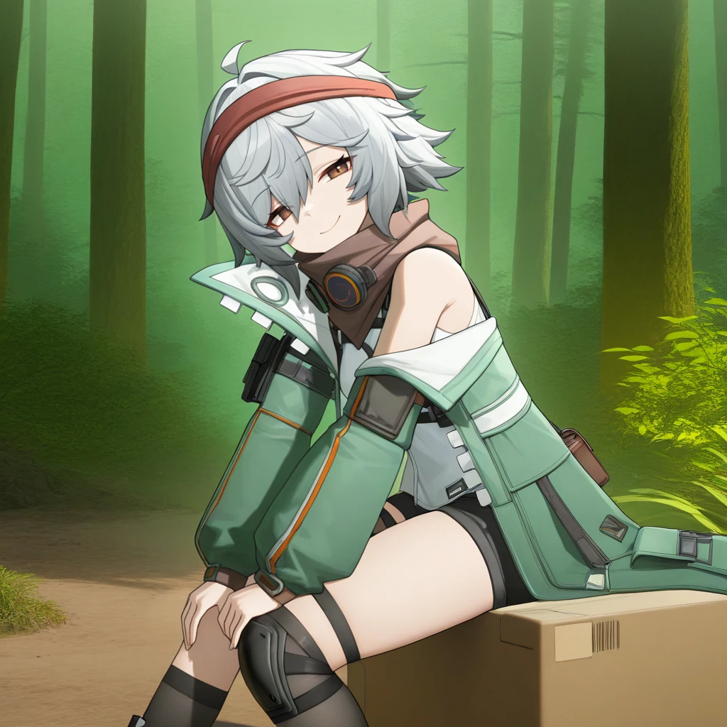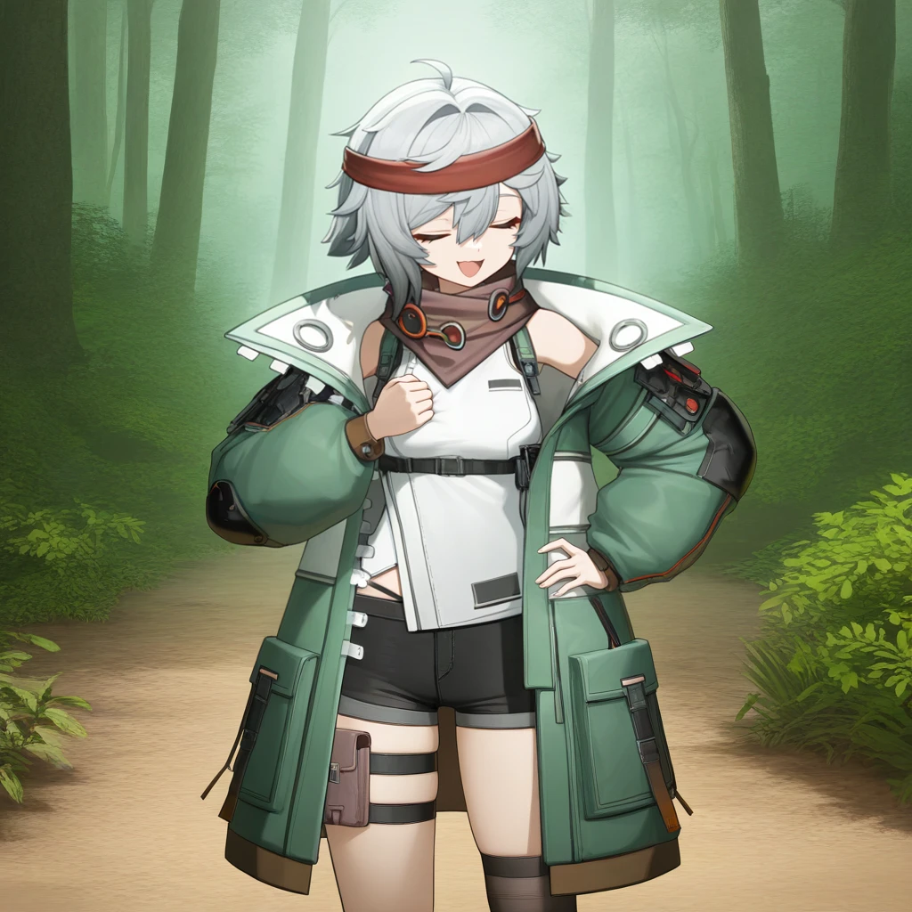 Mch_Def, short shorts, black shorts, green coat, open coat, tactical clothes, sleeveless shirt, white shirt, harness, brown scarf, single off shoulder, puffy long sleeves, thigh pouch, headband, black over-kneehighs, single knee pad, single over-kneehigh, boots,Dorm Outfit:
