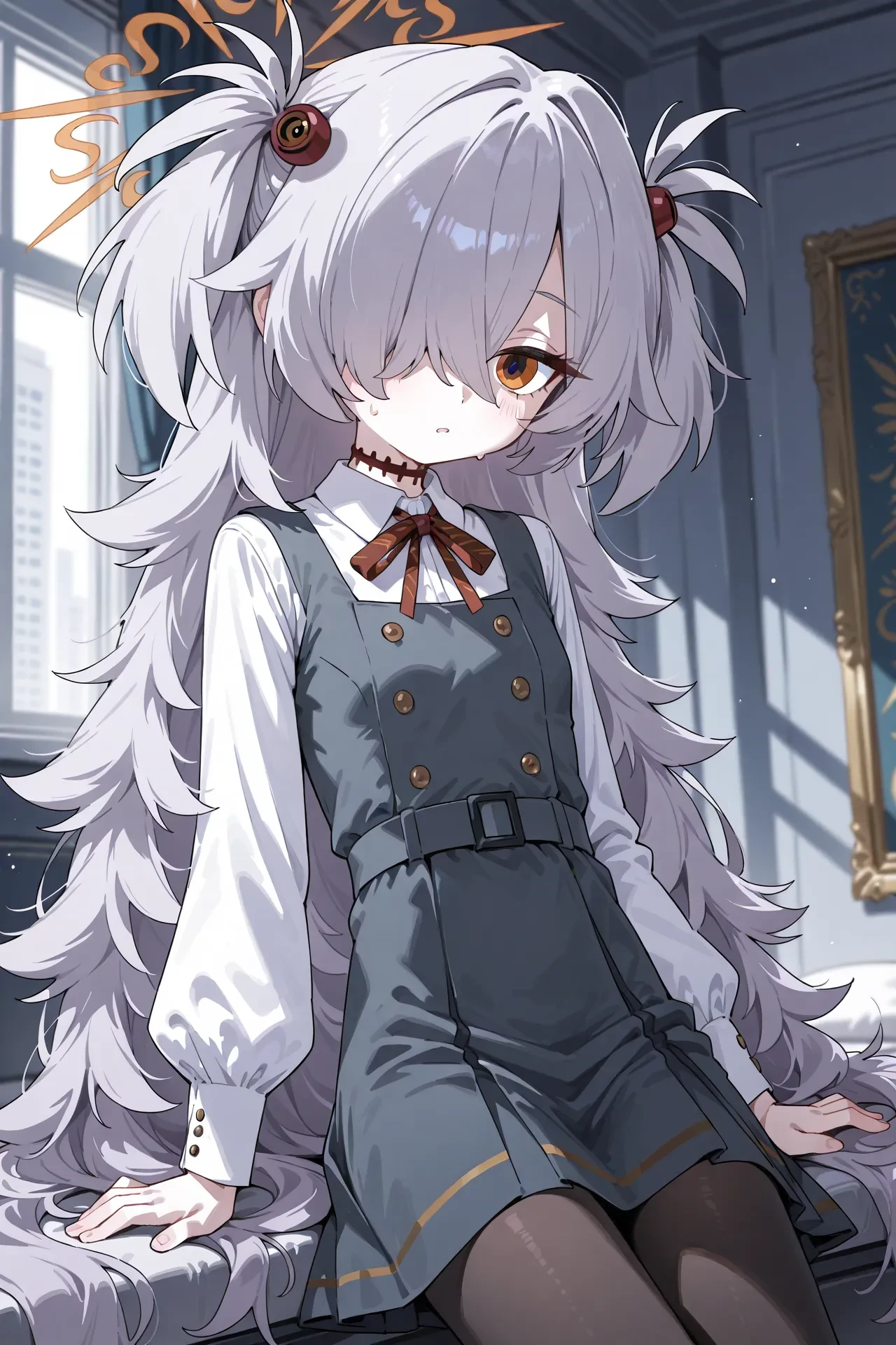 short hair,long hair,very long hair,hair over one eye,white hair,grey hair,two side up,messy hair,red eyes,hair ornament,orange halo,