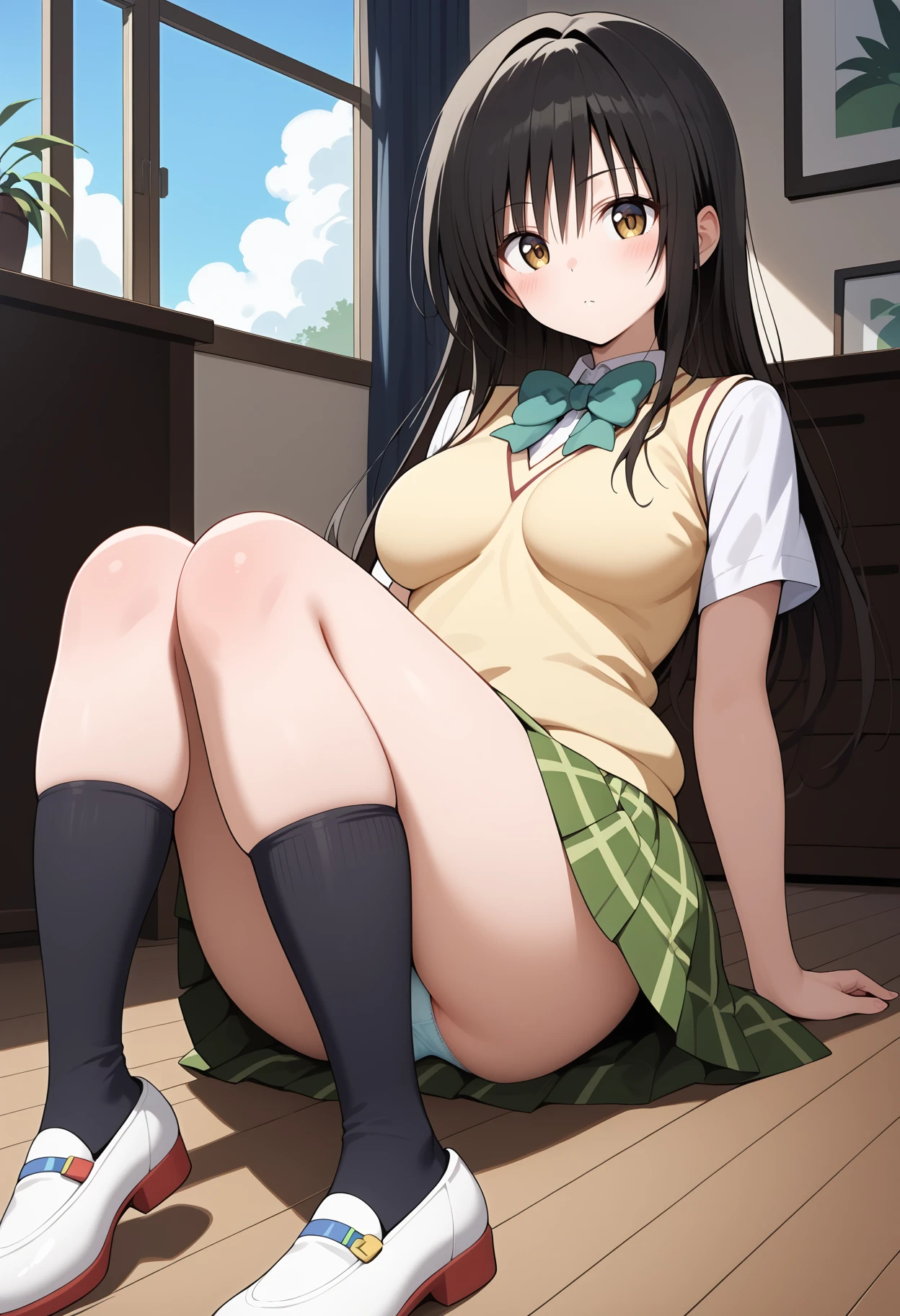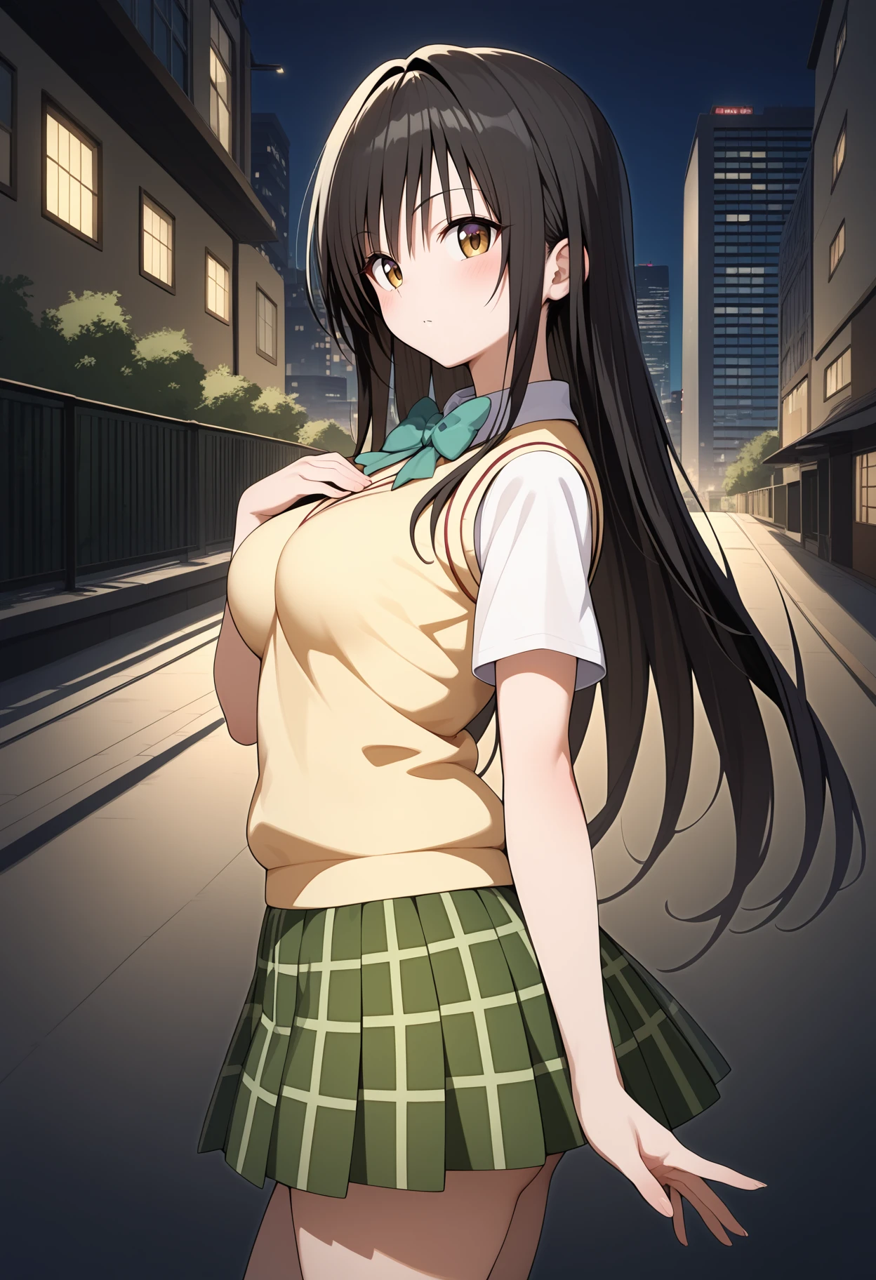 outfit1aayui, long hair, black hair, gradient eyes, breasts, green bowtie, sweater vest, yellow sweater, short sleeves, plaid skirt, green skirt