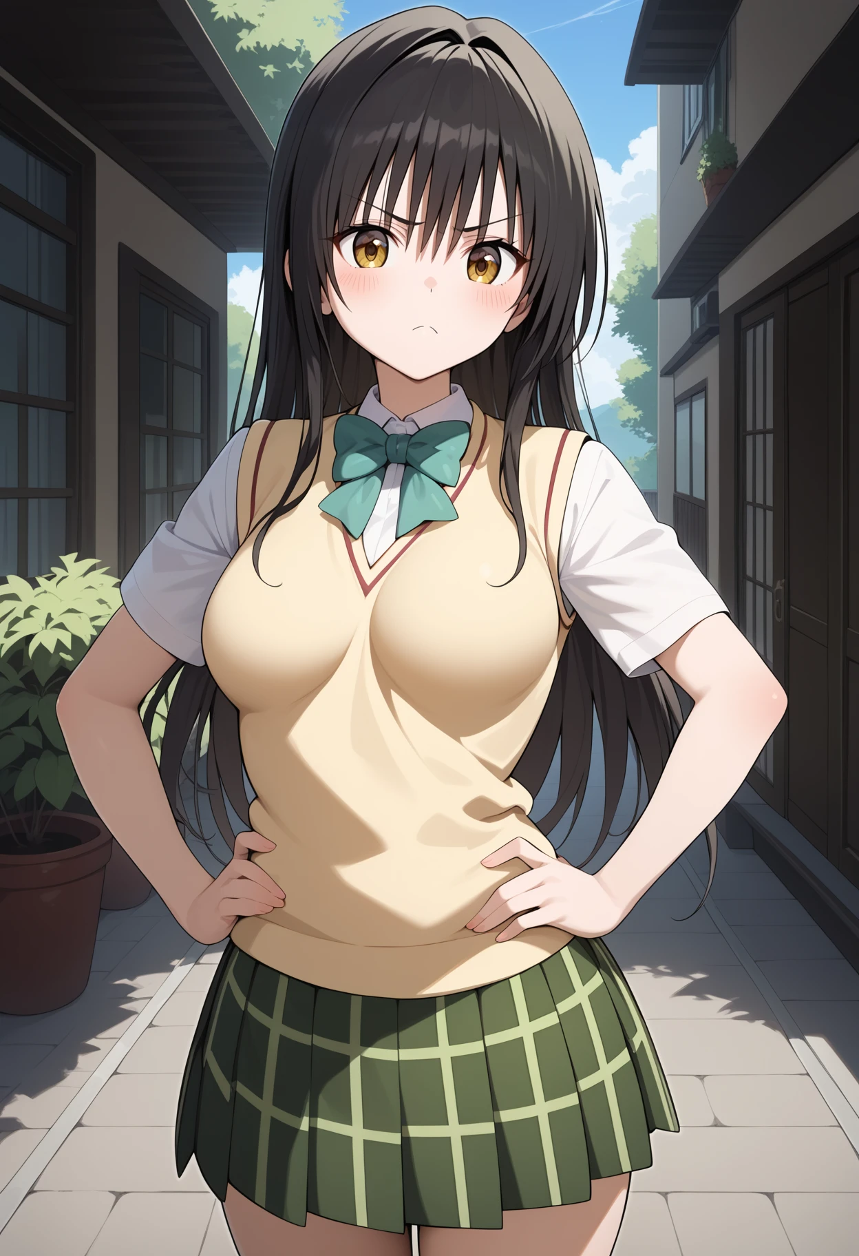 aayui, long hair, black hair, gradient eyes, breasts, green bowtie, sweater vest, yellow sweater, short sleeves, plaid skirt, green skirt