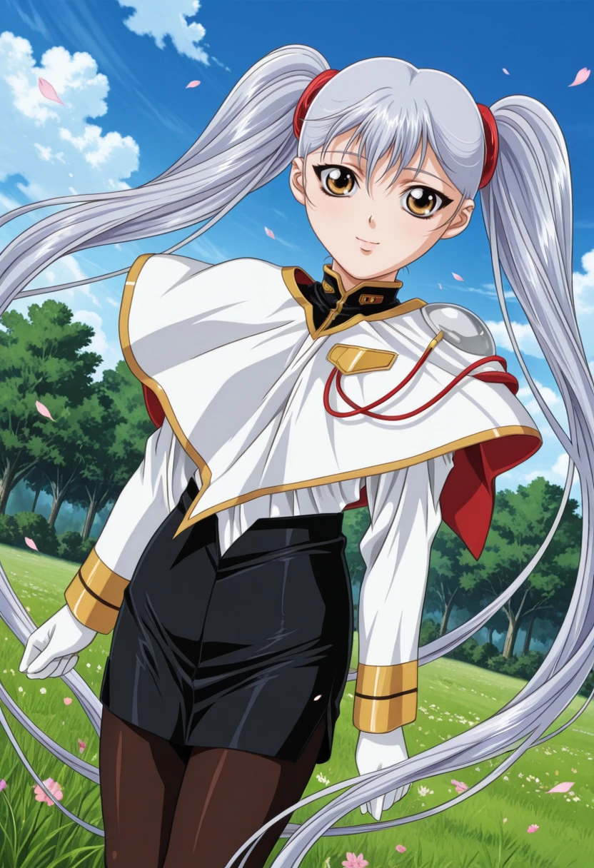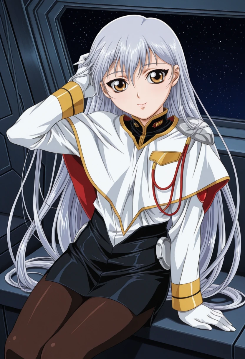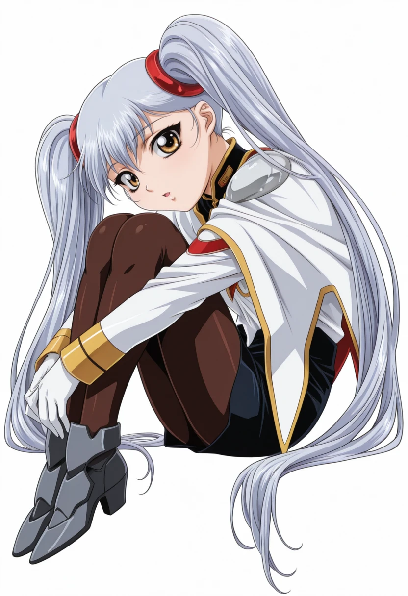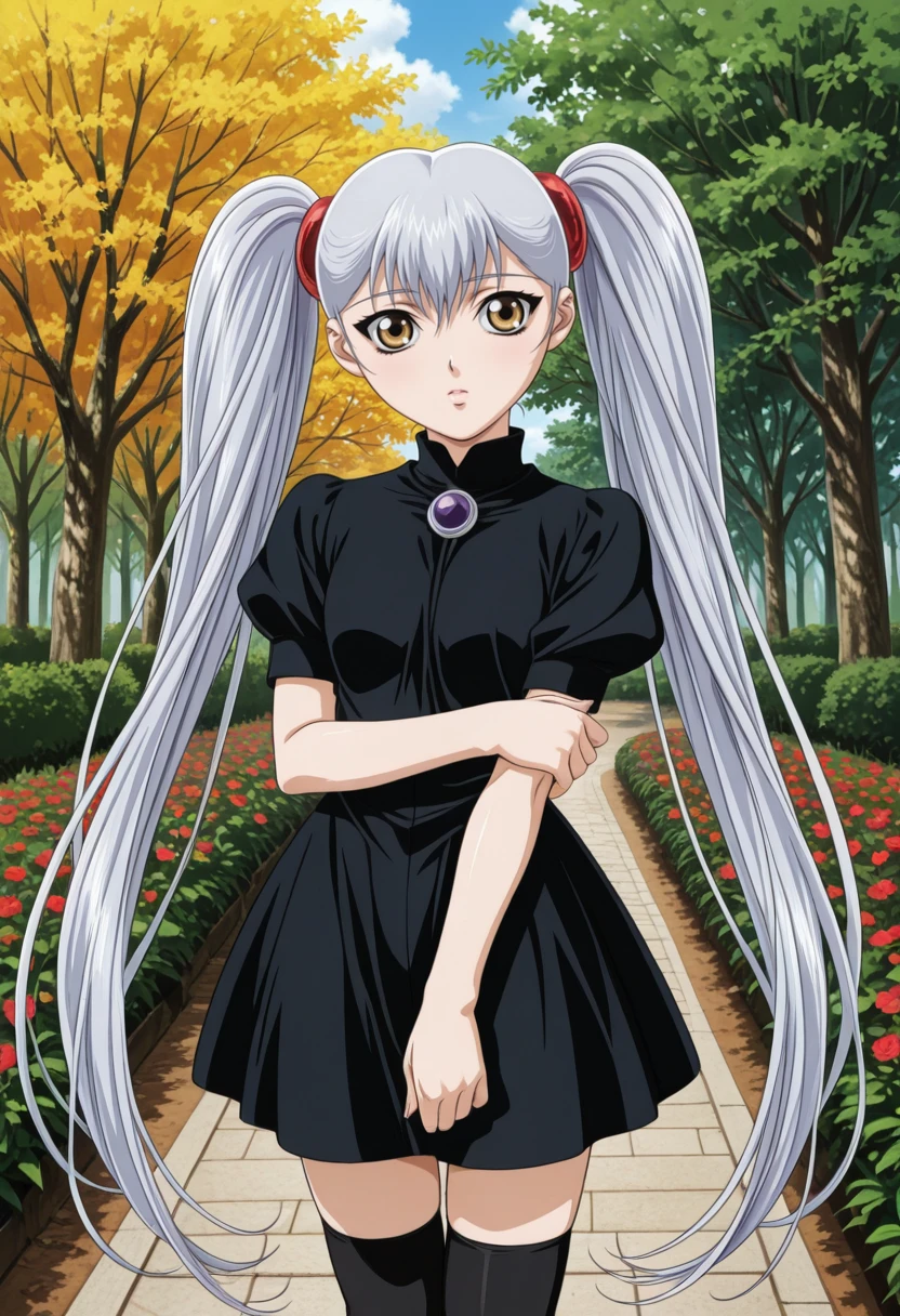 gkjbruri, silver hair, very long hair, hair rings, yellow eyes, twintails, ruri2def, capelet, white shirt, long sleeves, brown pantyhose, white gloves, grey footwear, high heels,