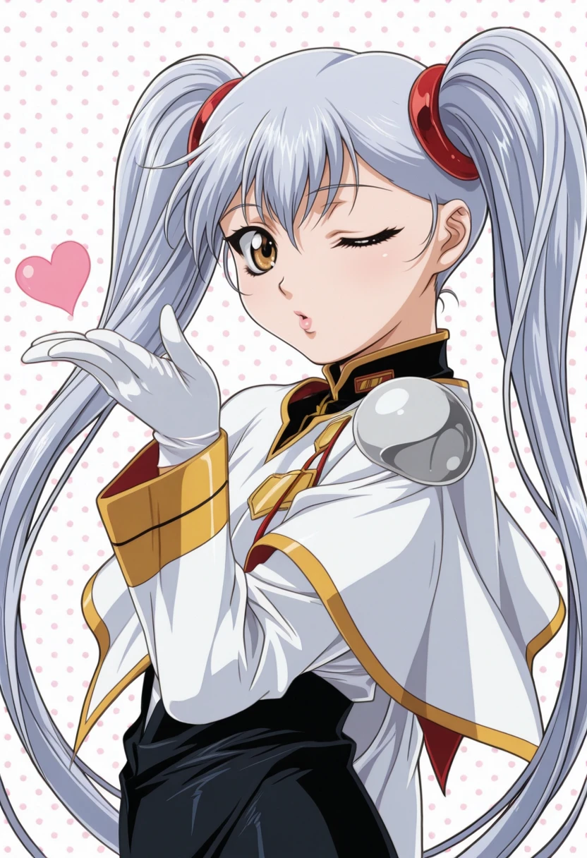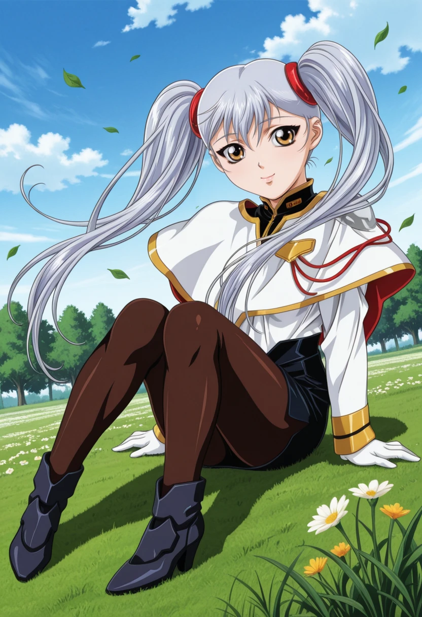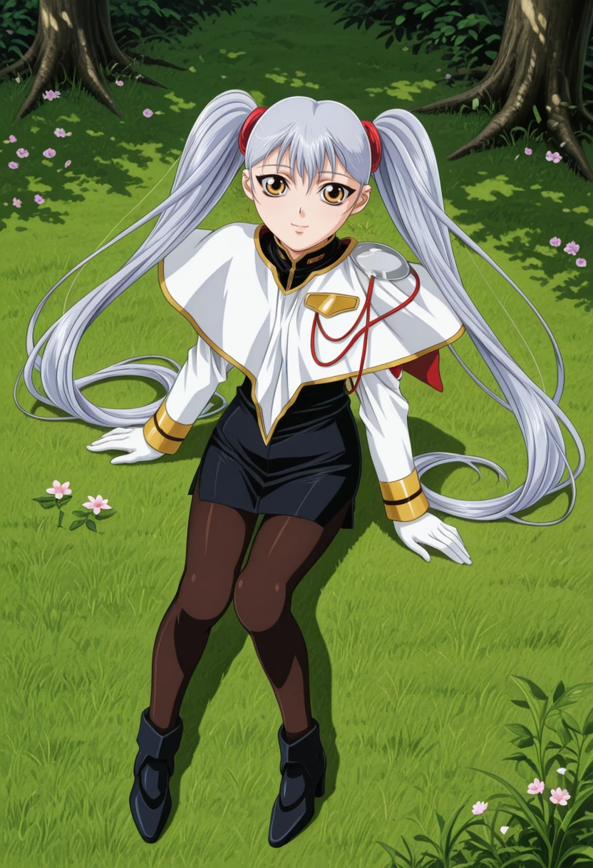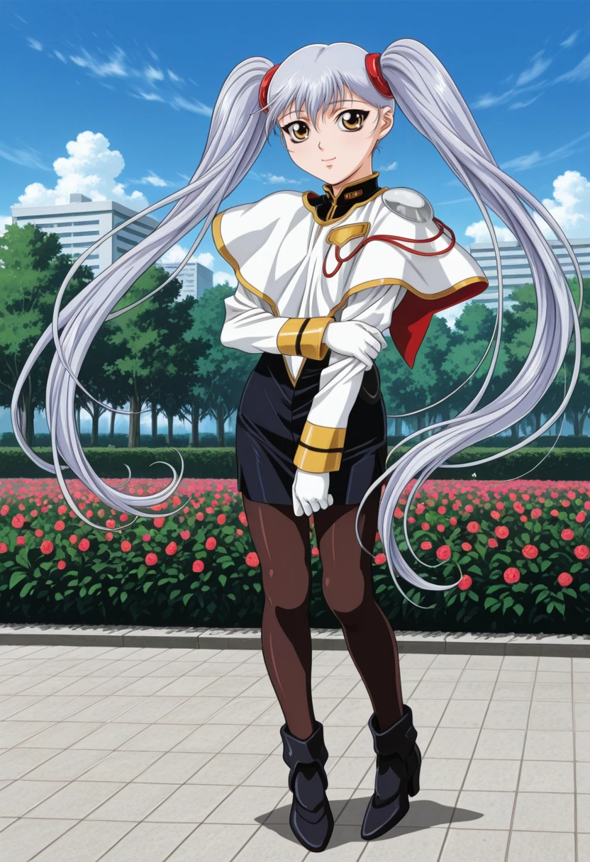 gkjbruri, silver hair, very long hair, hair rings, yellow eyes, twintails, ruri2def, capelet, white shirt, long sleeves, brown pantyhose, white gloves, grey footwear, high heels,