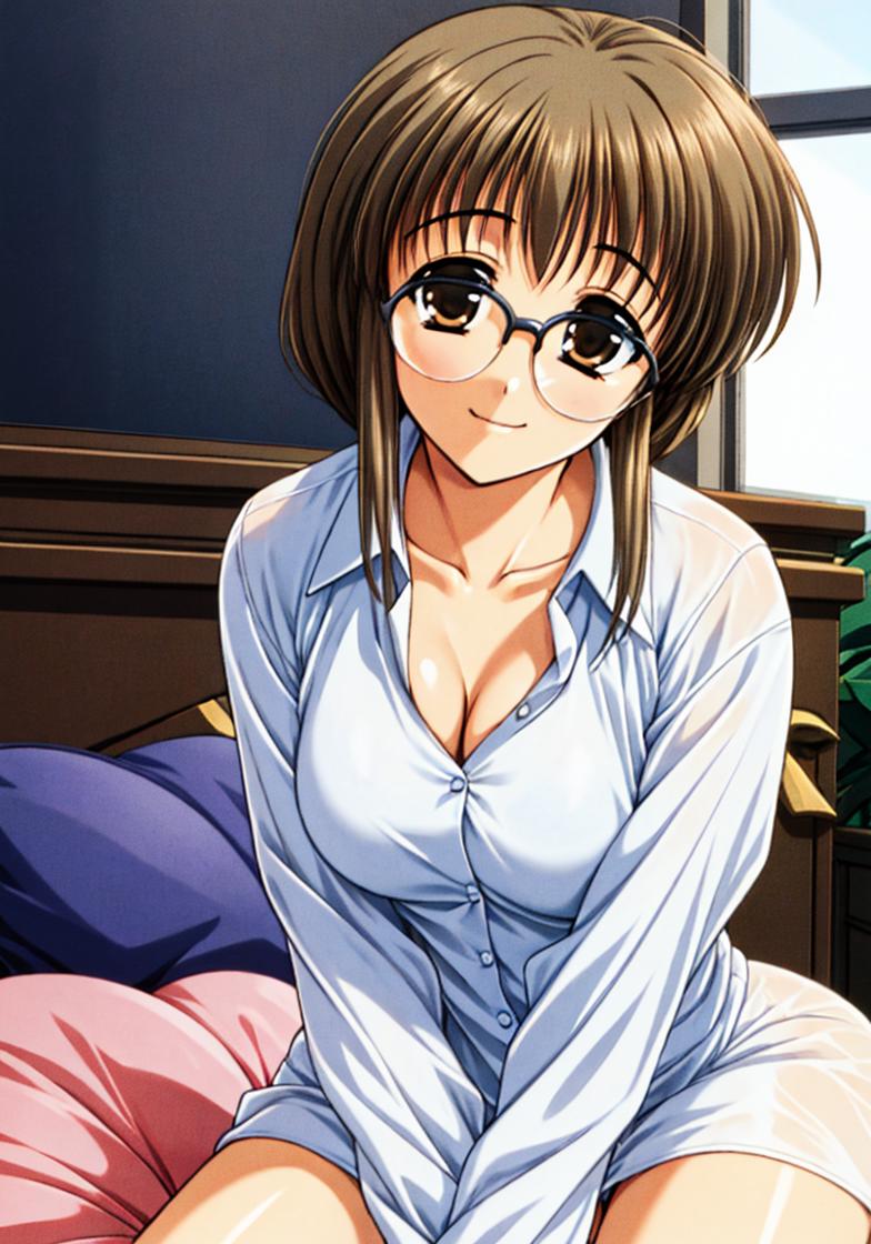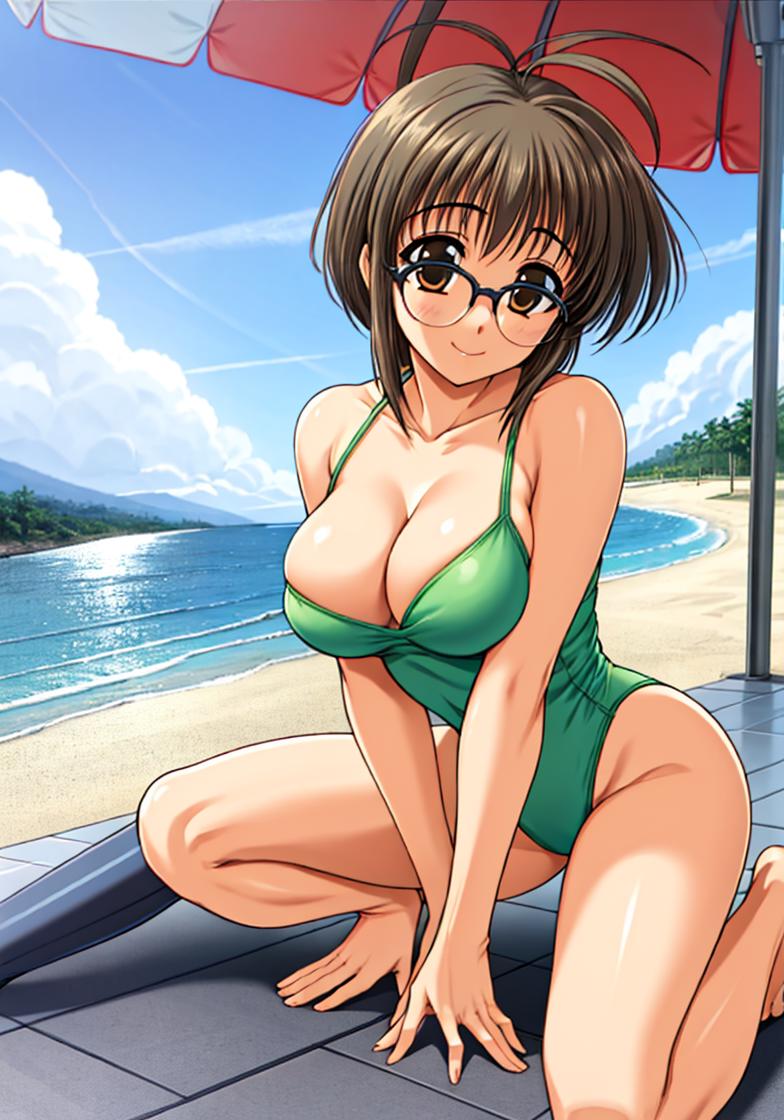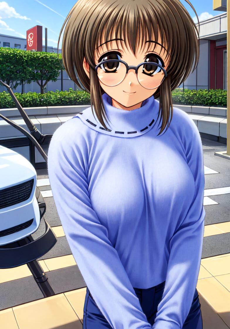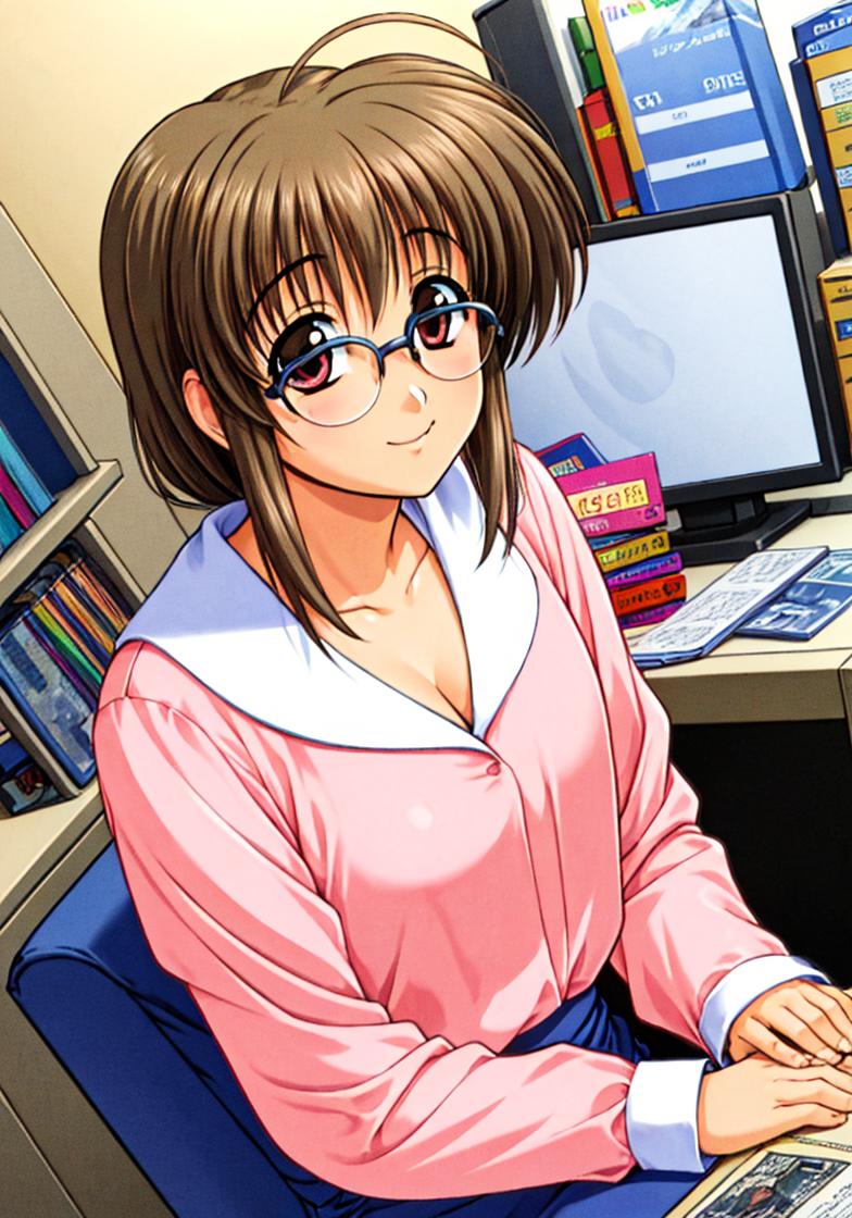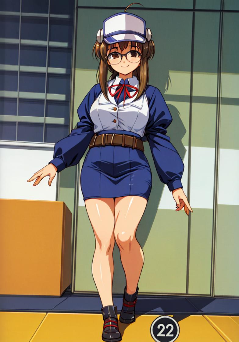 minami_makimura,comic_party,comic_party_uniform,skirt,visor_cap,brown_hair, large breast,24 year old girl,ahoge,shoes,glasses,long_sleeves,vest,hat, microphone,belt,