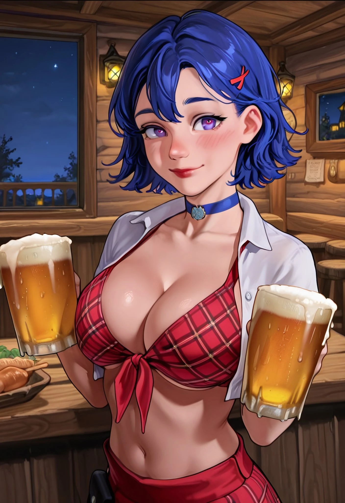 emily_sdv, blue hair, short hair, red lipstick, violet eyes, red hairclip, blue choker, large breasts,