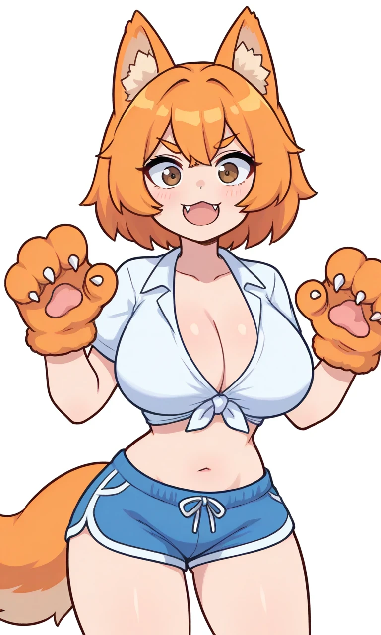Azzy, 1girl, orange hair, short hair, brown eyes, deportive shorts, blue shorts, large breasrs, cleavage, very large breasts, dog ears, dog ears up, navel, colarbone, white shirt, crop top, fur trim, midriff, fangs, short sleeves, tied shirt, paw gloves