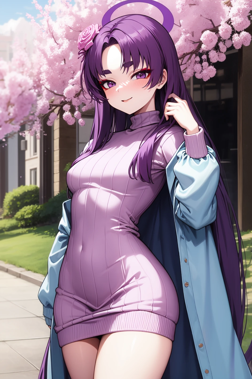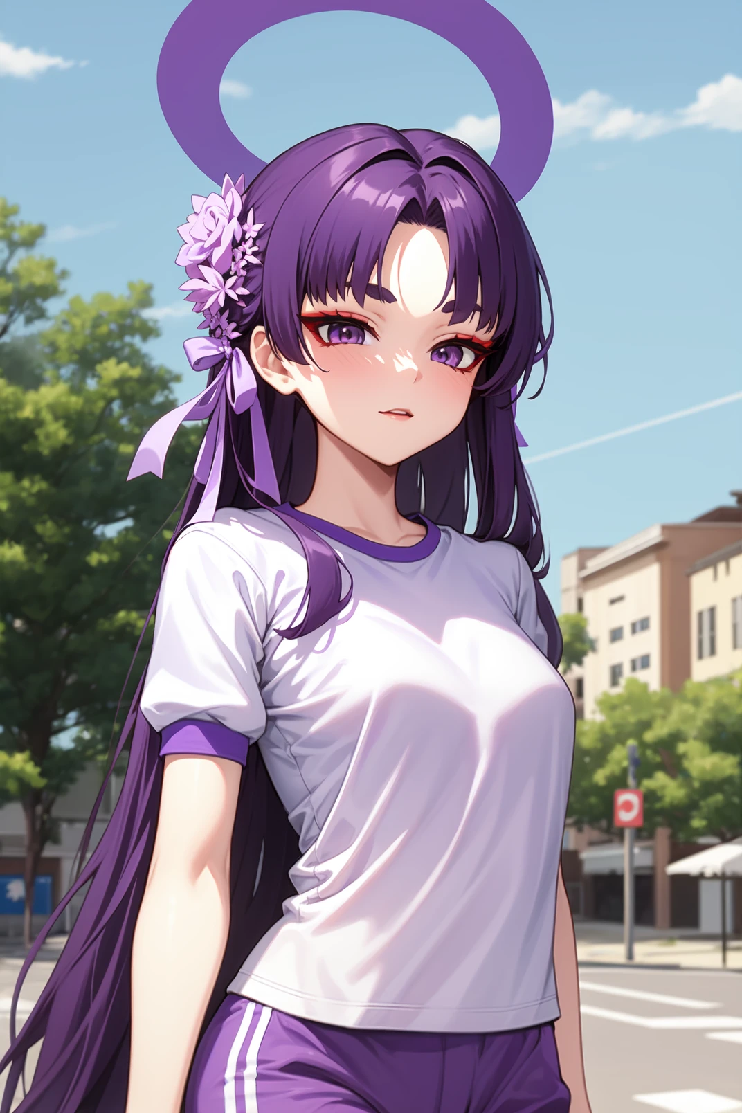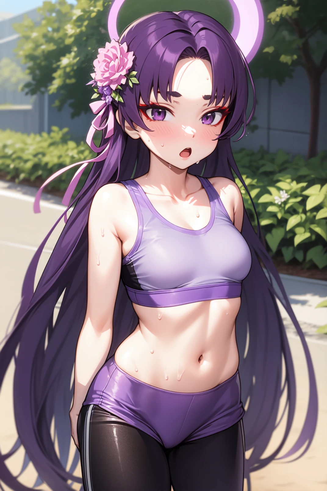yukari, purple eyes, red eyeshadow, thick eyebrow, purple hair, very long hair, parted bangs, pink flower, hair flower ornament, halo