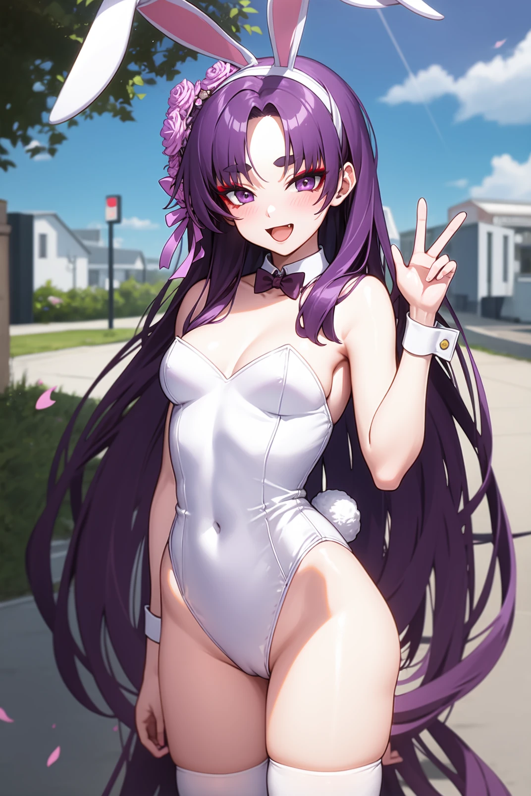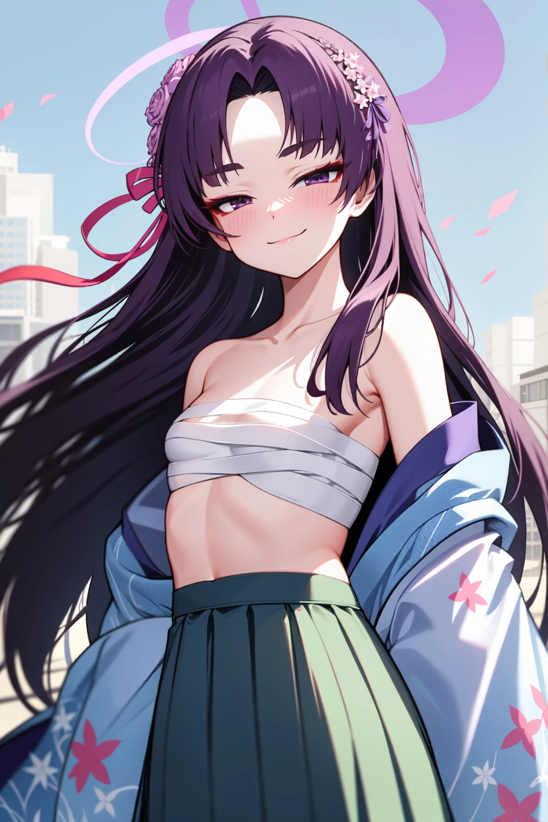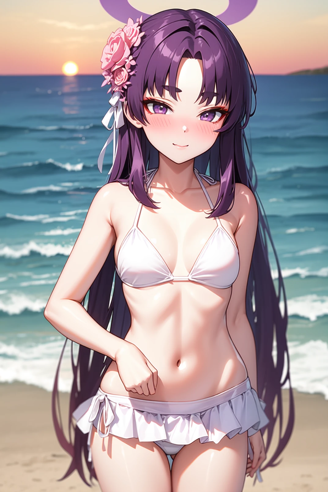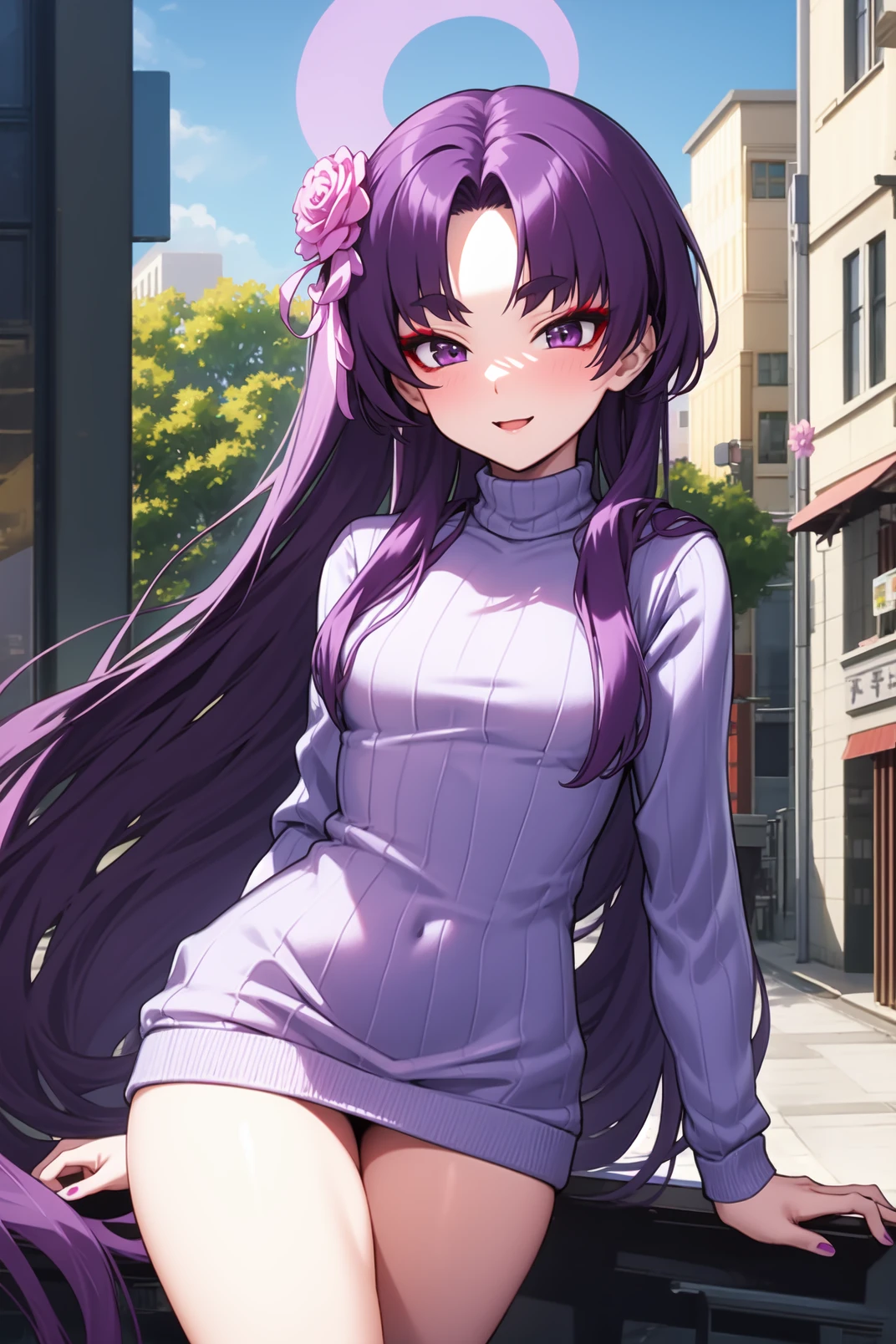 yukari, purple eyes, red eyeshadow, thick eyebrow, purple hair, very long hair, parted bangs, pink flower, hair flower ornament, halo