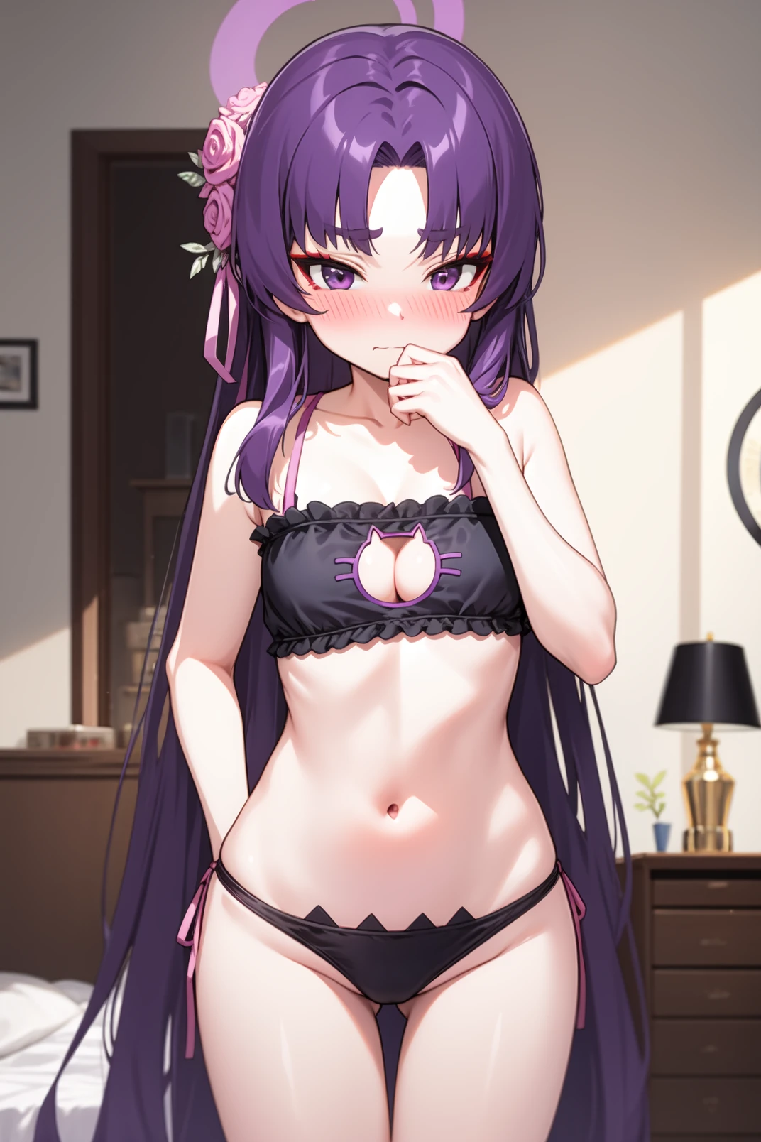 appearance: yukari, purple eyes, red eyeshadow, thick eyebrow, purple hair, very long hair, parted bangs, pink flower, hair flower ornament, halo