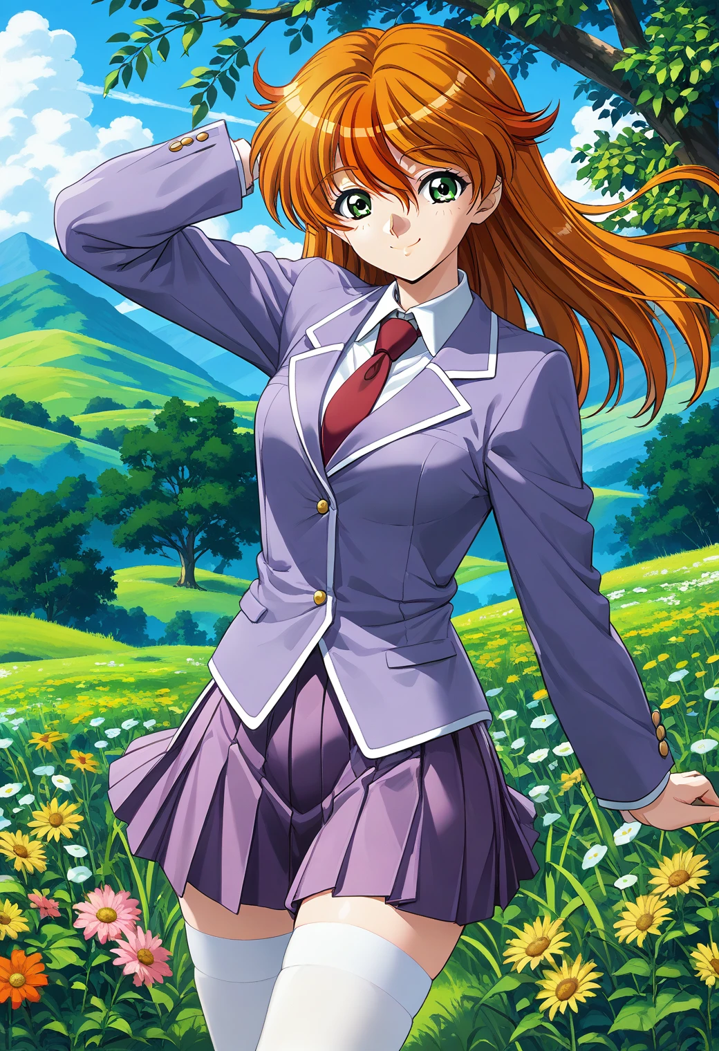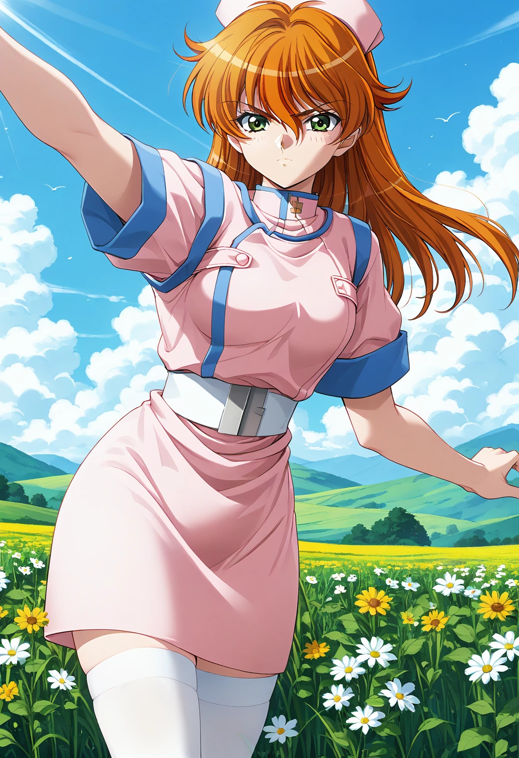 nogiwa_miho, green eyes, orange hair, long hair, pink nurse, pink nurse cap, short sleeves, white thighhighs,
