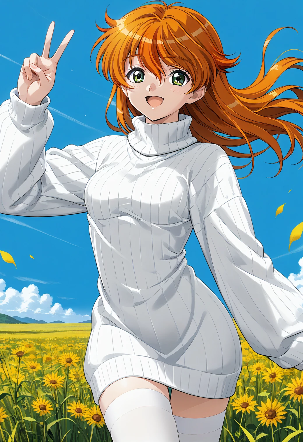 costume3: white sweater, sweater dress, ribbed sweater, turtleneck, long sleeves,