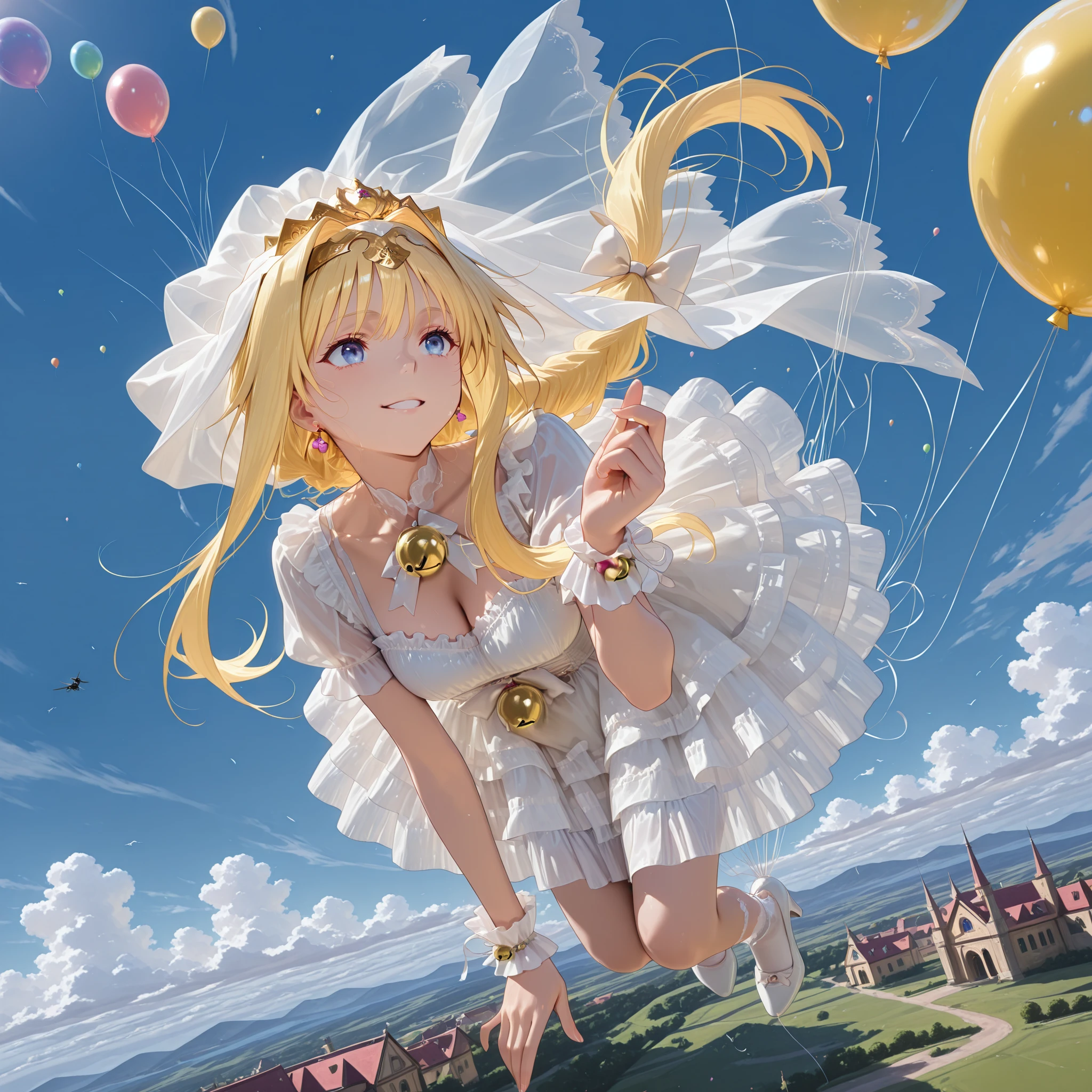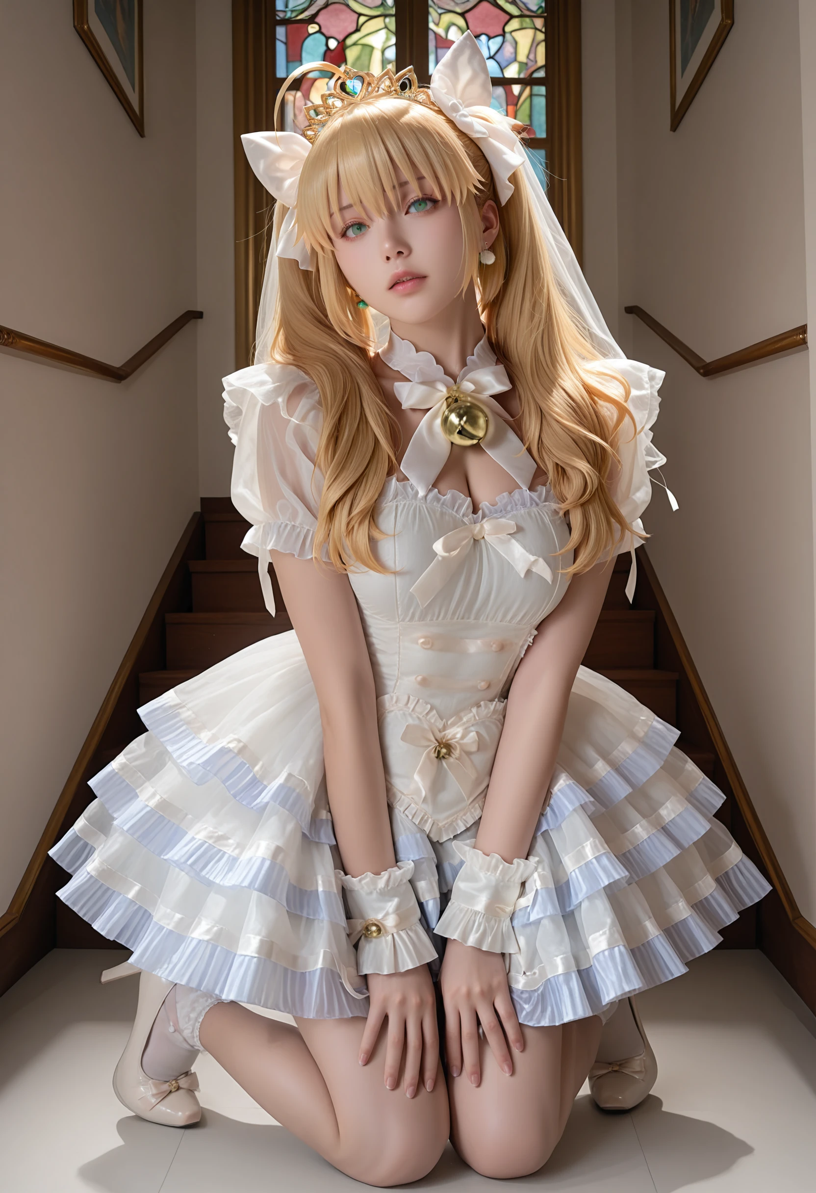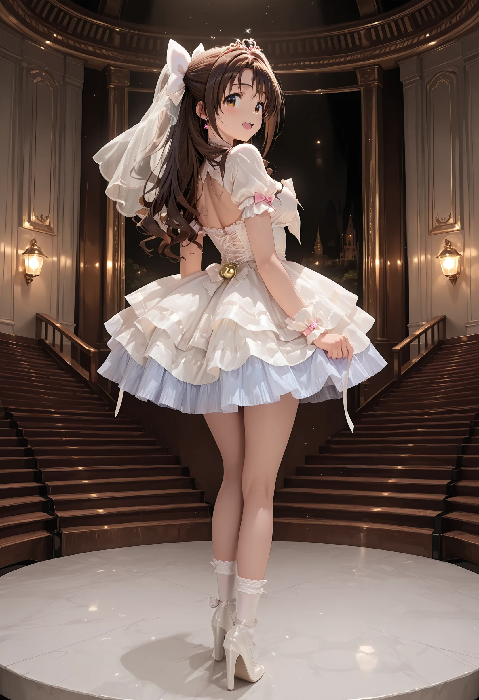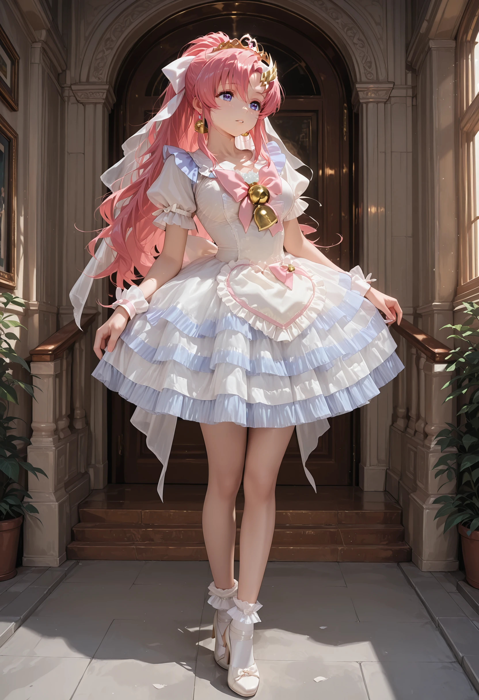 <lora:magical_girl_dressw:0.8>magical_girl_dressw,frilled dress, short sleeves,bell, wrist cuffs, tiara, layered dress, white ribbon, hair bow, veil, high heels, white socks, jewelry,earrings,ribbon,