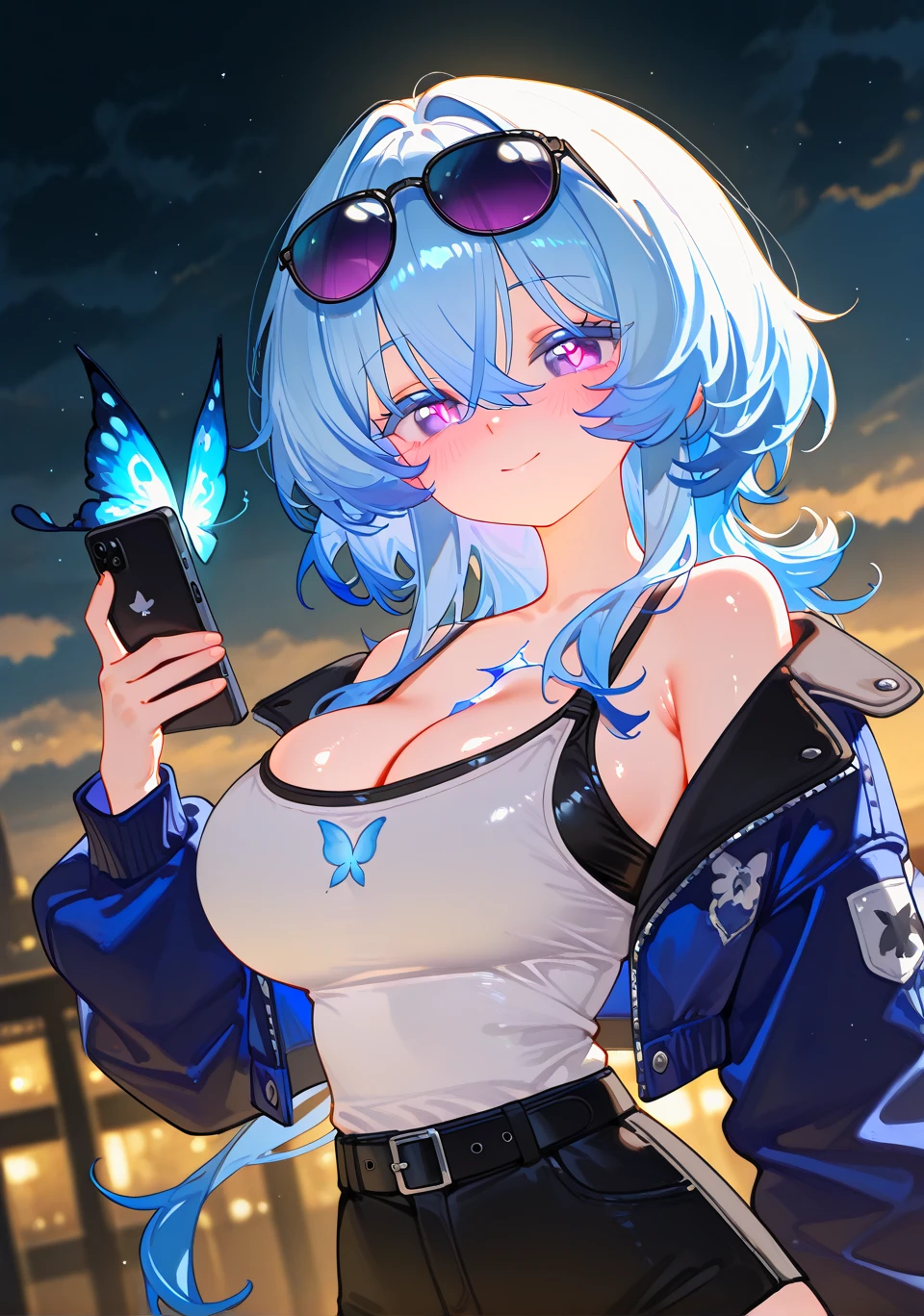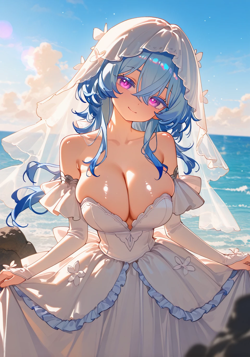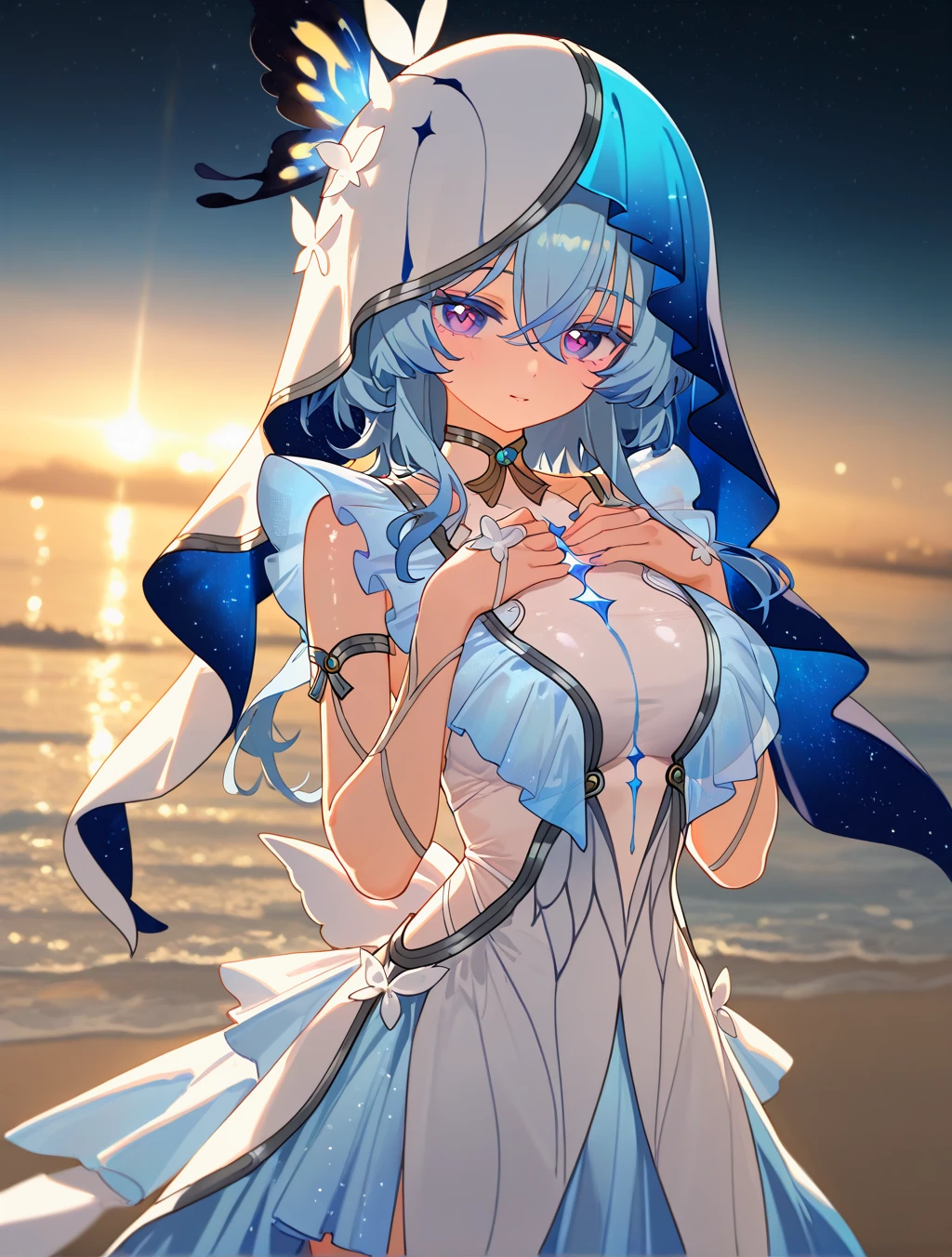shorekeeper \(wuthering waves\), official outfit, two-tone veil, white veil, blue veil, diamond-shape pupils, butterfly hair ornament, white dress, blue dress, armlet, sleeveless dress, see-through,