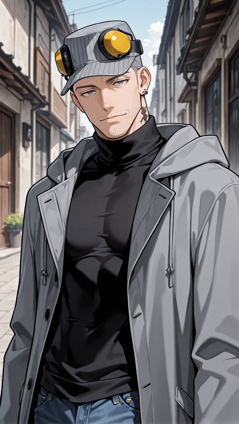 pinstripe hat, ear protection, black turtleneck, grey long coat, hood down, jeans, boots
