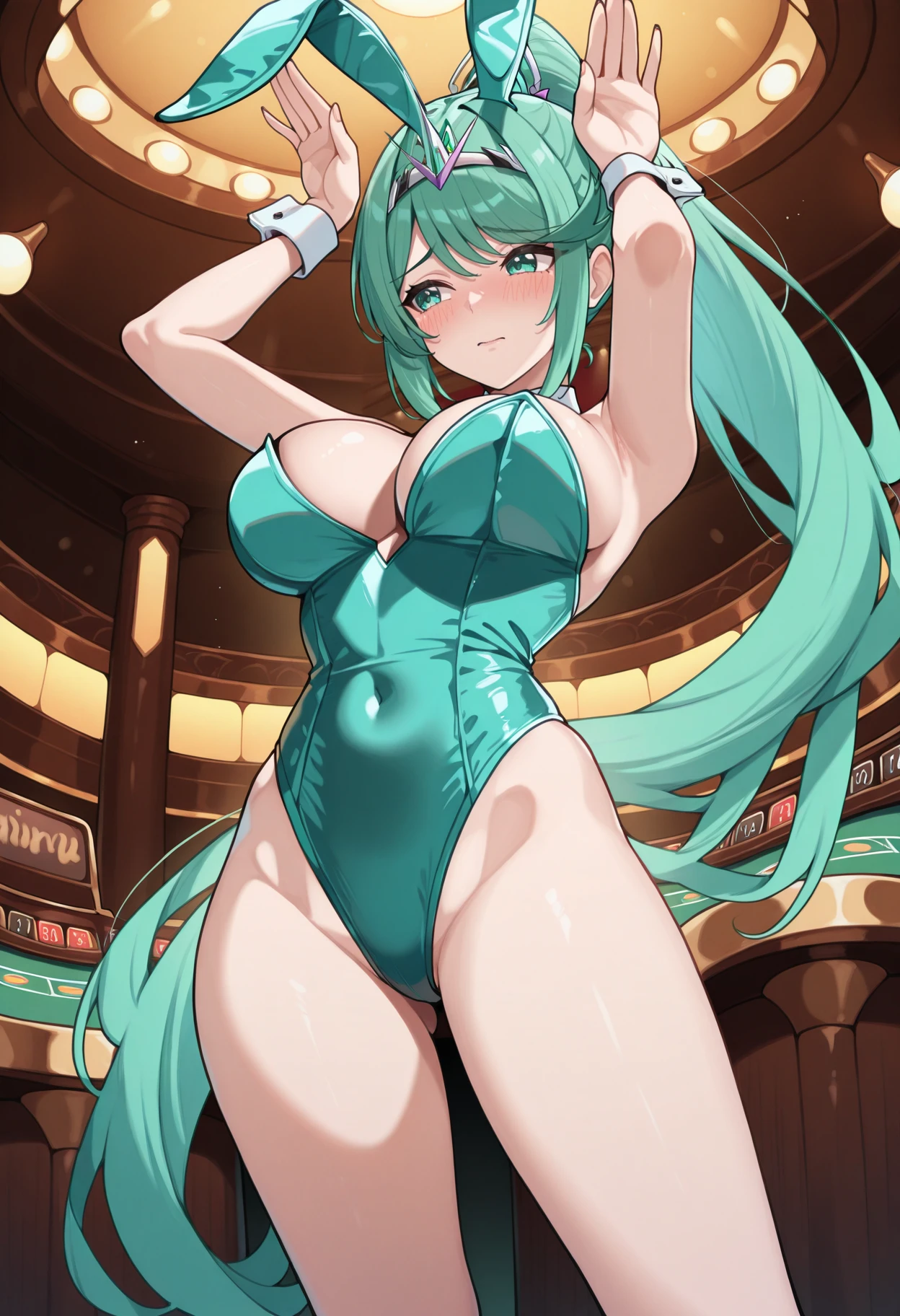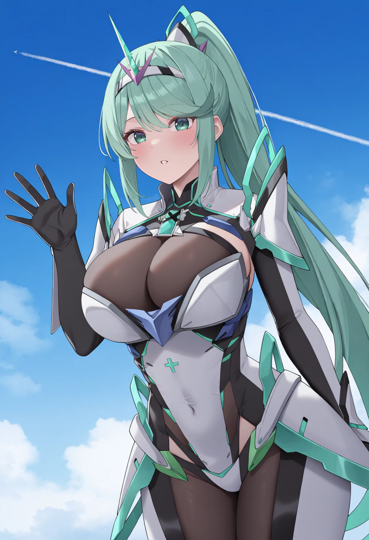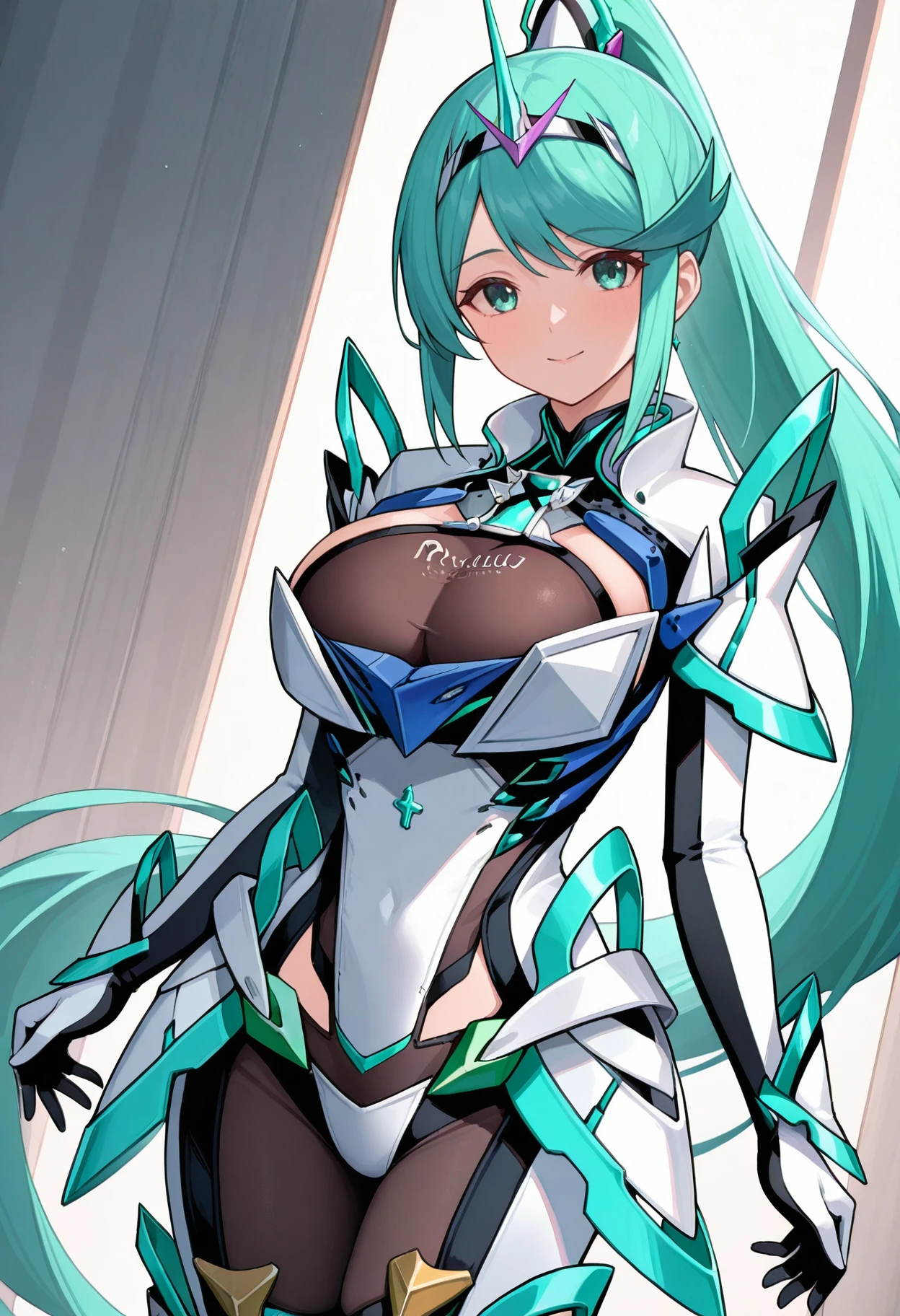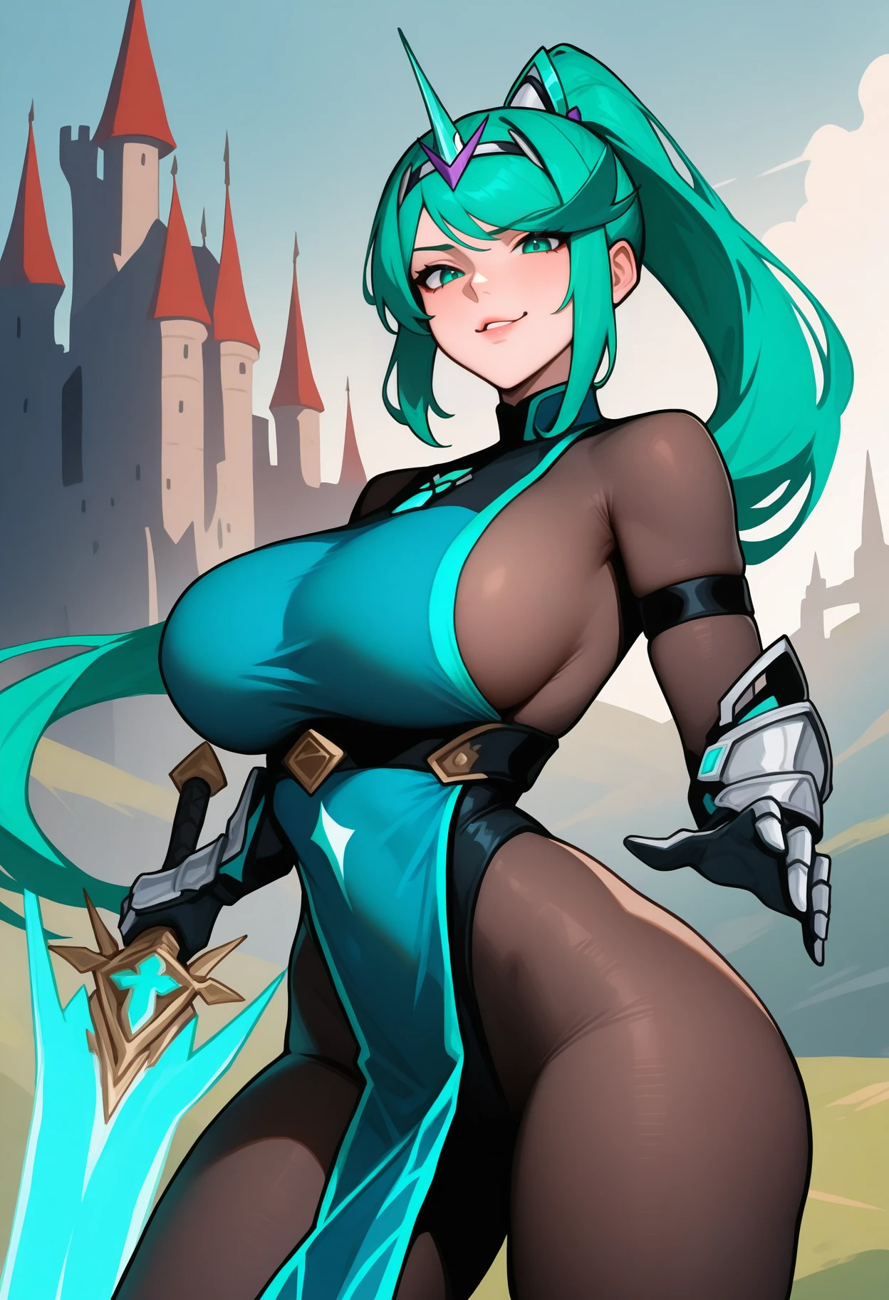 pnmdef, aqua eyes, aqua hair, long hair, ponytail, tiara, large breasts, armor, gloves