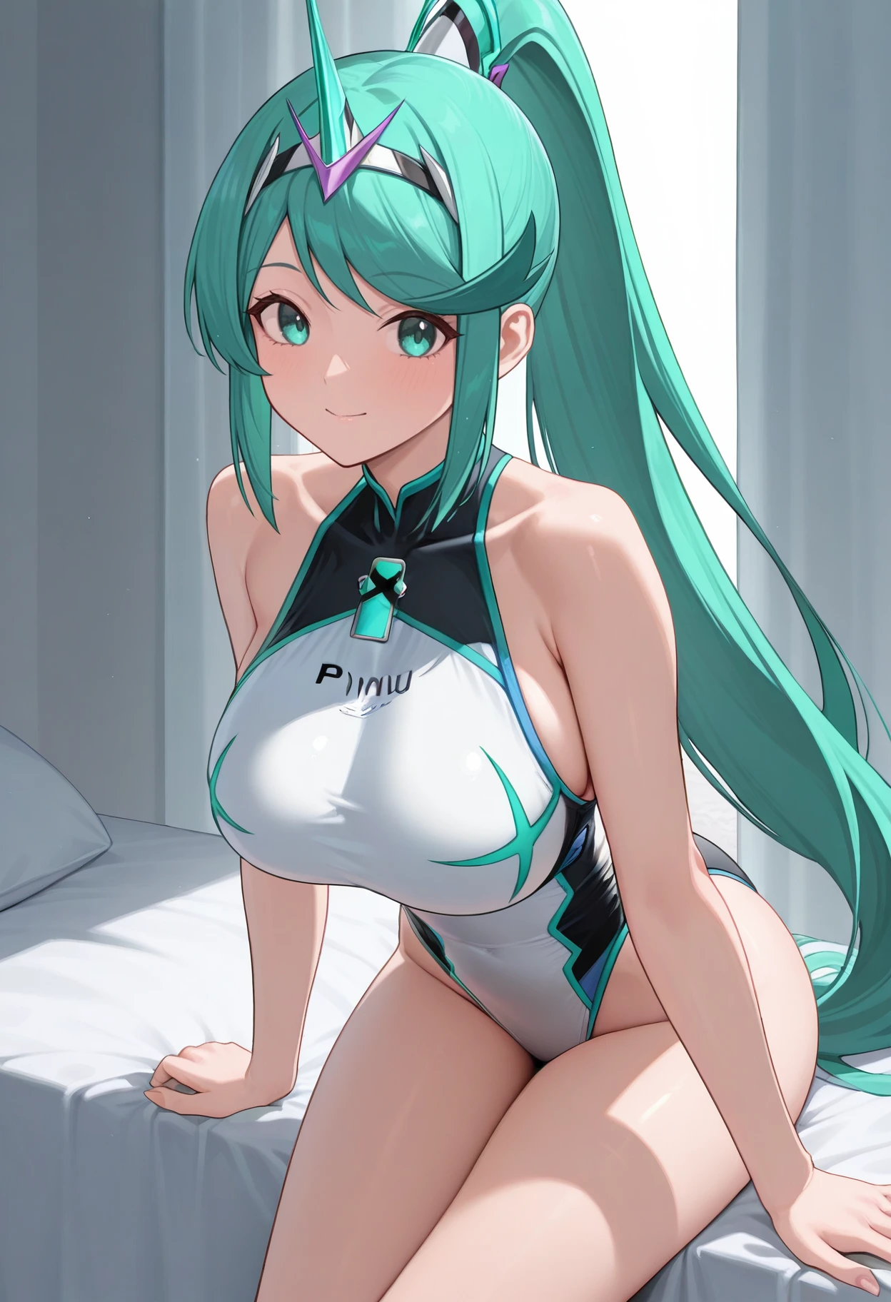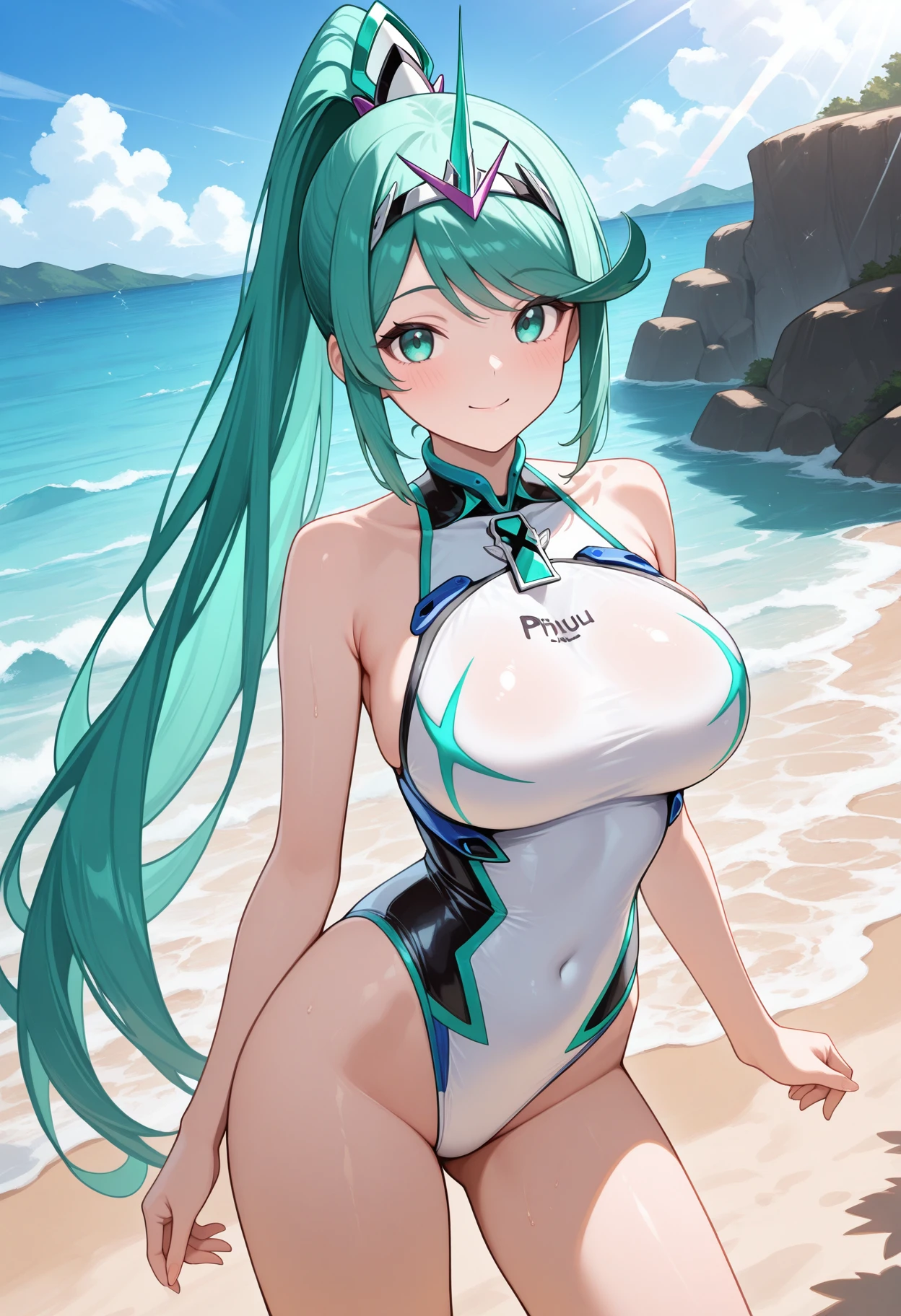 pnmsum, aqua eyes, aqua hair, long hair, ponytail, tiara, large breasts, one-piece swimsuit