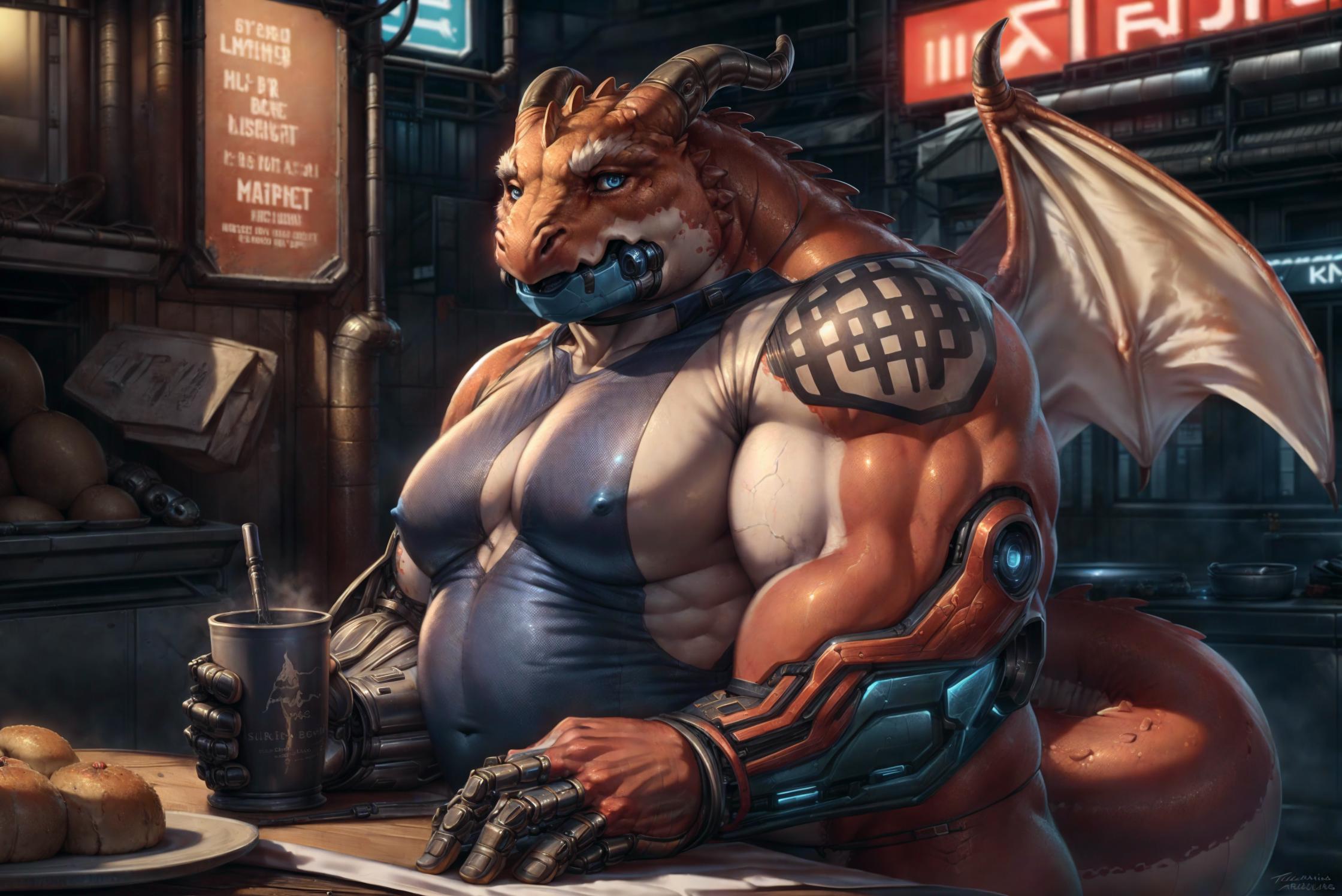 Related words : red skin, dragon wings, dragon horns, dragon tail, blue cape, happi, open shirt, sandals