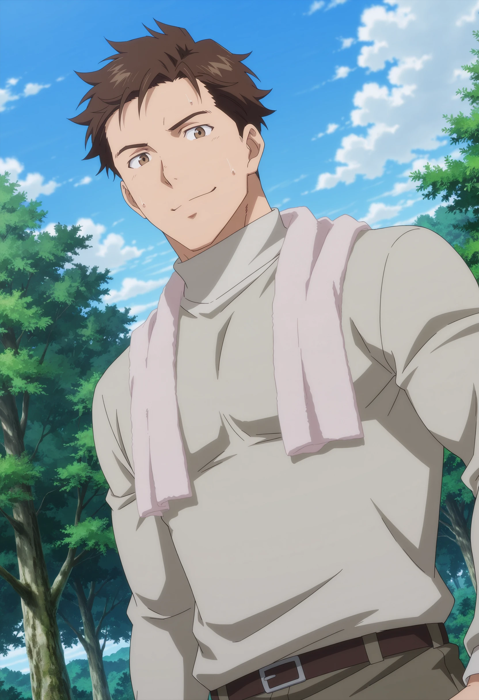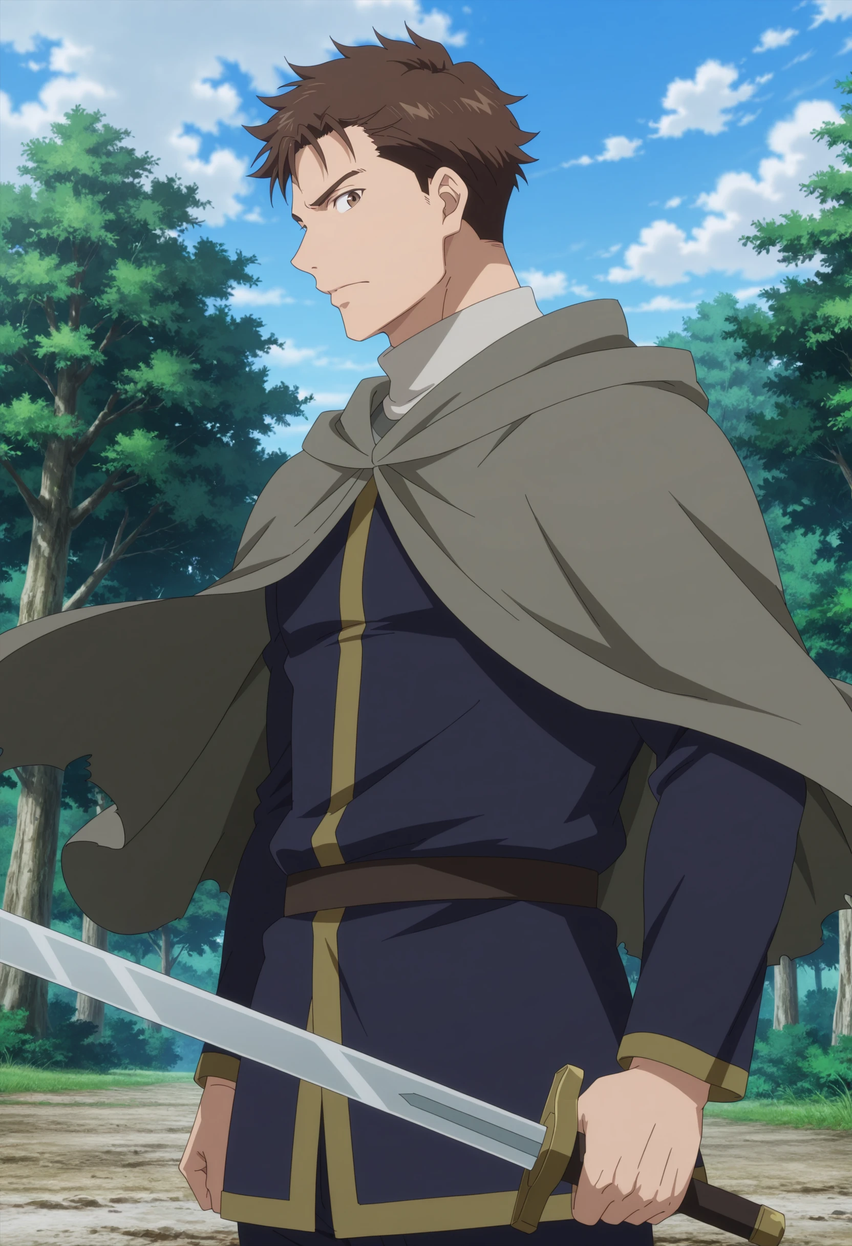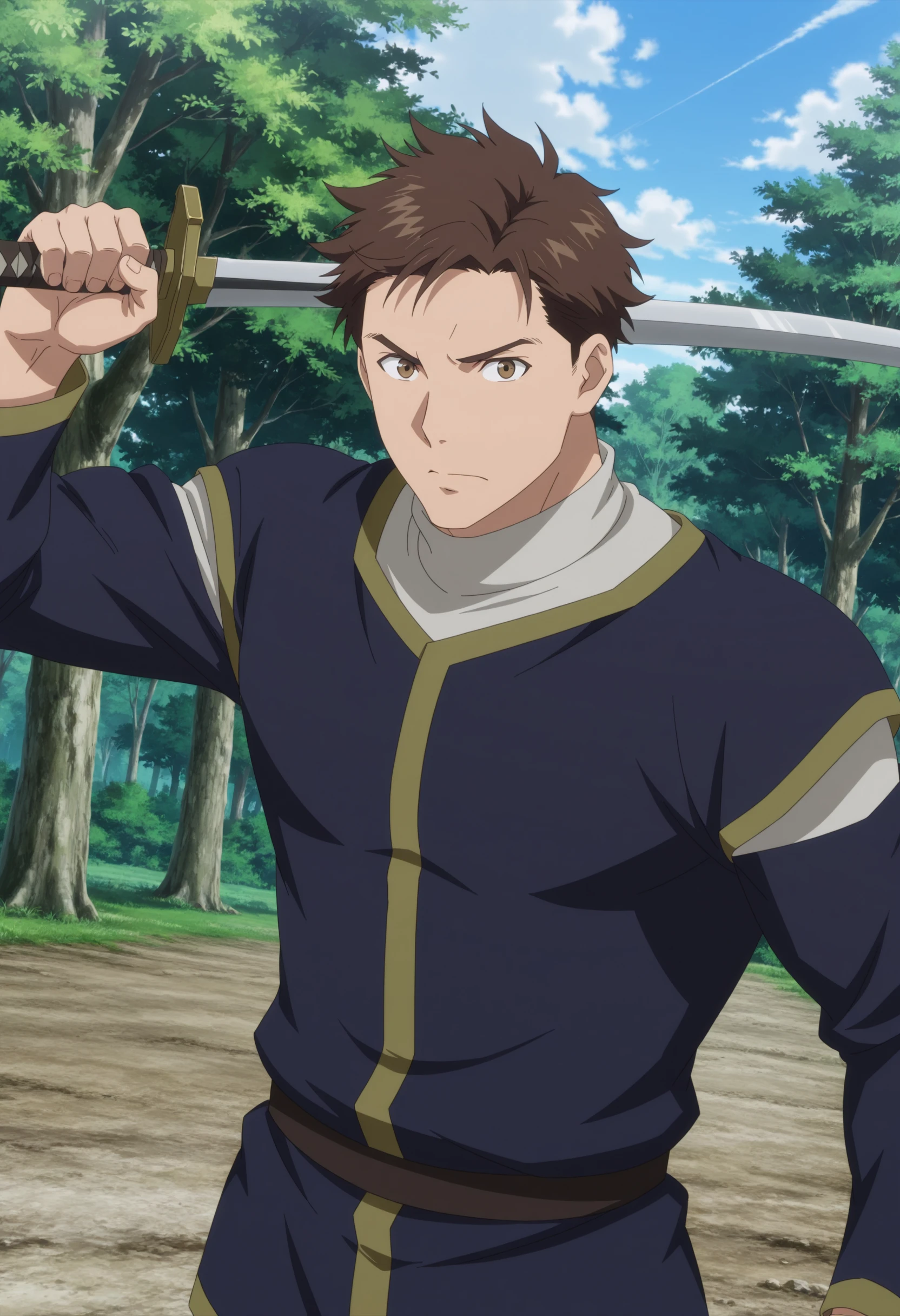brown hair, brown eyes, dark blue uniform with gold trim, gray turtleneck undershirt