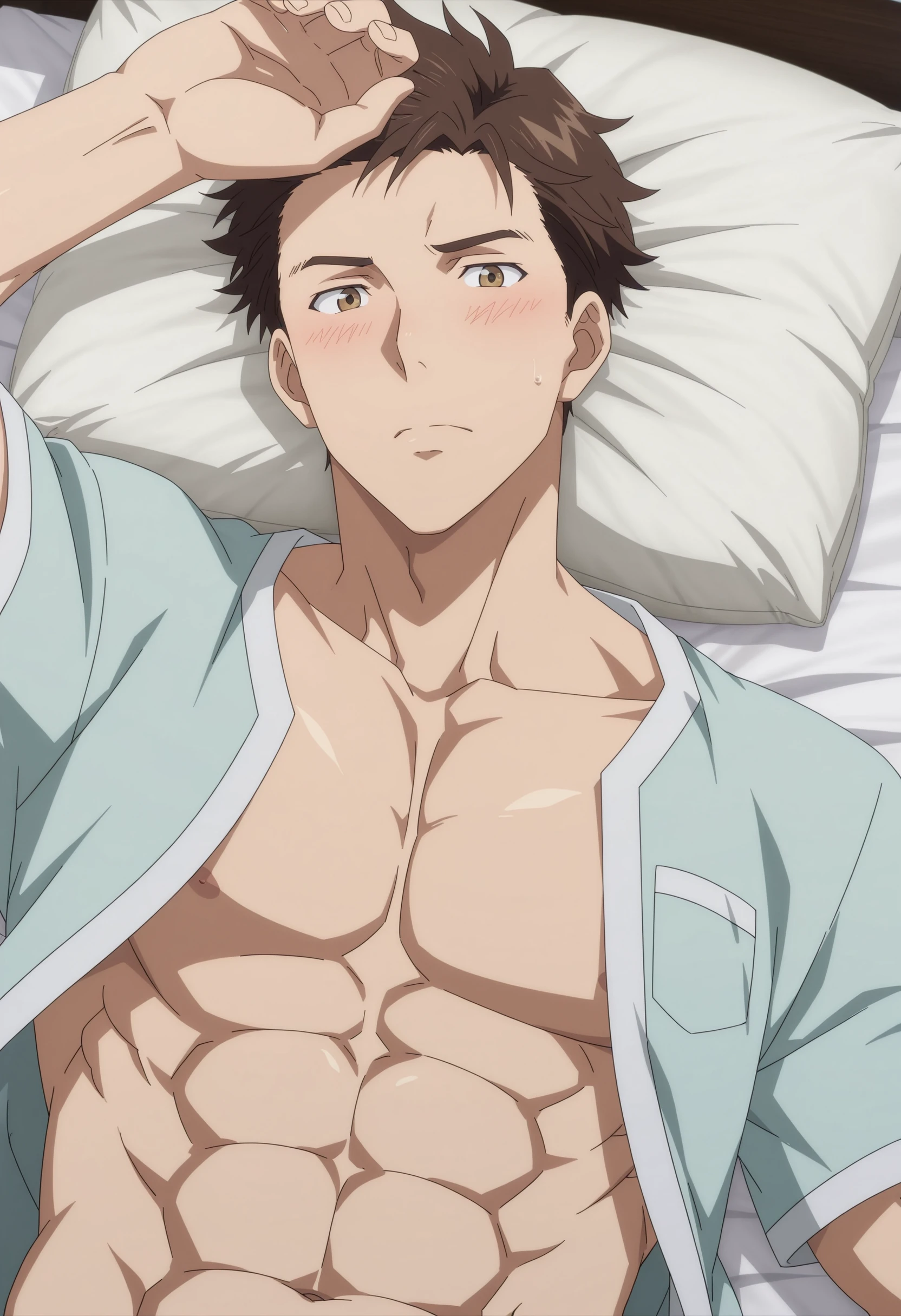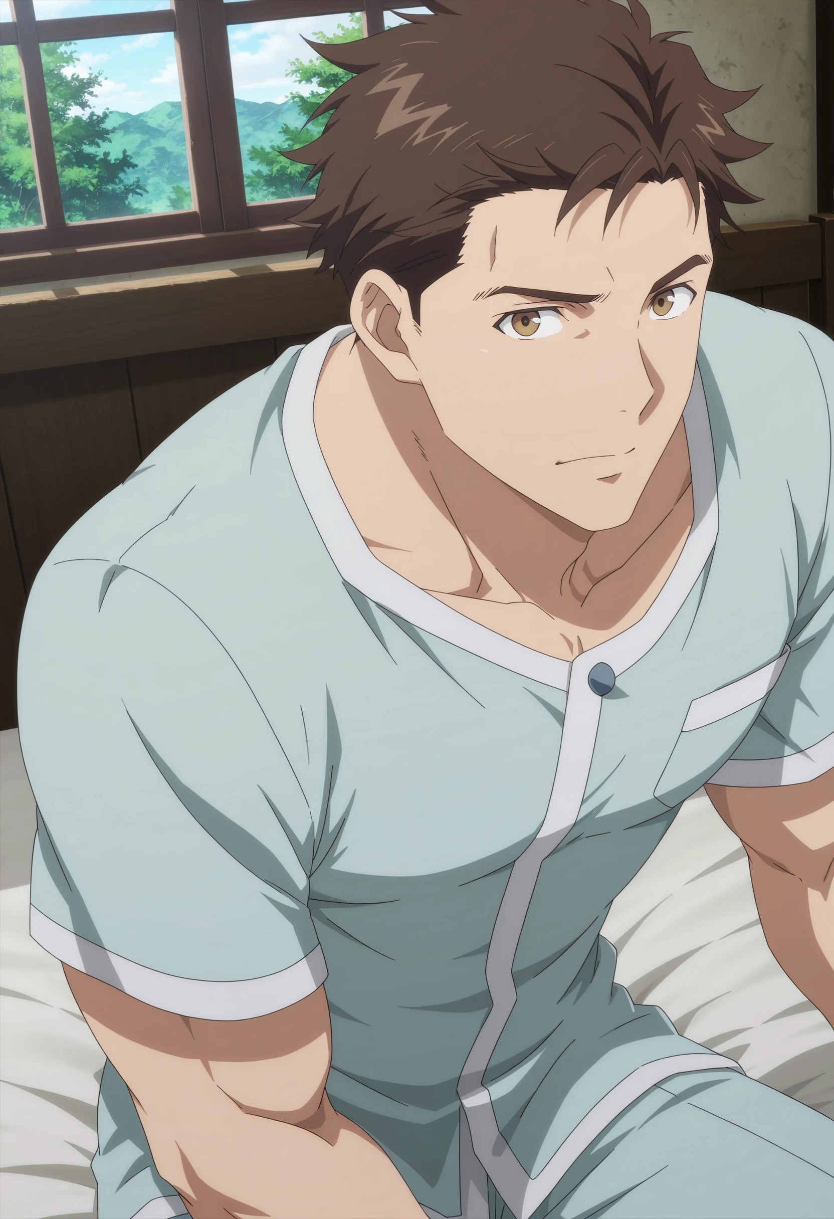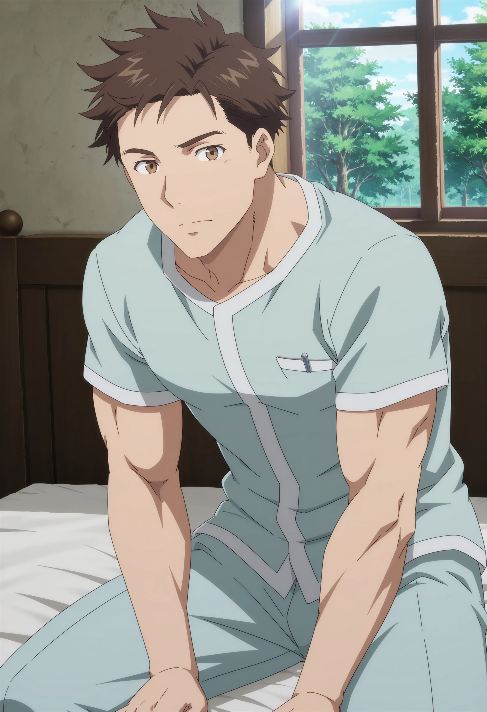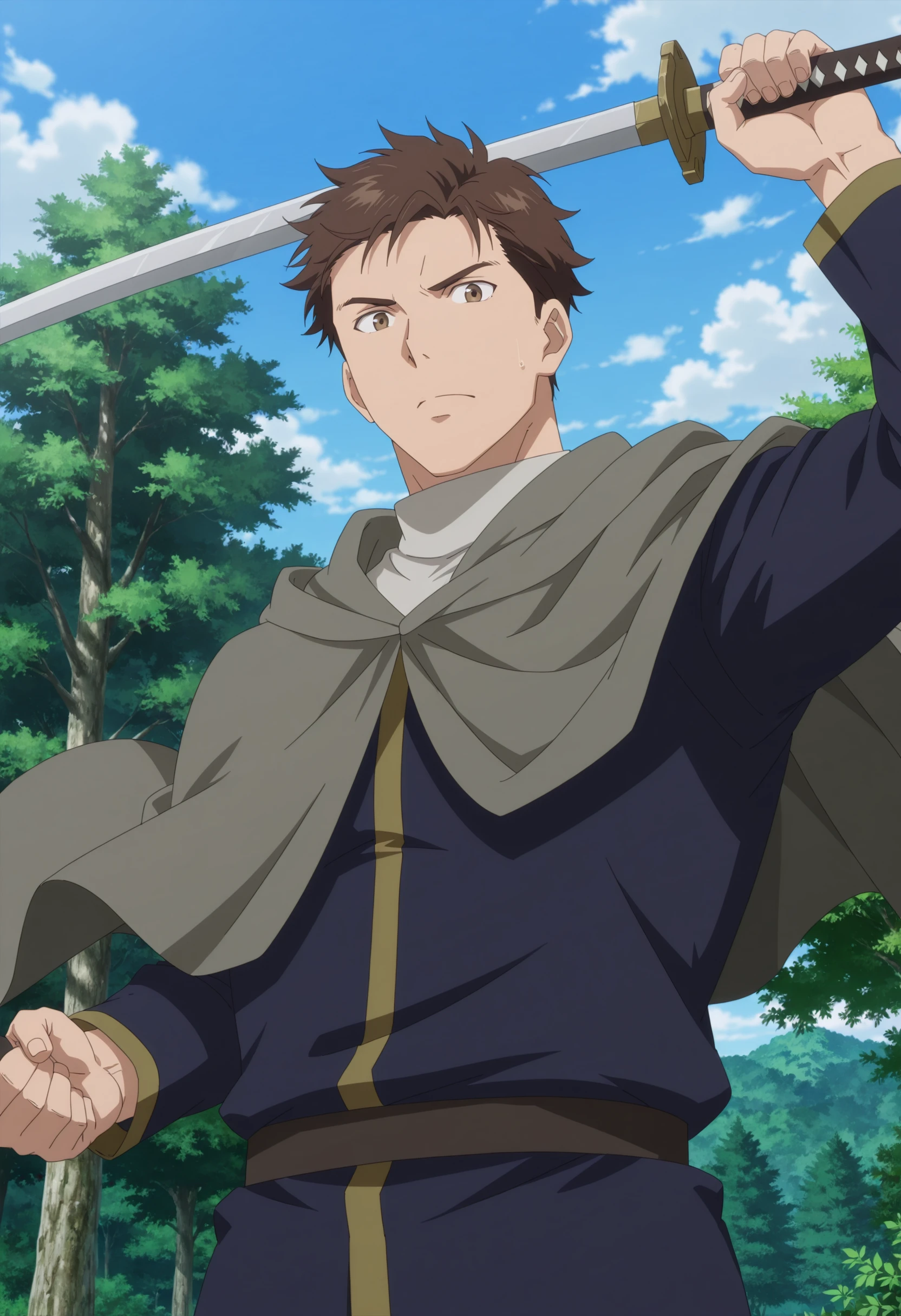 brown hair, brown eyes, dark blue uniform with gold trim, gray turtleneck undershirt