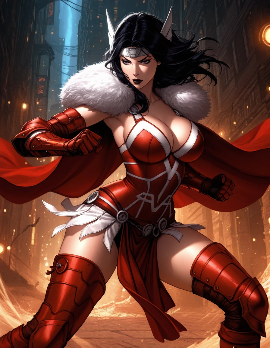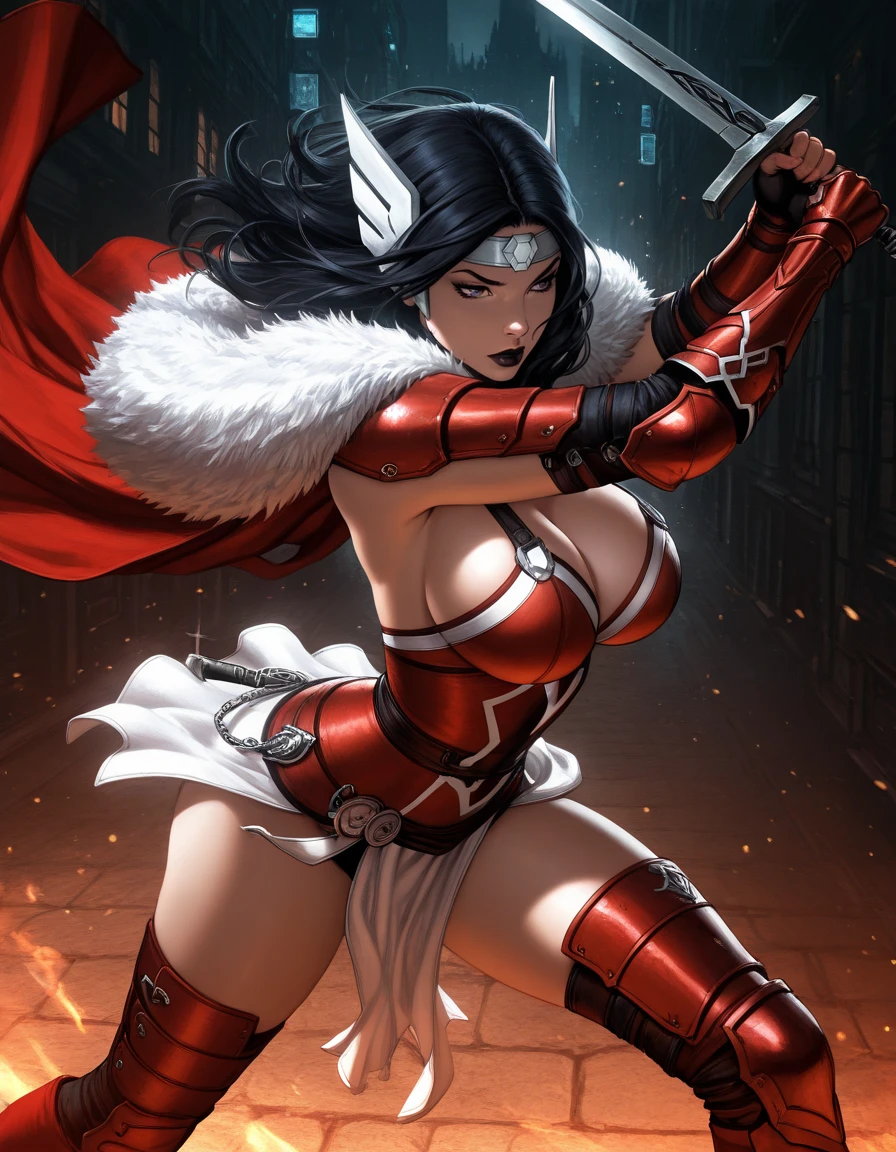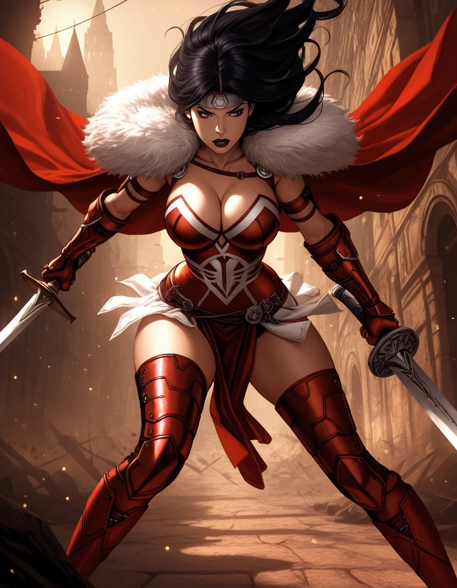cleavage, fur trim, forehead protector, red armor, white trim, red armored gauntlet, red armoored boots, cape, white pteruges,