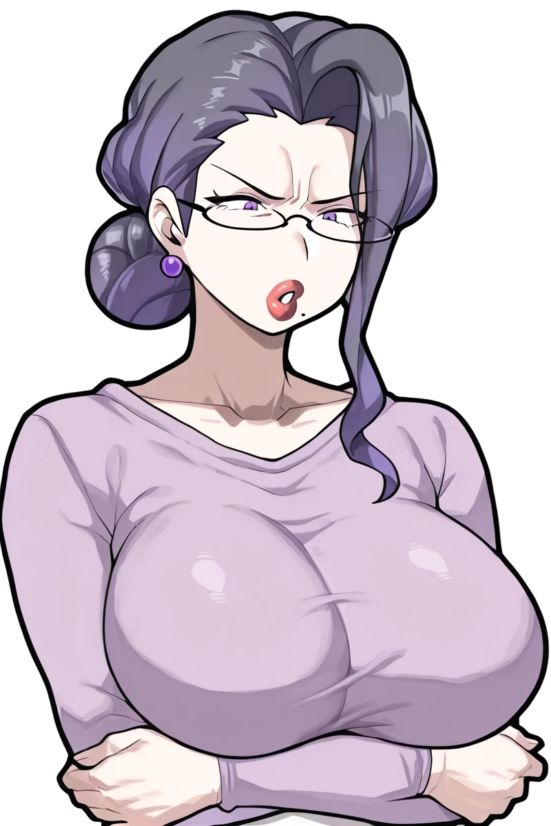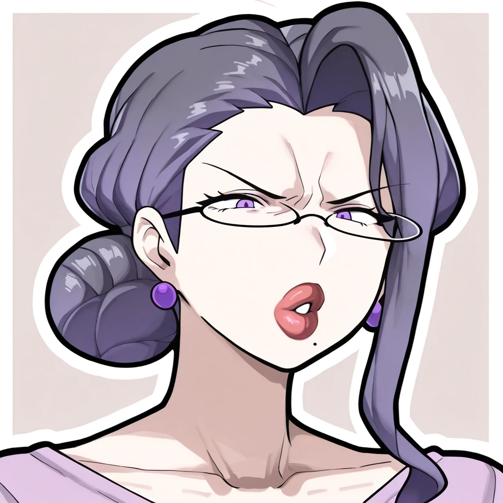 mama hiromi, purple eyes, dull purple hair, 1girl, solo, glasses, jewelry, earrings, mature female, lipstick, lips, hair bun, purple eyes,