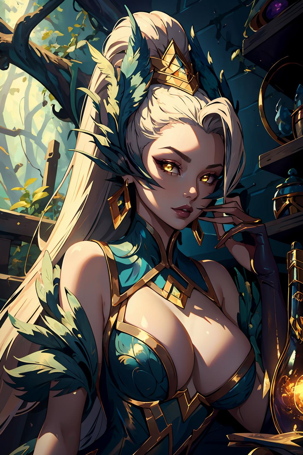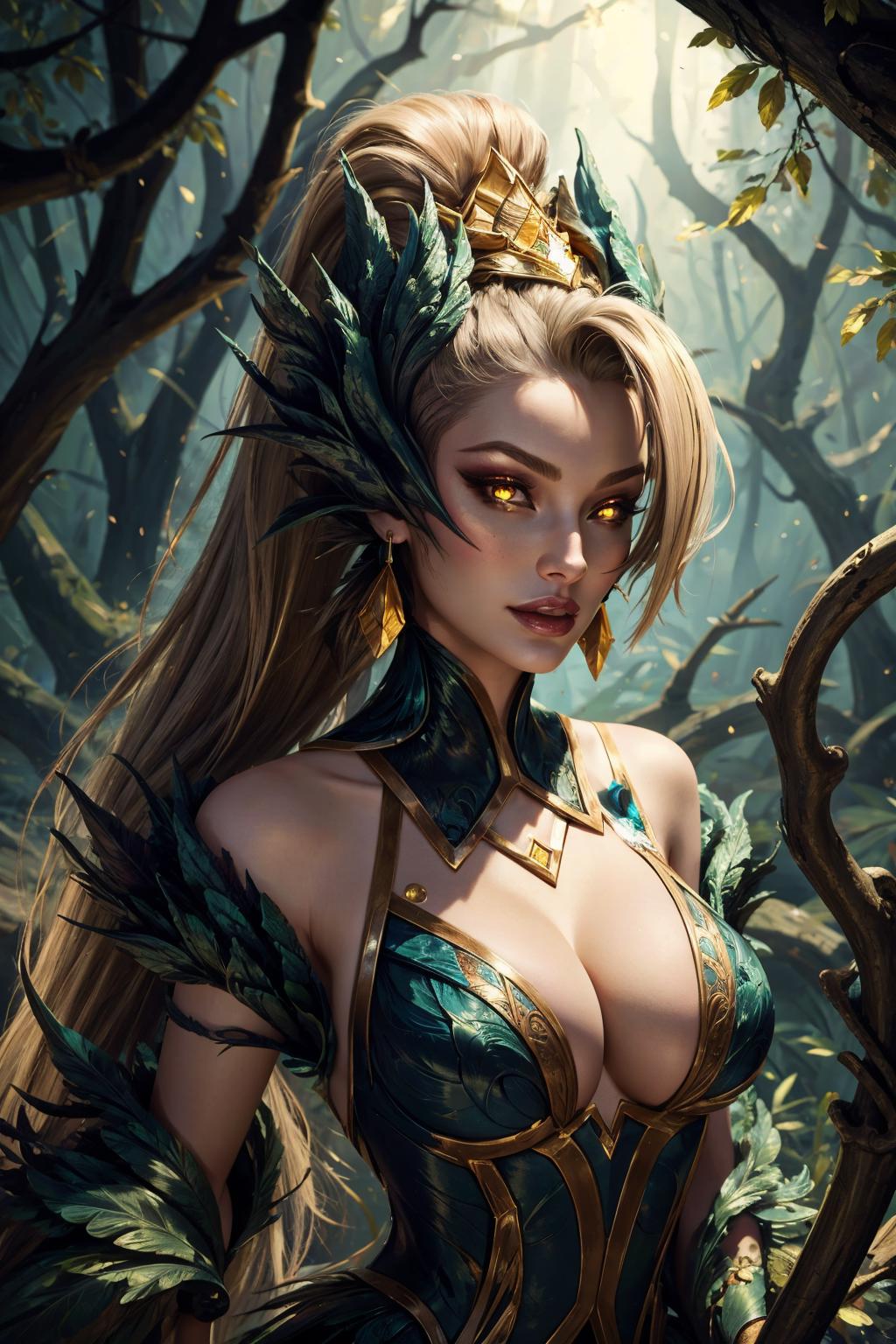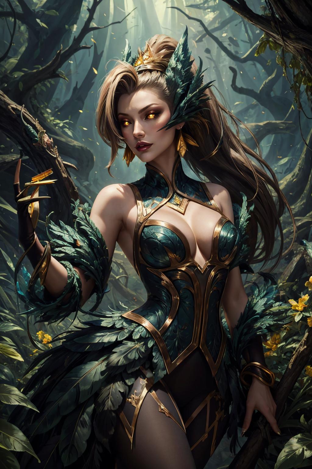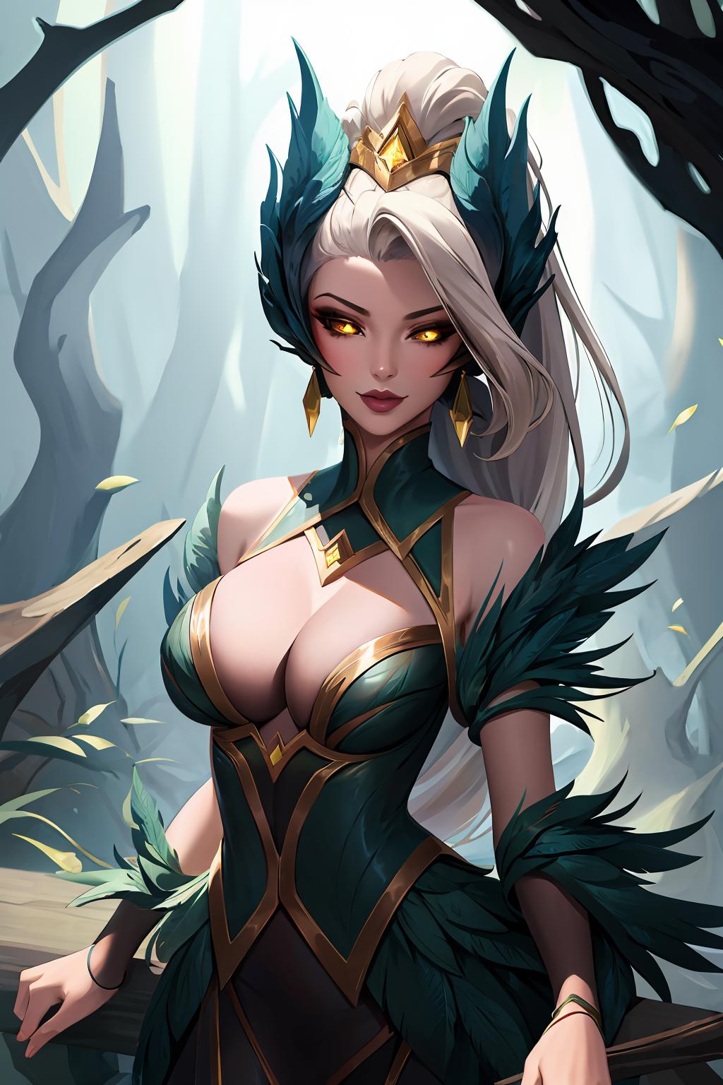 tags: coven zyra, 1girl, dress, ponytail,earrings, bare shoulders, hair ornament, cleavage, feathers, yellow eyes