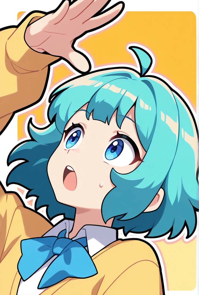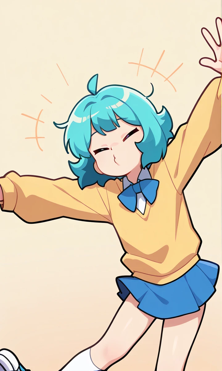 yummie2023, 1girl, short hair, aqua eyes, aqua hair, ahoge, shirt, yellow sweater, blue bowtie, socks, blue skirt, blue footwear,