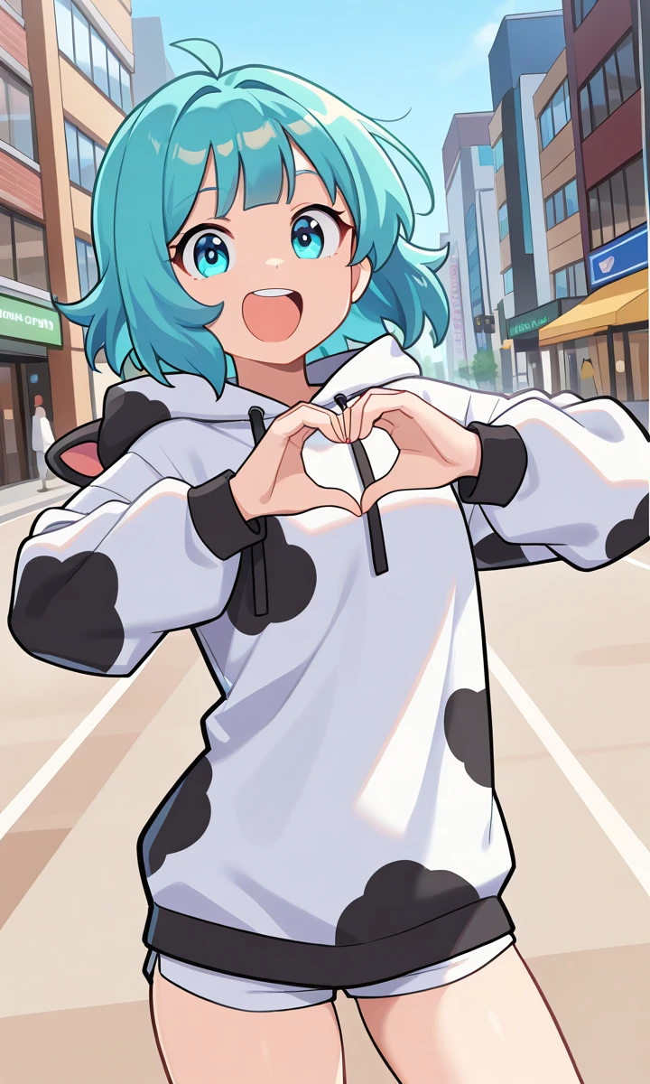 yummie2025, 1girl, short hair, ahoge, aqua eyes, aqua hair, white socks, shoes, blue footwear, cow hoodie, long sleeves, white hoodie