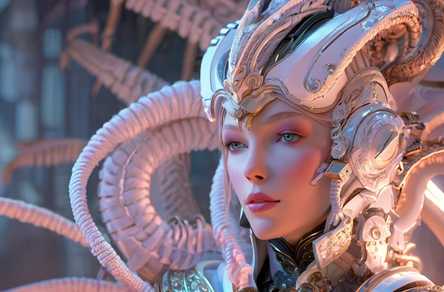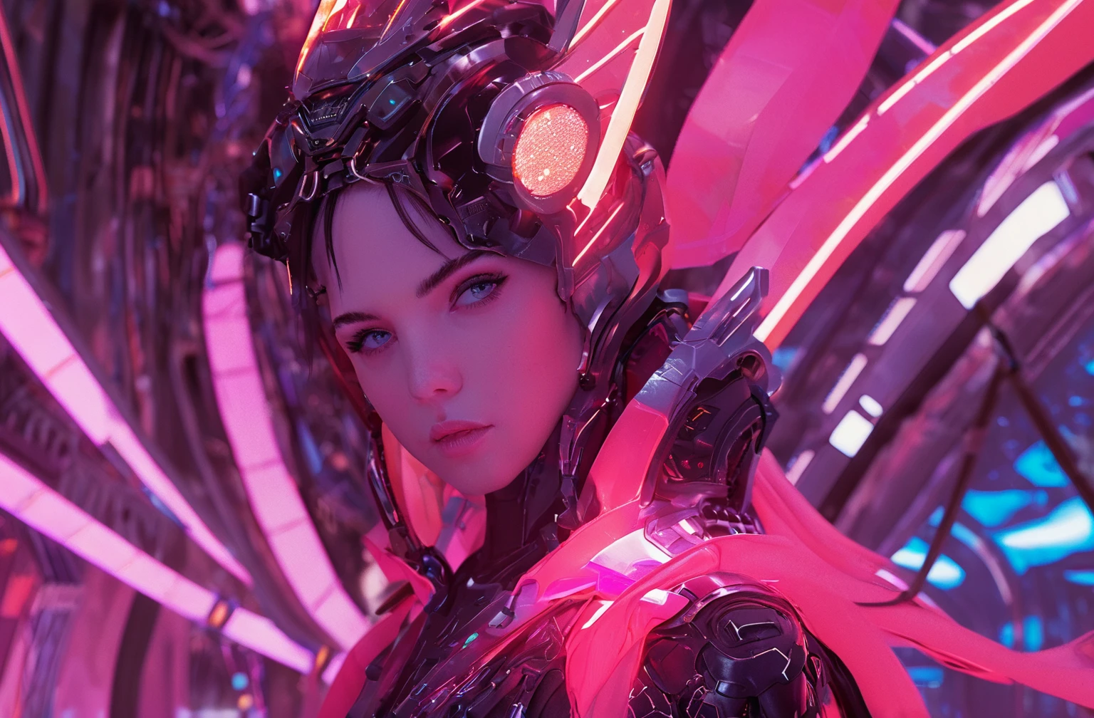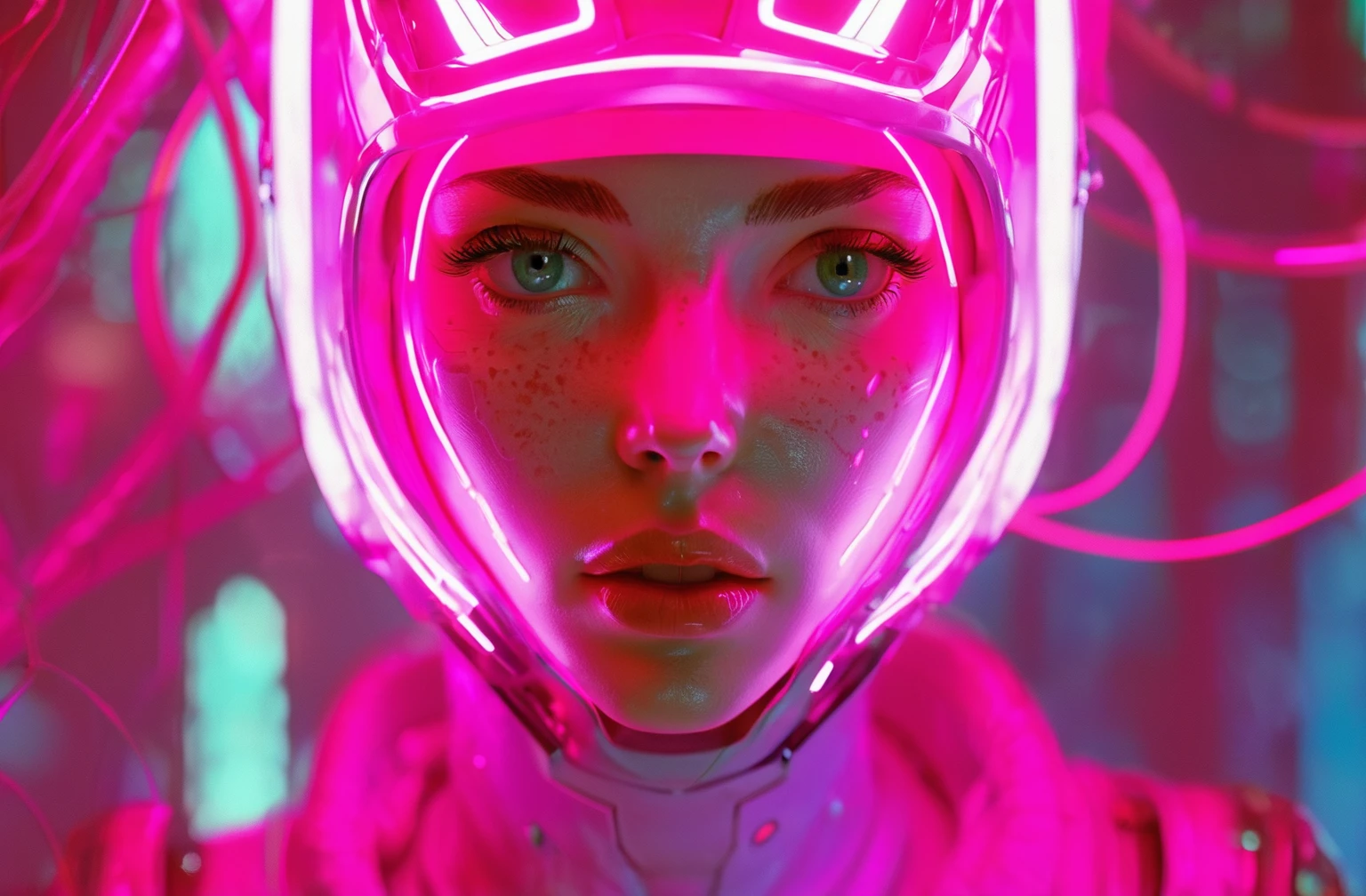 Positive prompt words: FN Concept, Concept map, film and television special effects concept, cyber technology, ultra high definition face, describe this image in a very detailed manner. a woman with a contemplative gaze is depicted in a futuristic white suit, her The face adorned with a transparent visor and a pink neon lighting effect that highlights her freckles and the delicate texture of her skin. the suit's sleek design and the neon's vibrant hue create a stark contrast, emphasizing the woman's serene yet intense expression. (note the prompt word You can imagine by yourself)