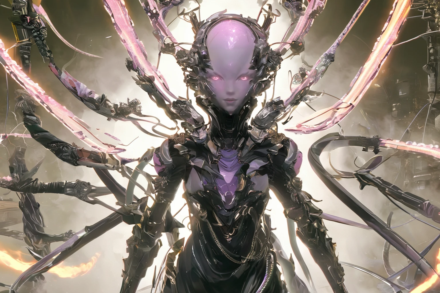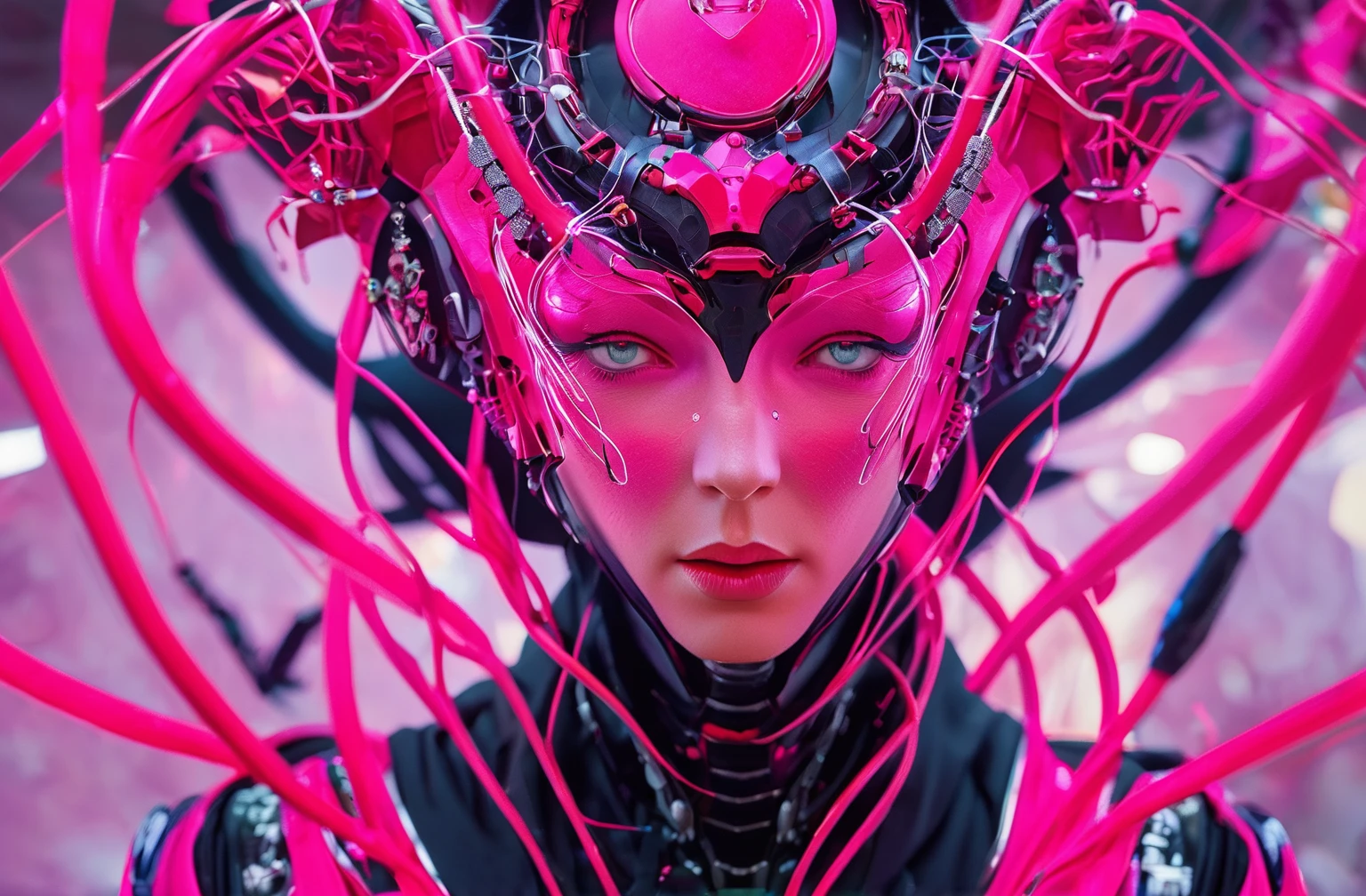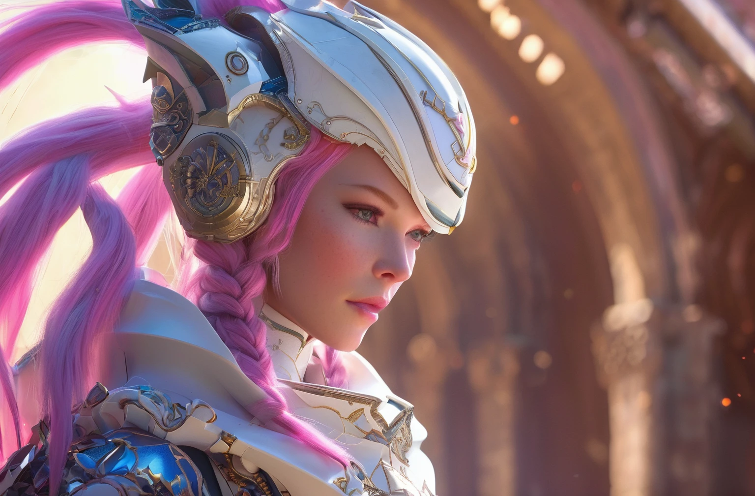 Positive prompt words: FN Concept, Concept map, film and television special effects concept, cyber technology, ultra high definition face, describe this image in a very detailed manner. a woman with a contemplative gaze is depicted in a futuristic white suit, her The face adorned with a transparent visor and a pink neon lighting effect that highlights her freckles and the delicate texture of her skin. the suit's sleek design and the neon's vibrant hue create a stark contrast, emphasizing the woman's serene yet intense expression. (note the prompt word You can imagine by yourself)