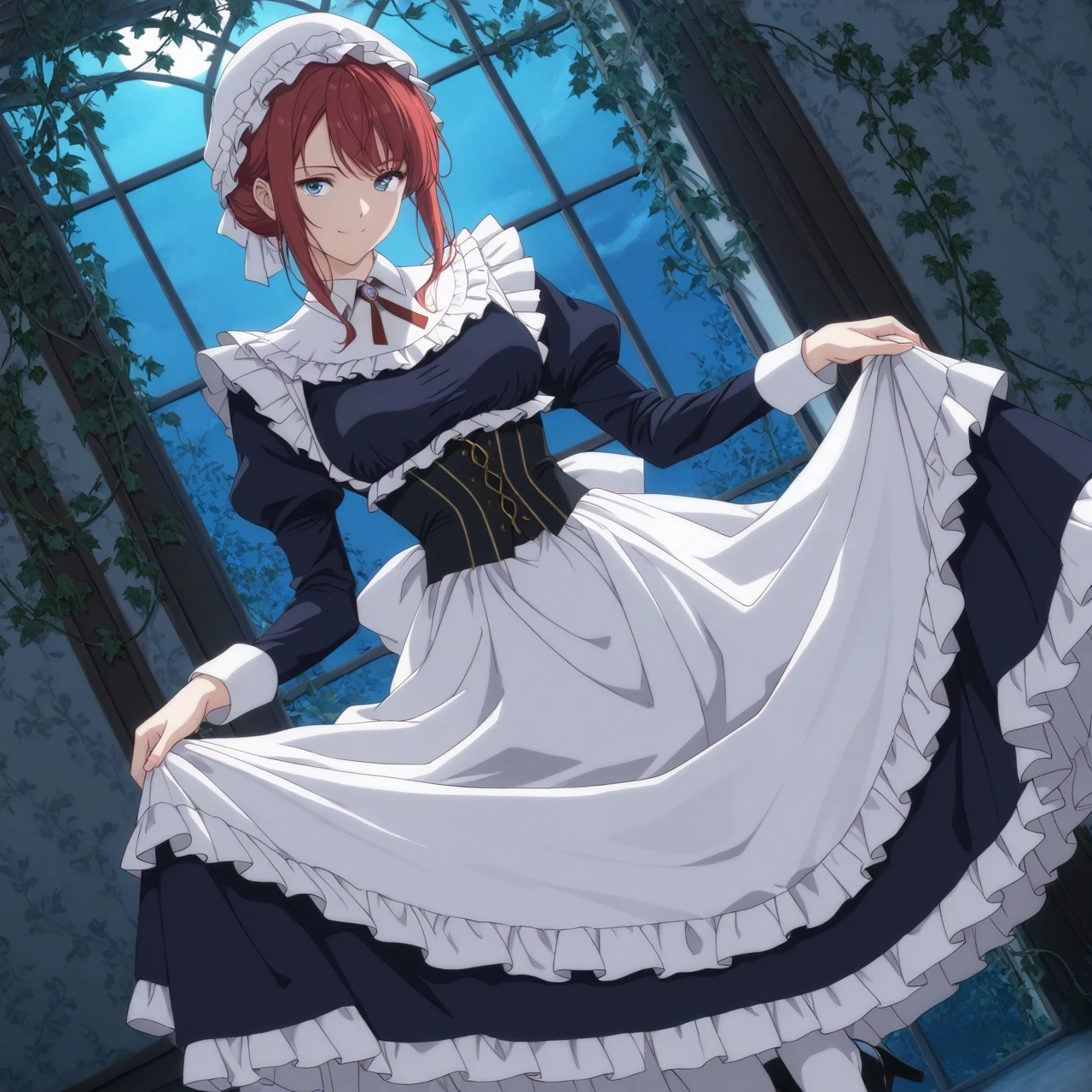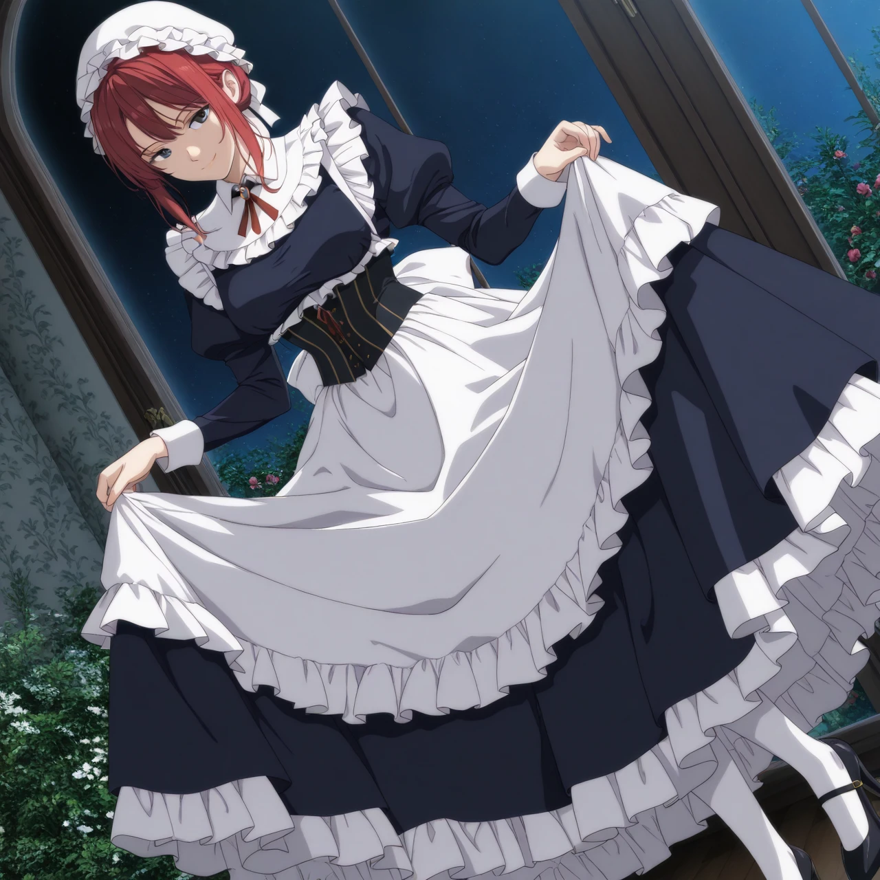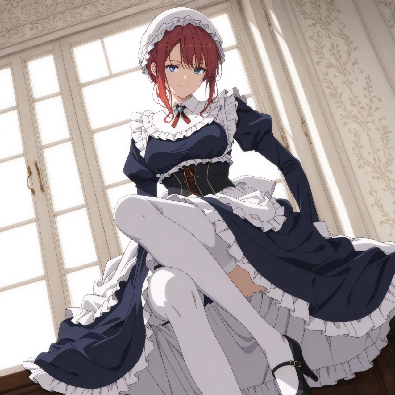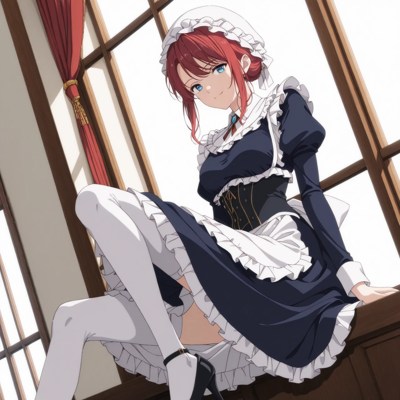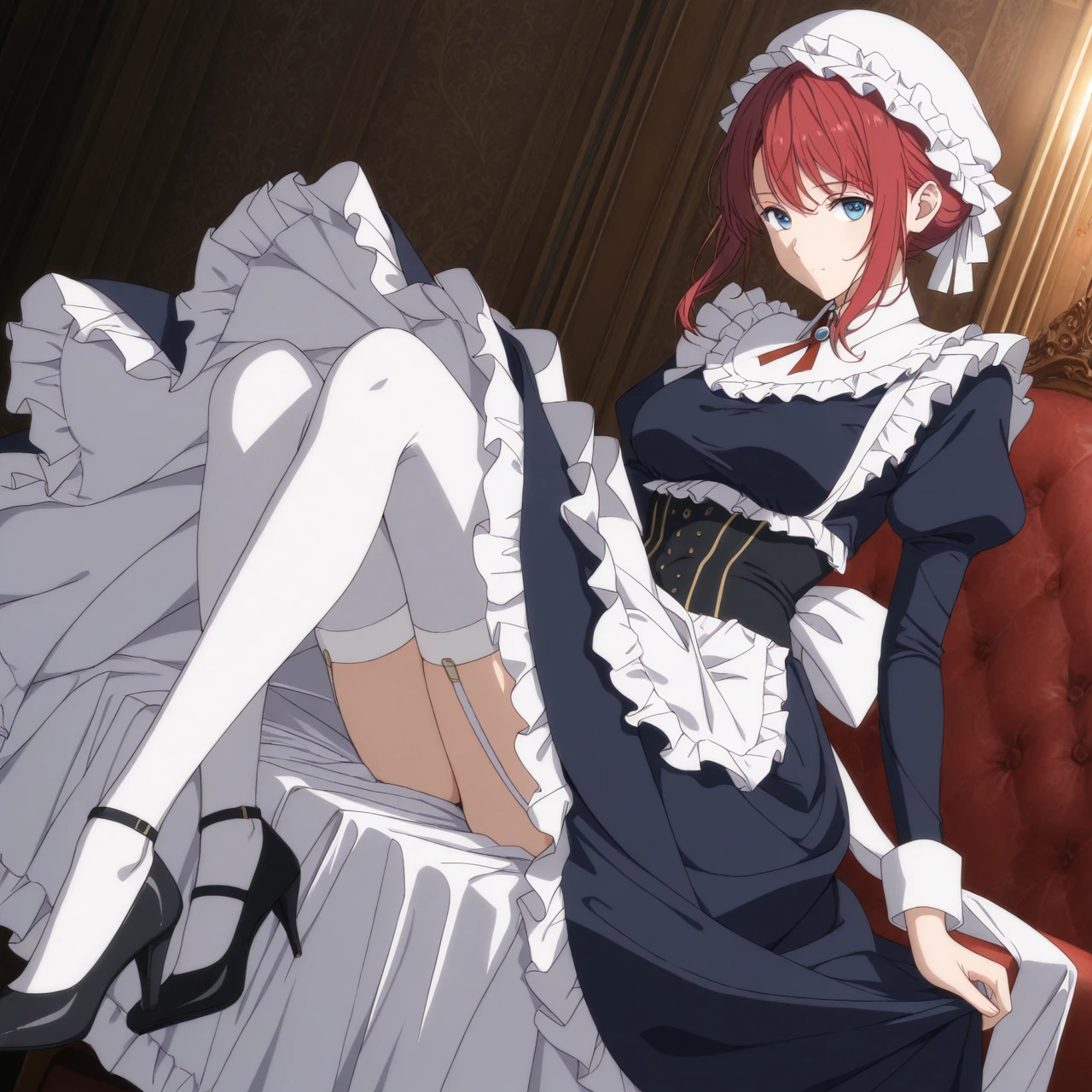 Dress: (maid uniform, mob cap, maid apron, juliet sleeves, corset, white stockings, high heels)
