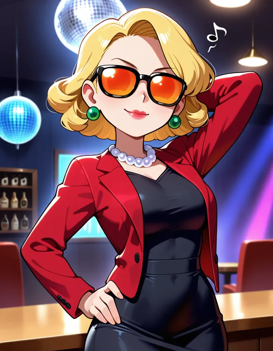 rectangular earrings,green earrings,red jacket,,long sleeves,black dress,tight dress, pencil skirt,red pumps,pearl necklace,sunglasses,black-framed eyewear,orange-tinted eyewear,opaque glasses,