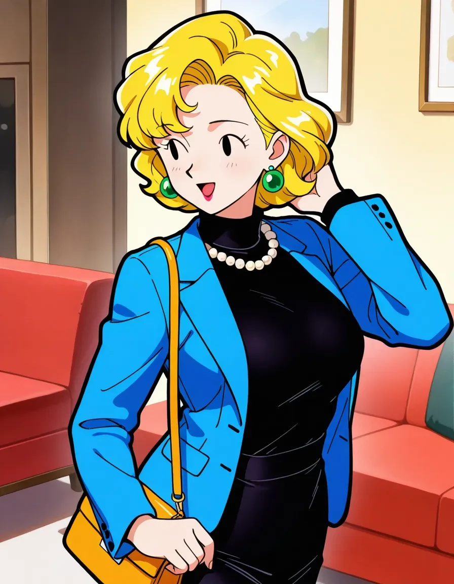 rectangular earrings,green earrings,blue jacket,,long sleeves,black dress,tight dress,pencil skirt,blue pumps,pearl necklace,