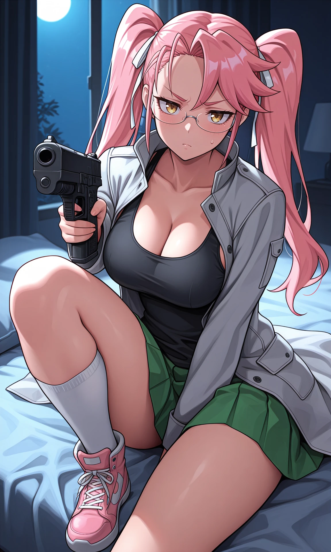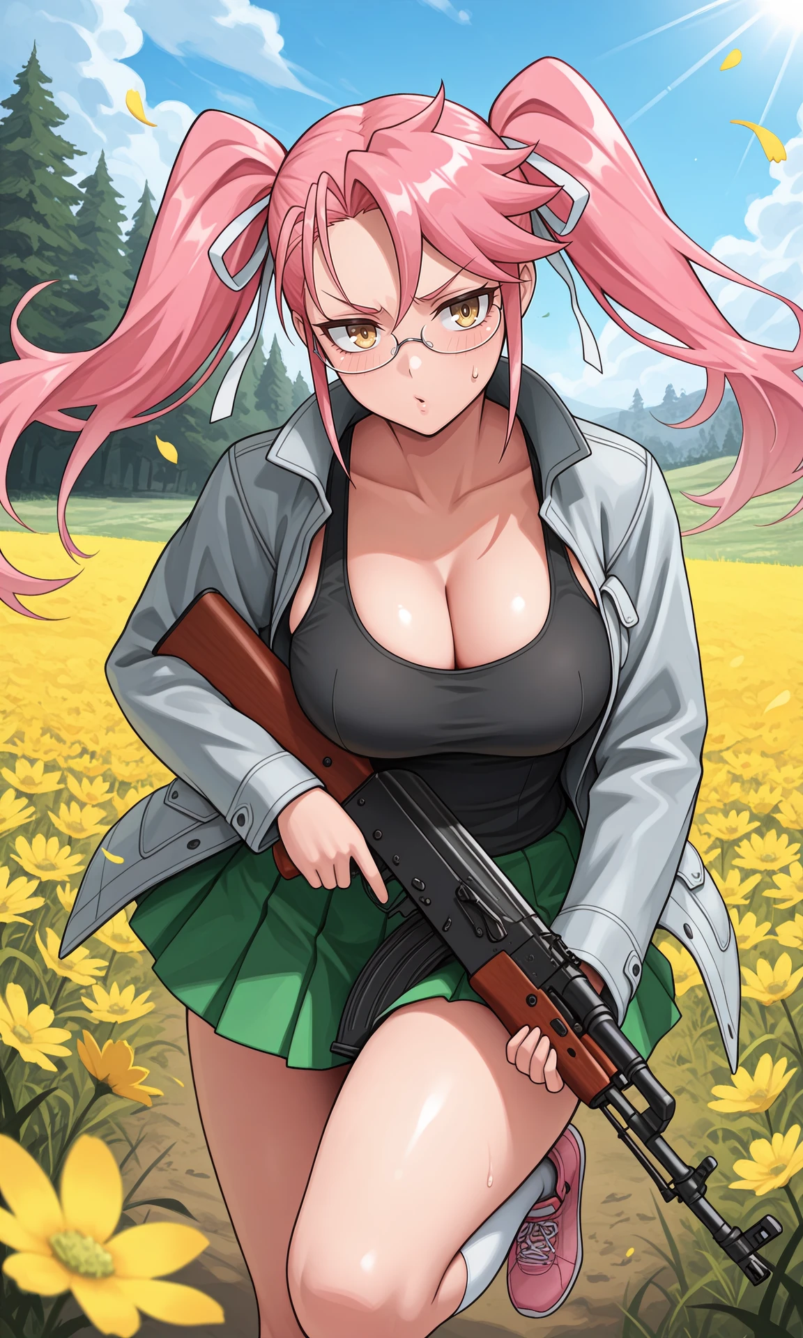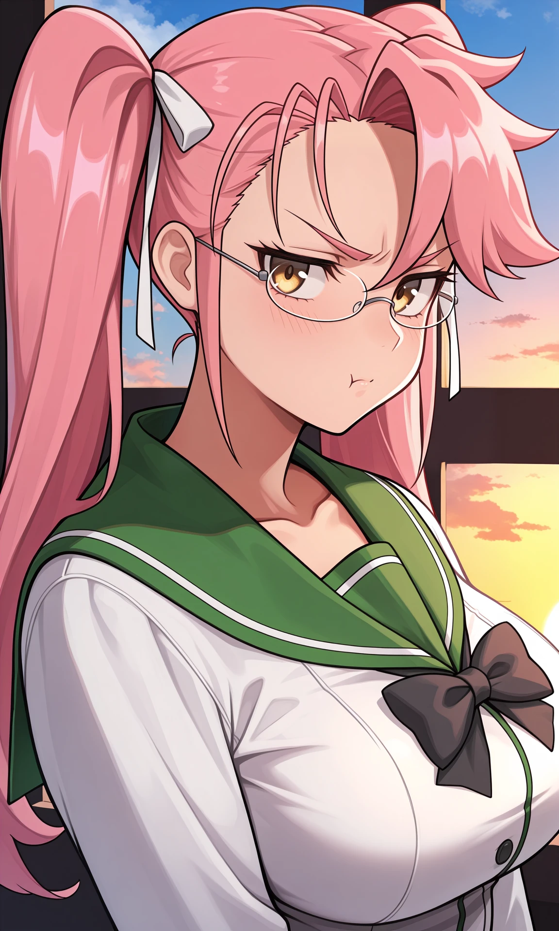 tkgsy, yellow eyes, pink hair, long hair, twintails, side part, sidelocks, asymmetrical bangs, hair ribbon, white ribbon, rimless eyewear, glasses, school uniform, serafuku, green sailor collar, large breasts, two-tone shirt, white shirt, green shirt, buttons, black bowtie, long sleeves, green skirt, pleated skirt, miniskirt, white socks, kneehighs, pink footwear, sneakers, converse,