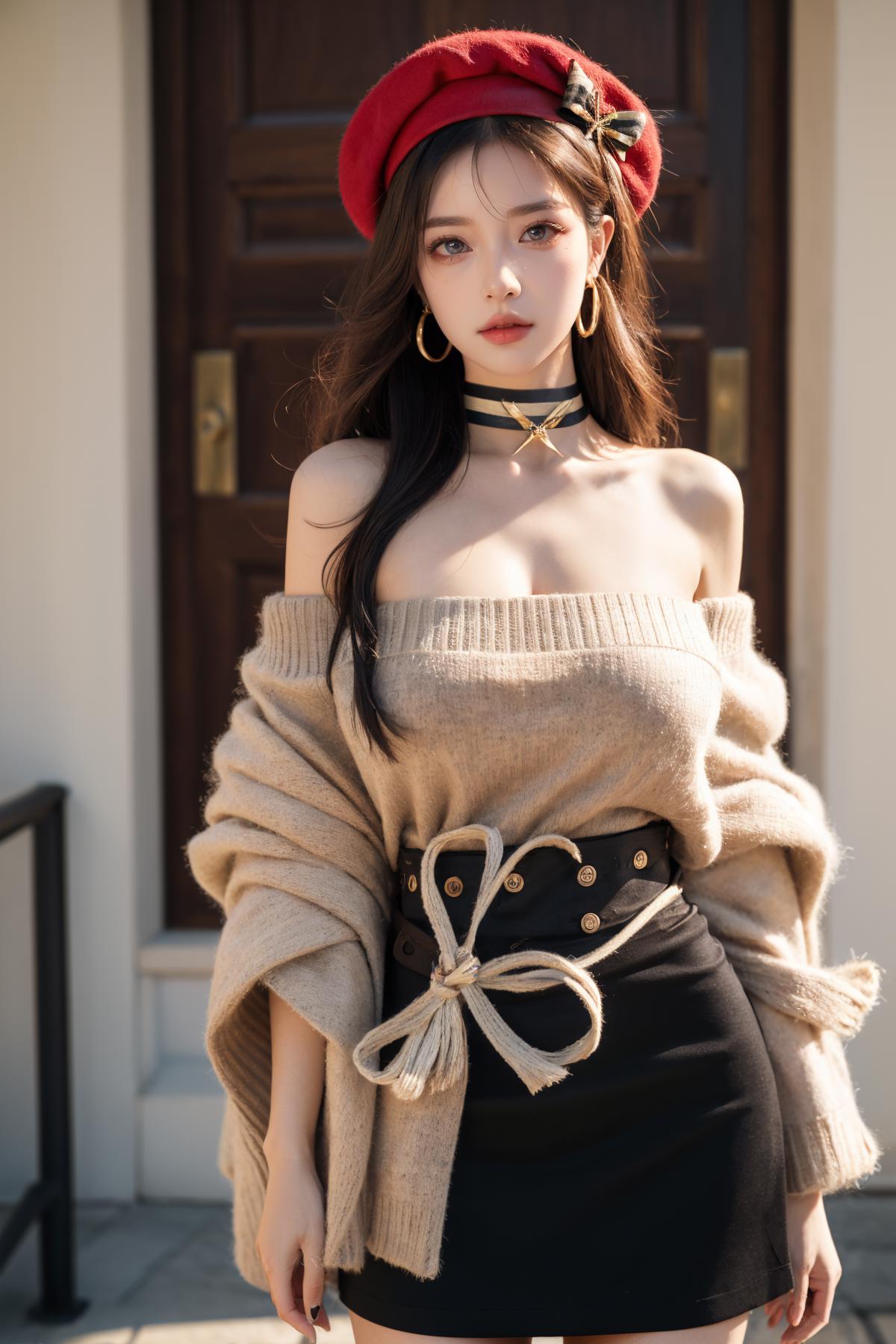 outfit6aabelfast, long hair, beret, red headwear, hat bow, hoop earrings, choker, collarbone, cleavage, off-shoulder cable knit, sweater, brown sweater, long sleeves, red shawl, white ribbon, black skirt, black pantyhose