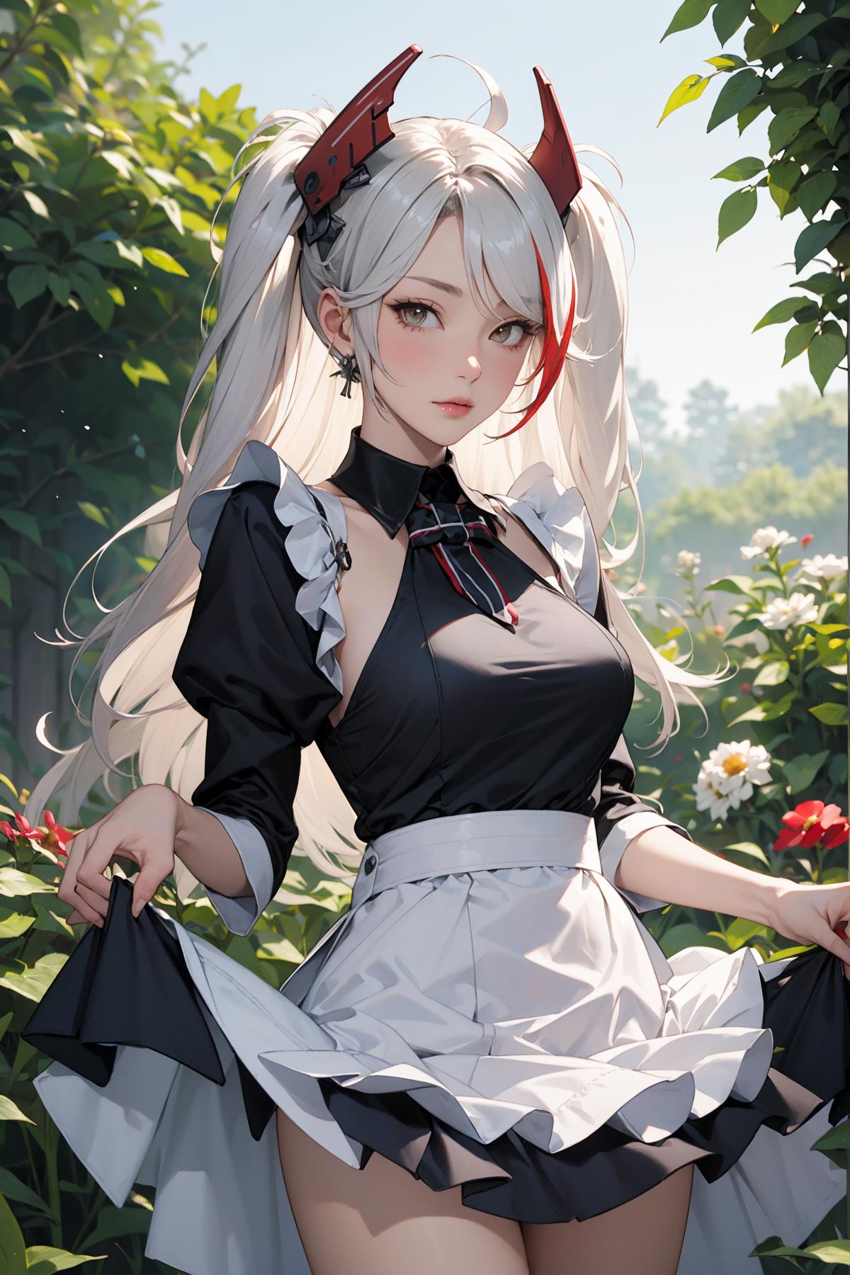outfit1aabelfast, long hair, french braid, maid headdress, collar, chain, collarbone, cleavage, frills, maid, sleeveless, elbow gloves, white gloves, white apron